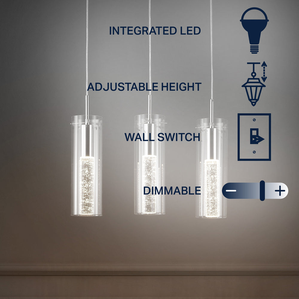 This modern pendant light brings together a unique mix of transitional and glam design. The three glass cylinders hang in a row, creating a contemporary element of interest. Its unique structure and dynamic design will bring an unmatched elevation for any dining room and kitchen island it's on.