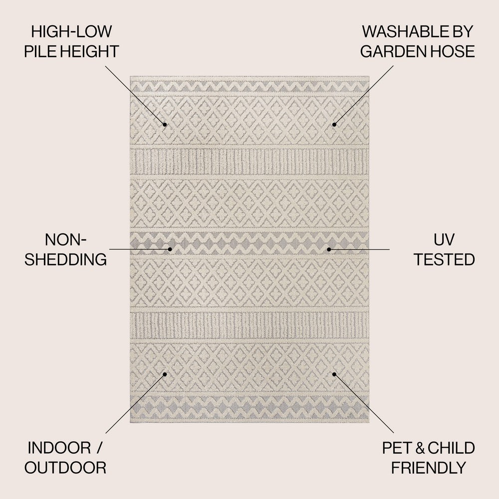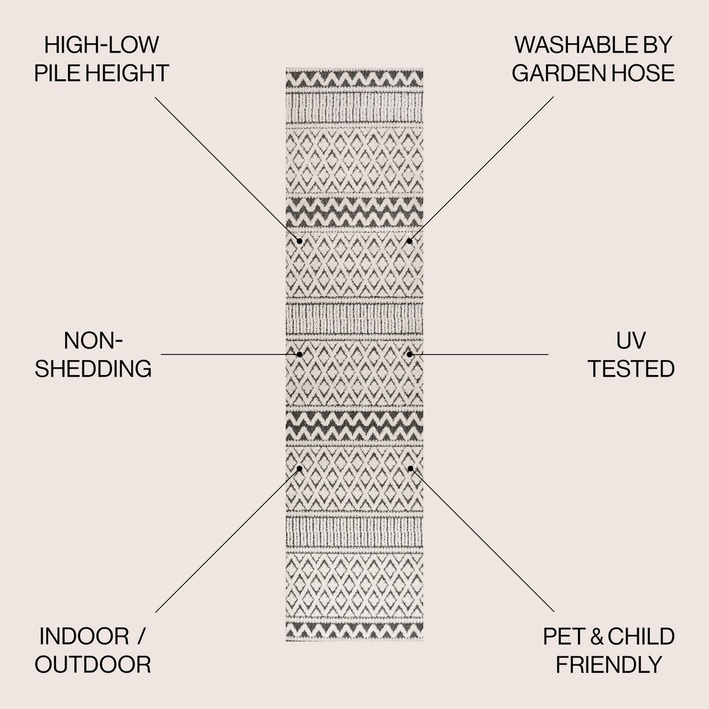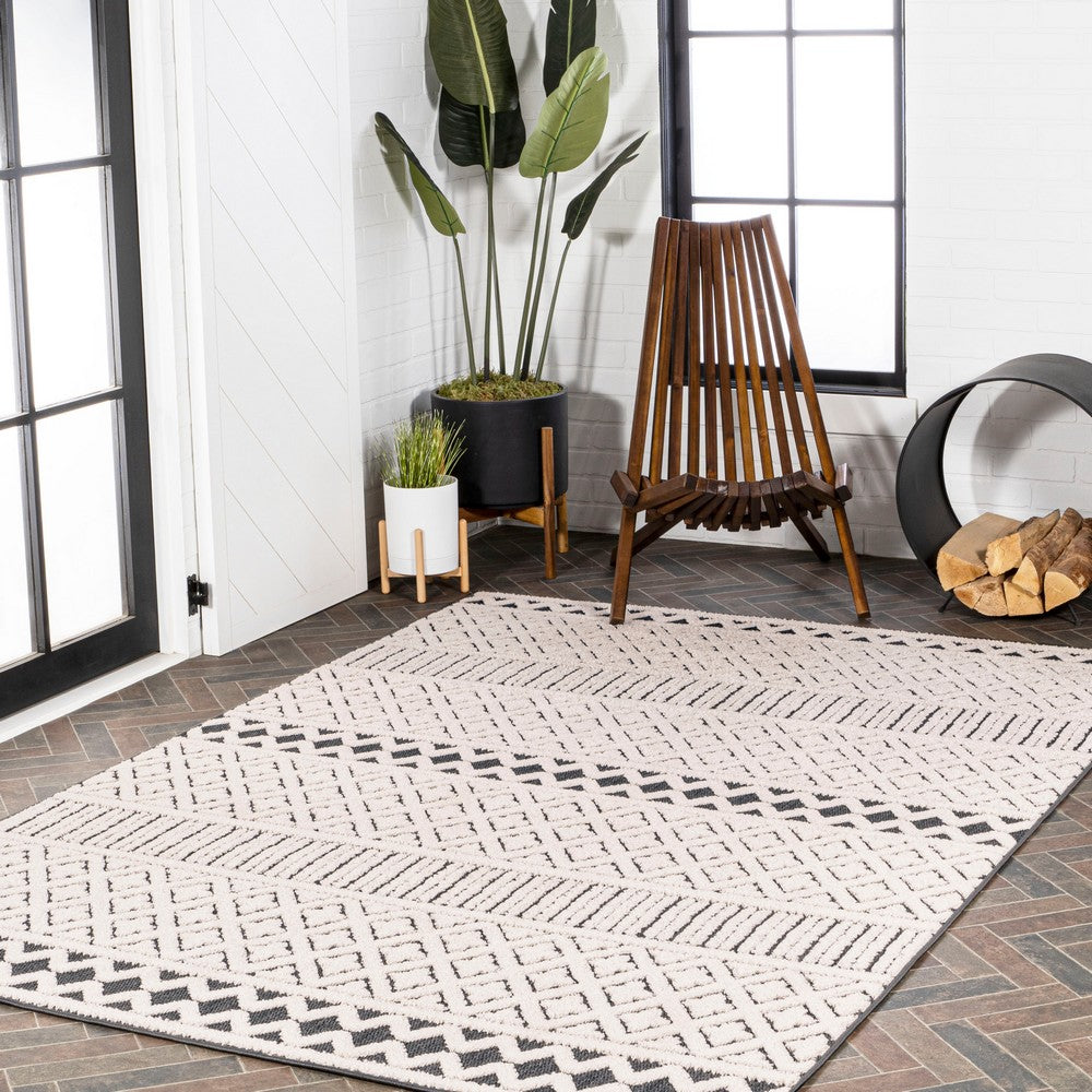 Inspired by Moroccan tribal designs, our modern geometric rug adds graphic punch to almost any space, indoors or out. The two-tone, family-friendly design is a smart addition to your living room, dining room, bedroom, porch or patio. Made from pet-friendly synthetic fibers, this rug is easy to clean.
