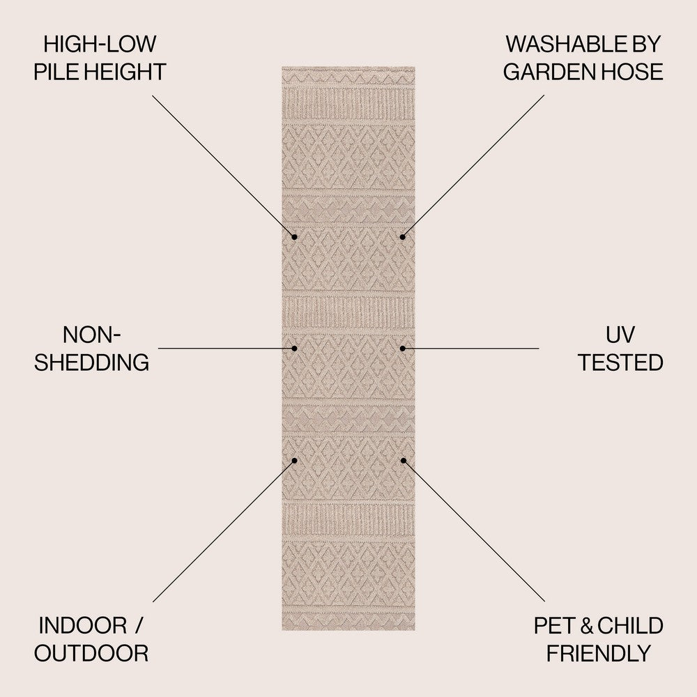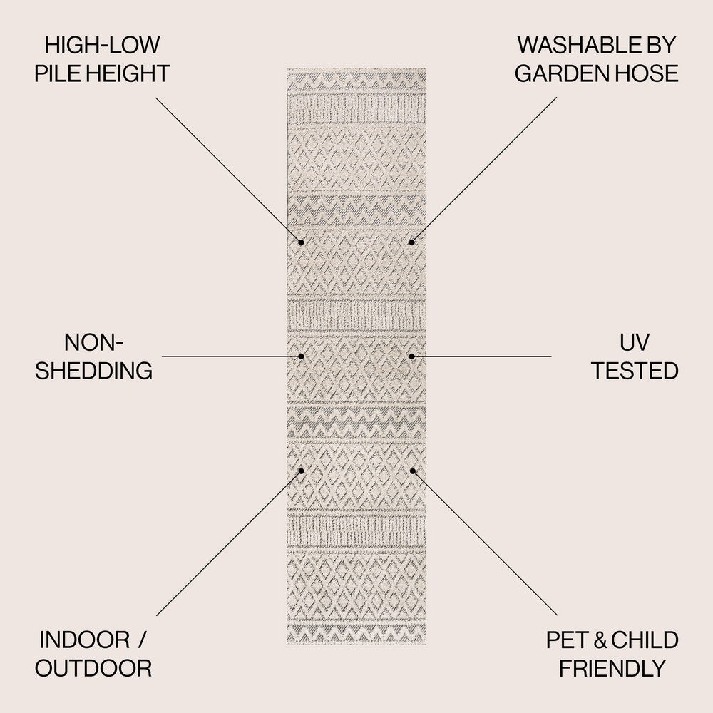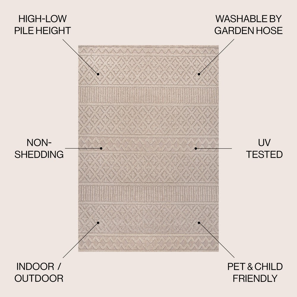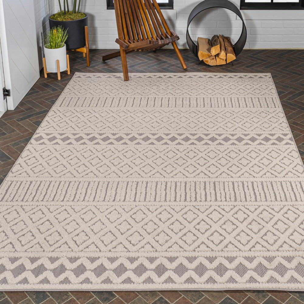 Inspired by Moroccan tribal designs, our modern geometric rug adds graphic punch to almost any space, indoors or out. The two-tone, family-friendly design is a smart addition to your living room, dining room, bedroom, porch or patio. Made from pet-friendly synthetic fibers, this rug is easy to clean.