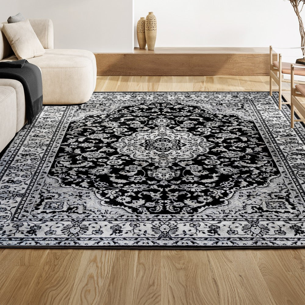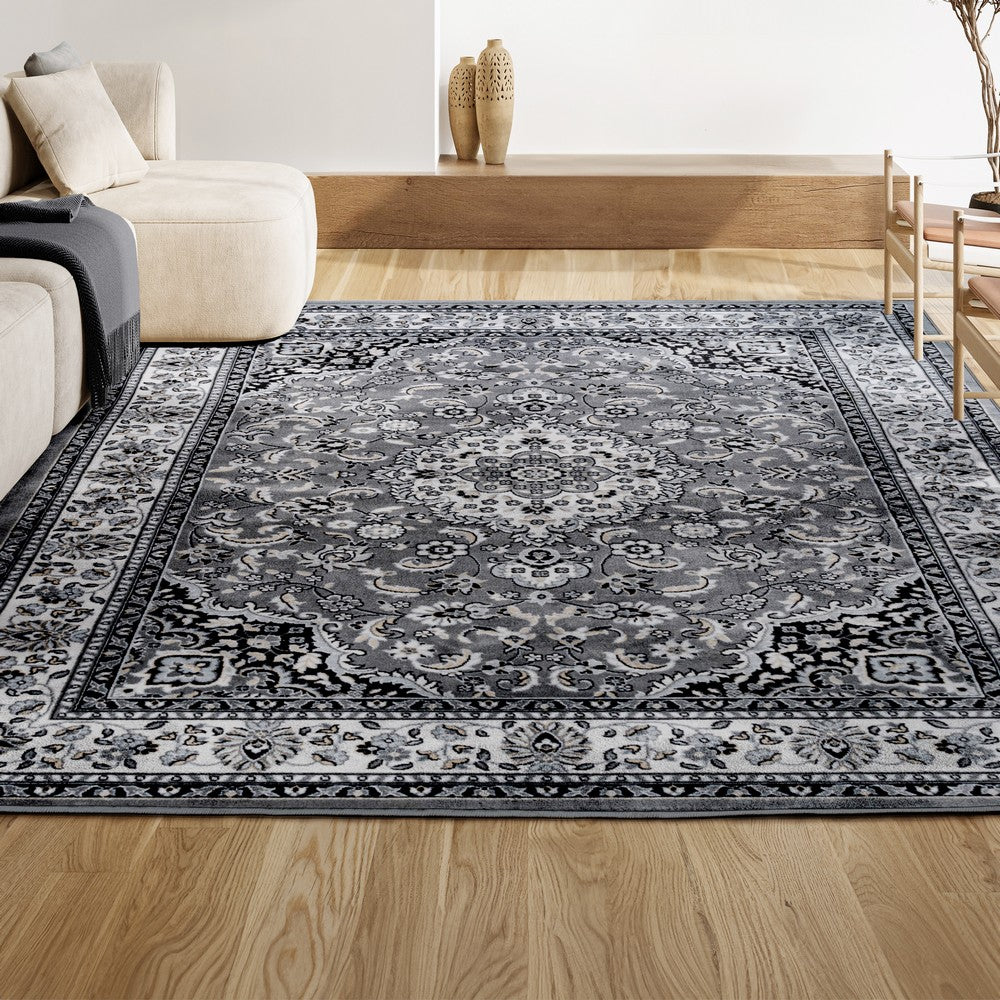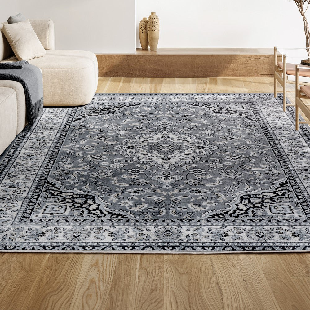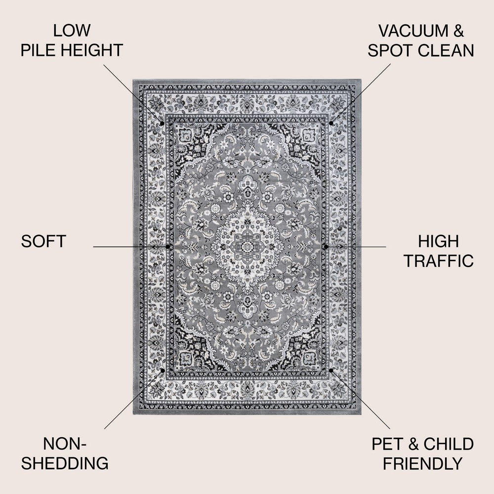 A classic medallion design gets a modern makeover in our Persian-style gray rug. The ornate pattern features a central field with traditional leaves and flowers, and an ivory palmette border. Add a neutral touch to your living room, family room, bedroom, dining room, or home office with this durable, family-friendly rug.