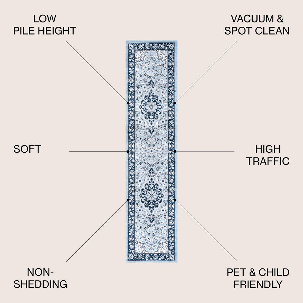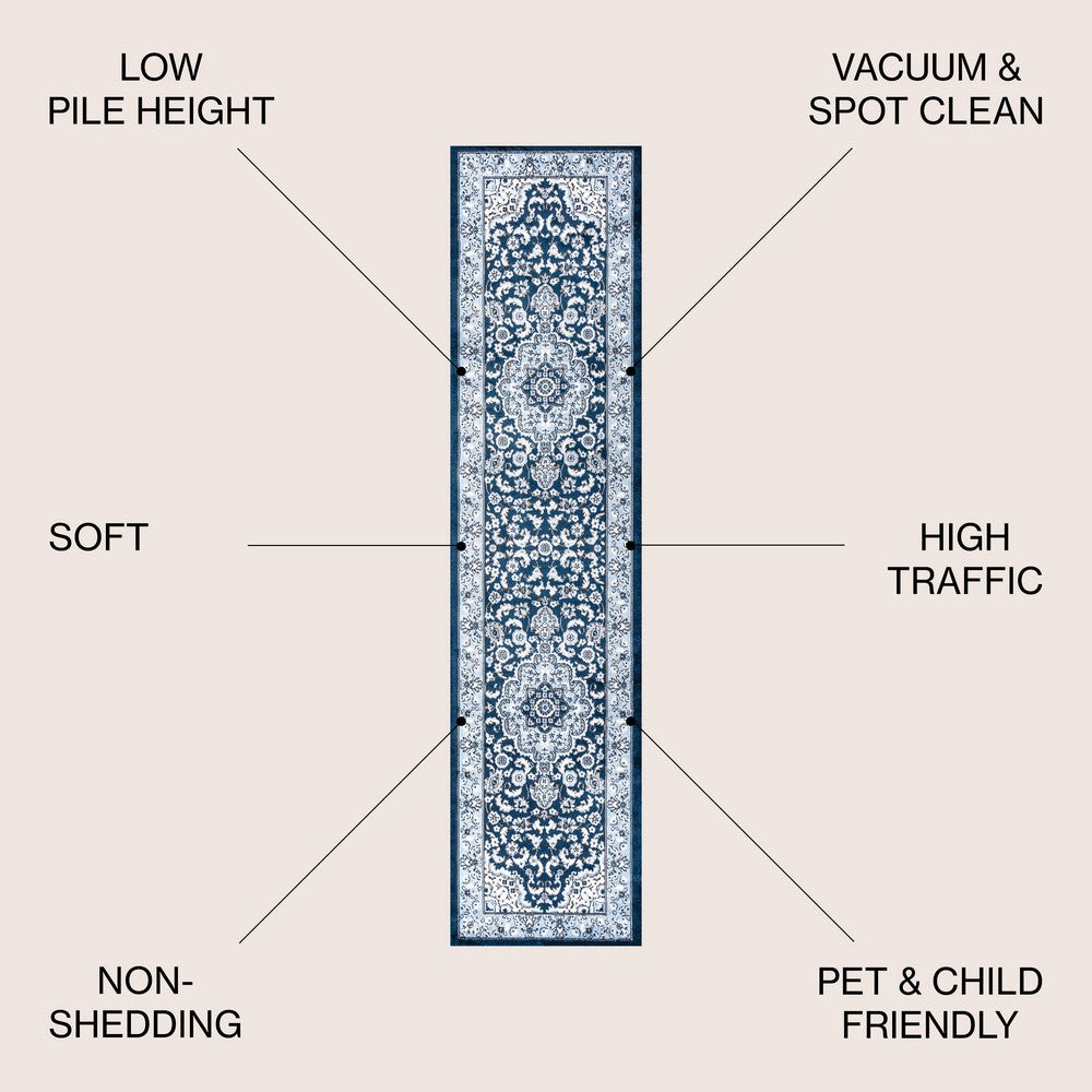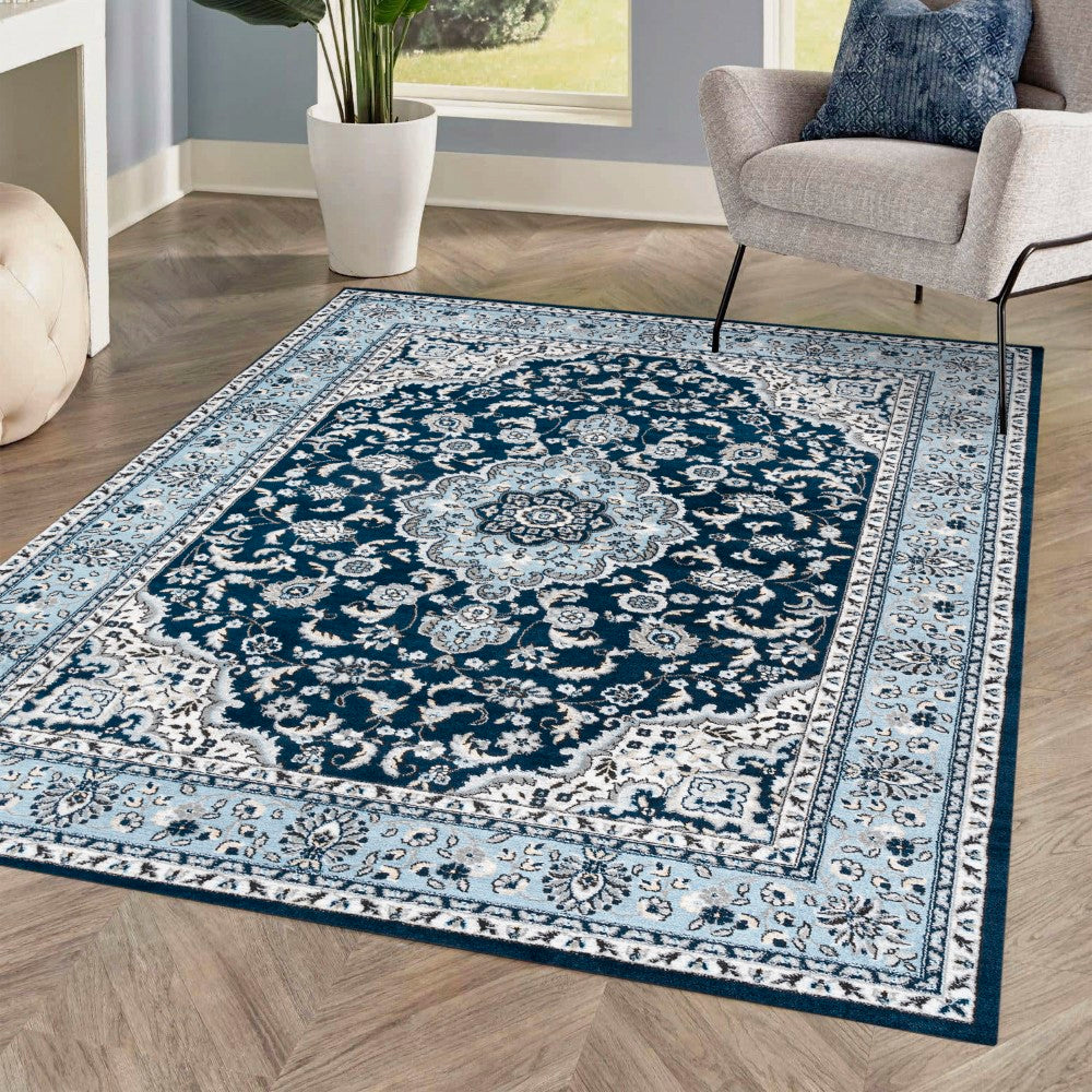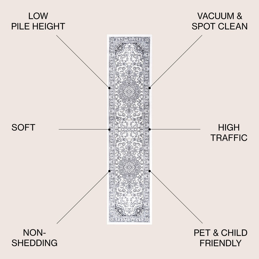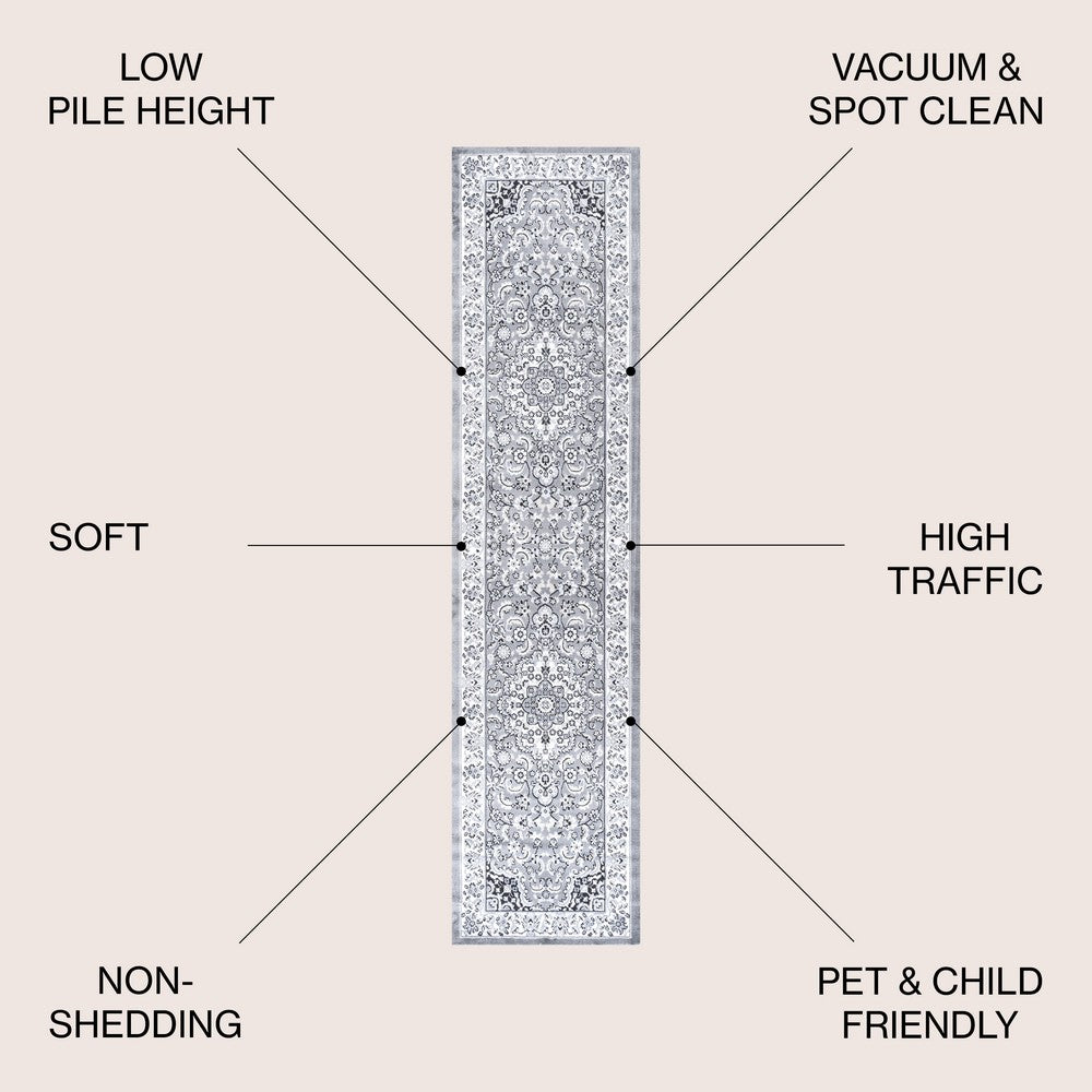 A classic medallion design gets a modern makeover in our Persian-style gray rug. The ornate pattern features a central field with traditional leaves and flowers, and an ivory palmette border. Add a neutral touch to your living room, family room, bedroom, dining room, or home office with this durable, family-friendly rug.