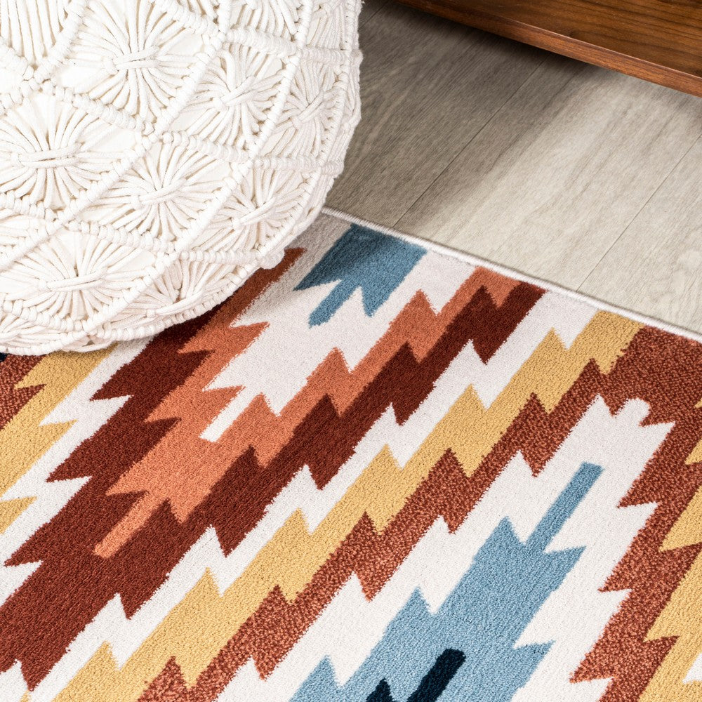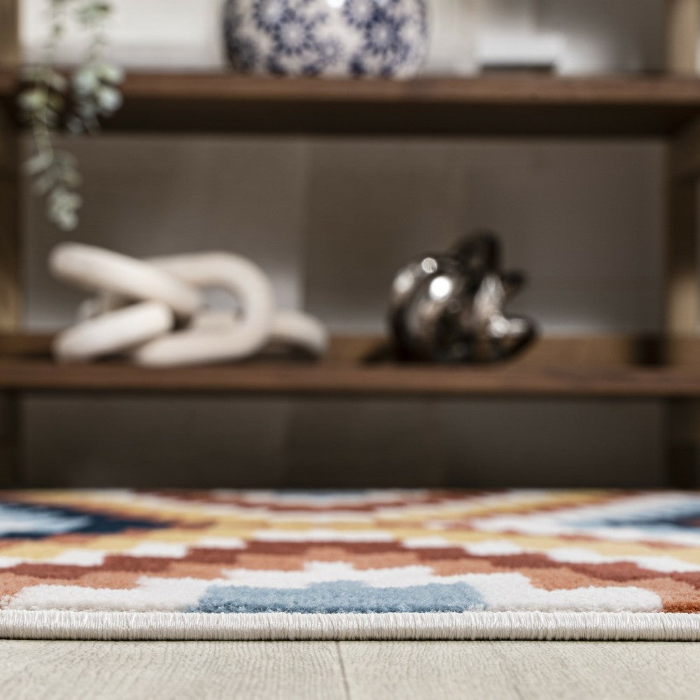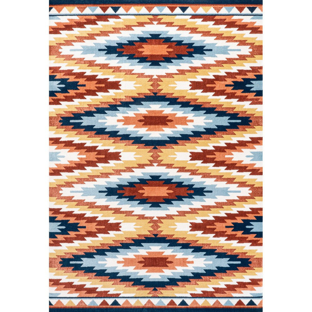 Medallion patterns are popular in Southwestern and kilim rug designs; our geometric rug features them in a modern, bold color palette. Add graphic punch to your living room, dining room, entry, or bedroom with our busy, family-friendly design. Made from pet-friendly synthetic fibers, this rug is easy to clean.