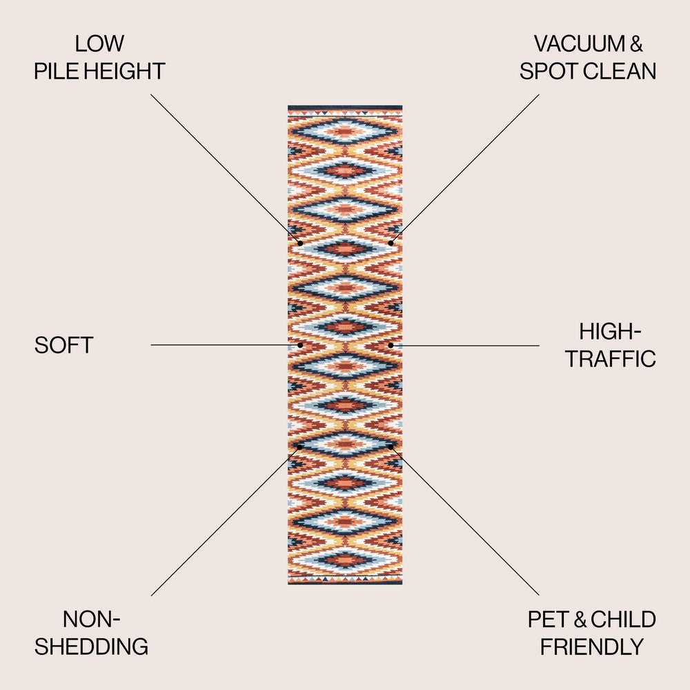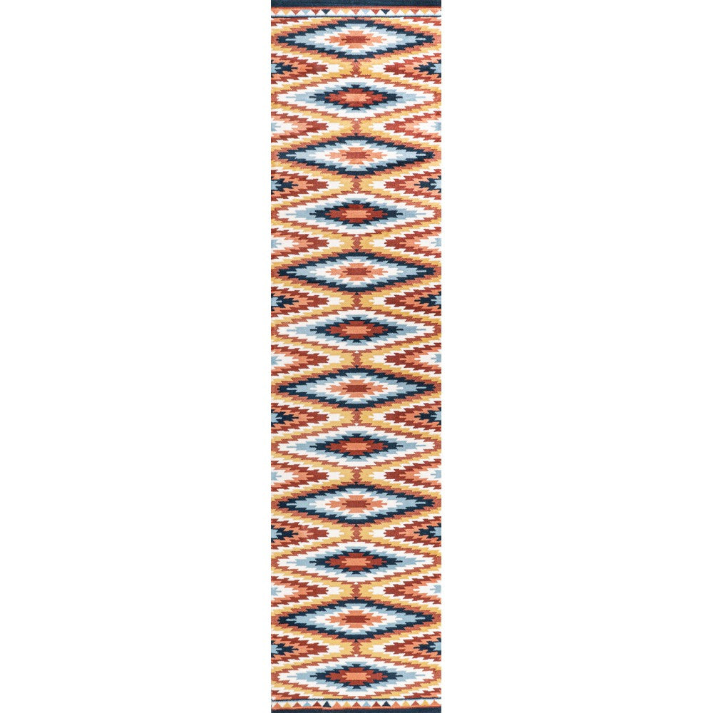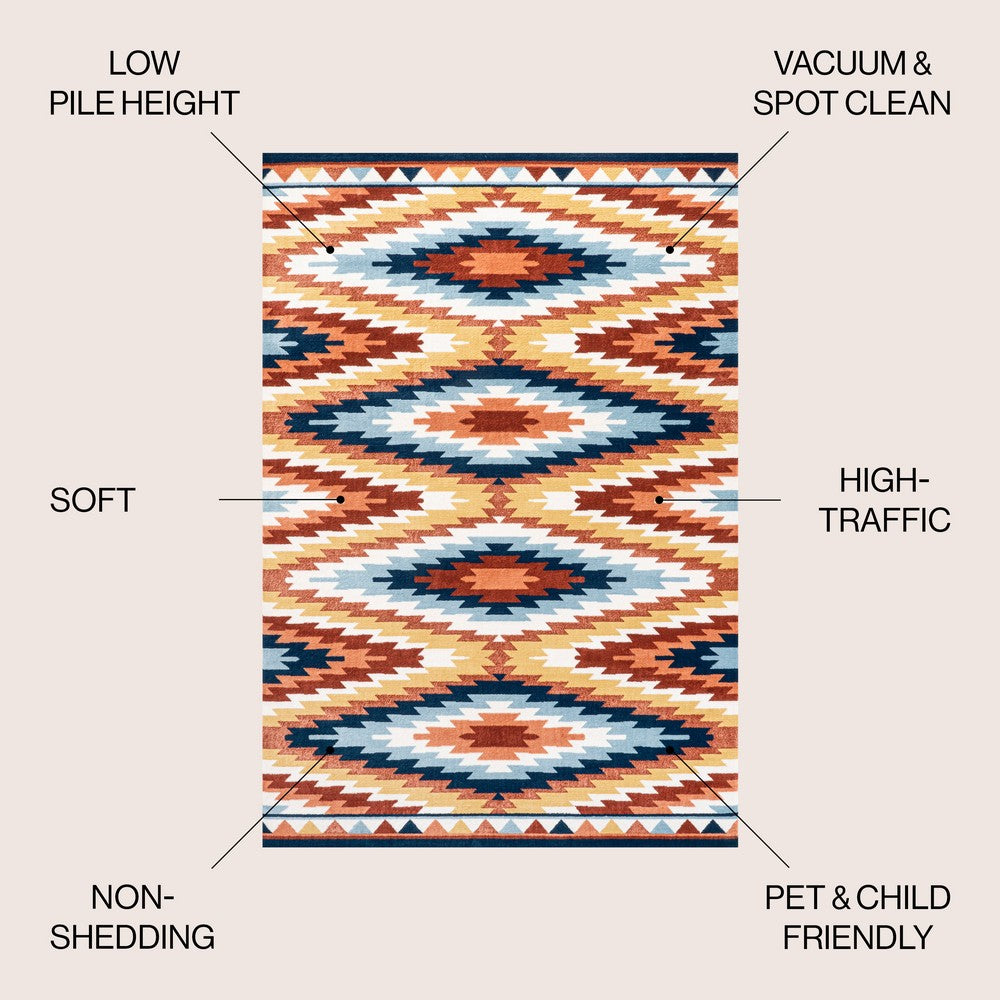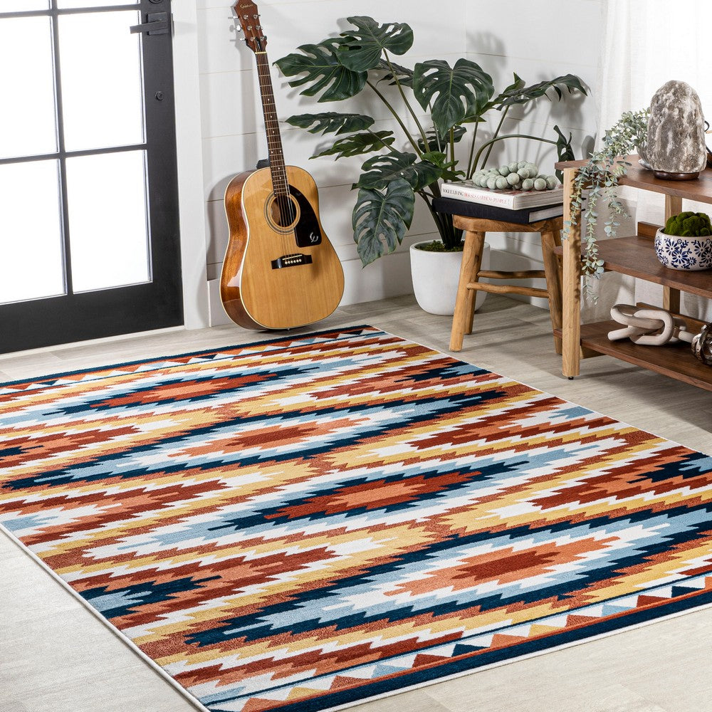 Medallion patterns are popular in Southwestern and kilim rug designs; our geometric rug features them in a modern, bold color palette. Add graphic punch to your living room, dining room, entry, or bedroom with our busy, family-friendly design. Made from pet-friendly synthetic fibers, this rug is easy to clean.