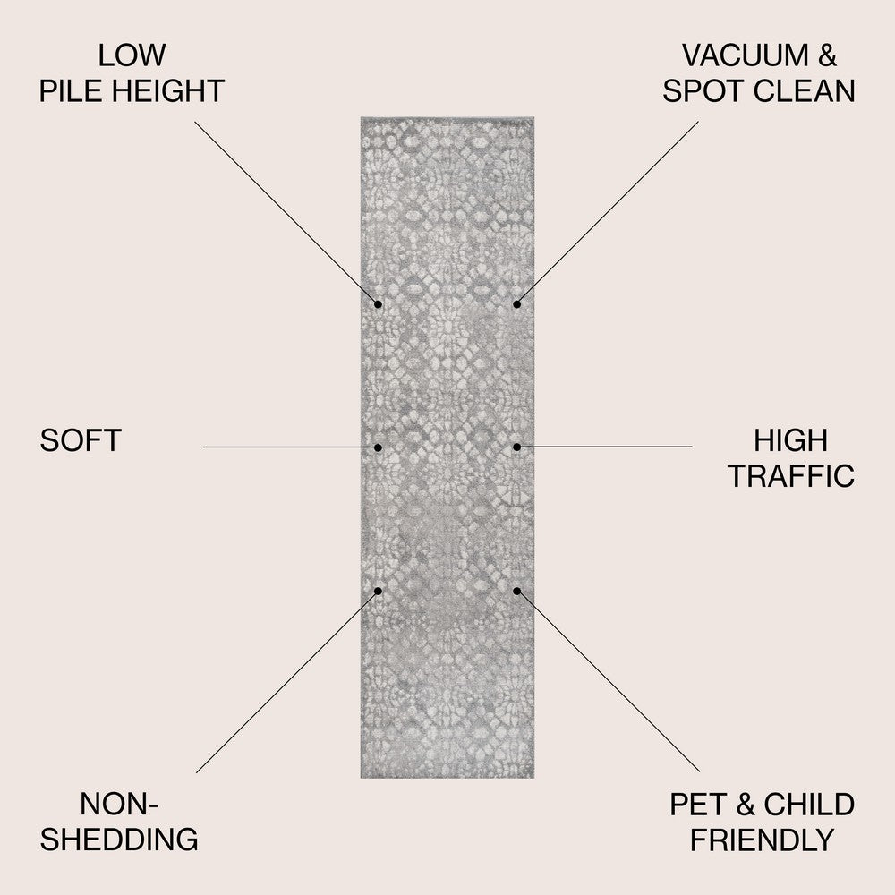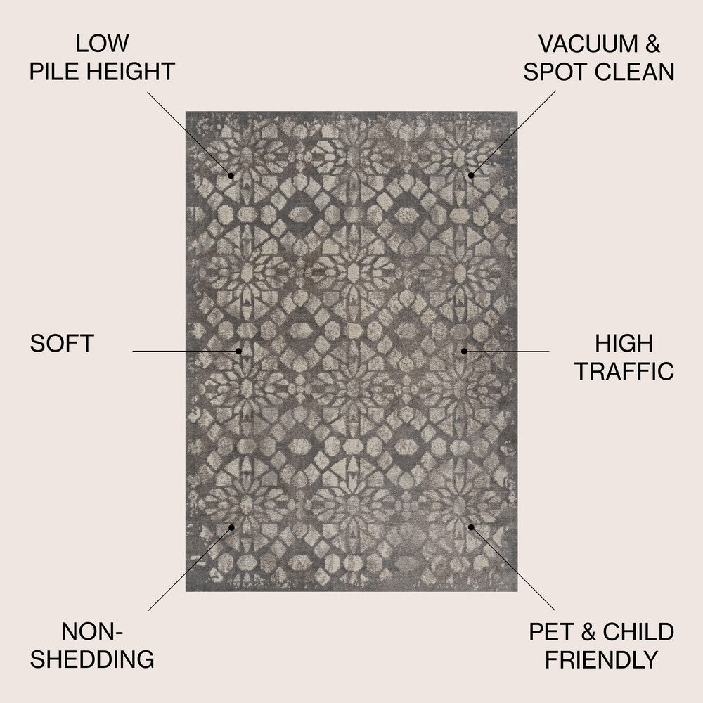 Inspired by the tile floors of Italy and Morocco, this rug's modern, neutral design adds rich pattern underfoot. The stylish geometric trellis is accented by ornate medallions, woven in ivory on a gray background. Whether your style is contemporary or traditional, this rug adds impact to a living room, dining room or bedroom. The easy-care, all-over design is perfect for busy families.
