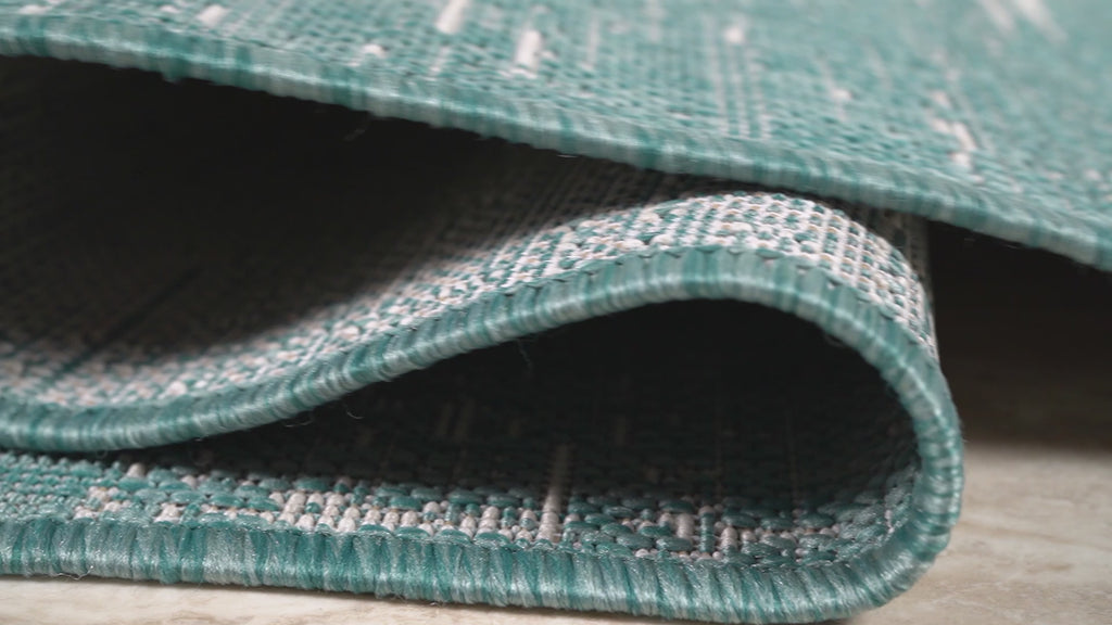 A simple ivory border is woven with a strie' effect on this seafoam aqua geometric rug. This versatile rug's minimalist look is perfect for a coastal cottage or modern outdoor patio. The solid, plain design is a family-friendly solution for a Scandinavian style living room, modern bedroom, kitchen hallway, entry or kids bedroom. The pet-friendly and kid-proof flatweave design makes it easy to clean, and perfect for the beach house.