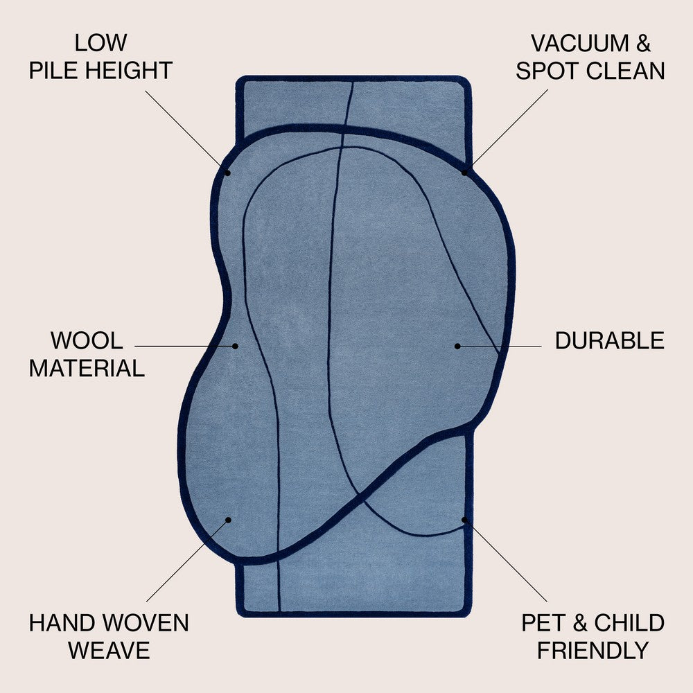 - The rug's light blue base is complemented by a navy border and abstract lines, amplifying its contemporary design