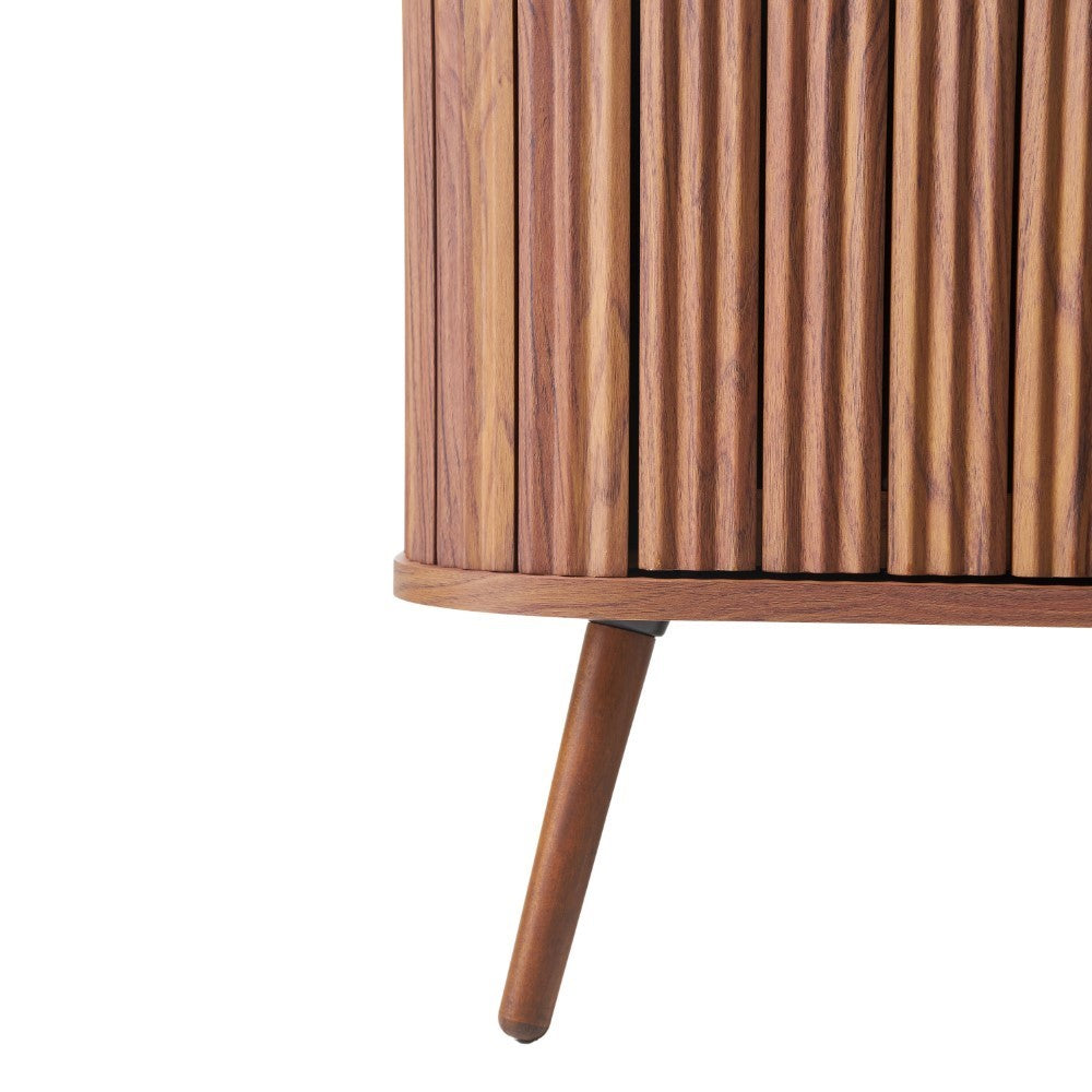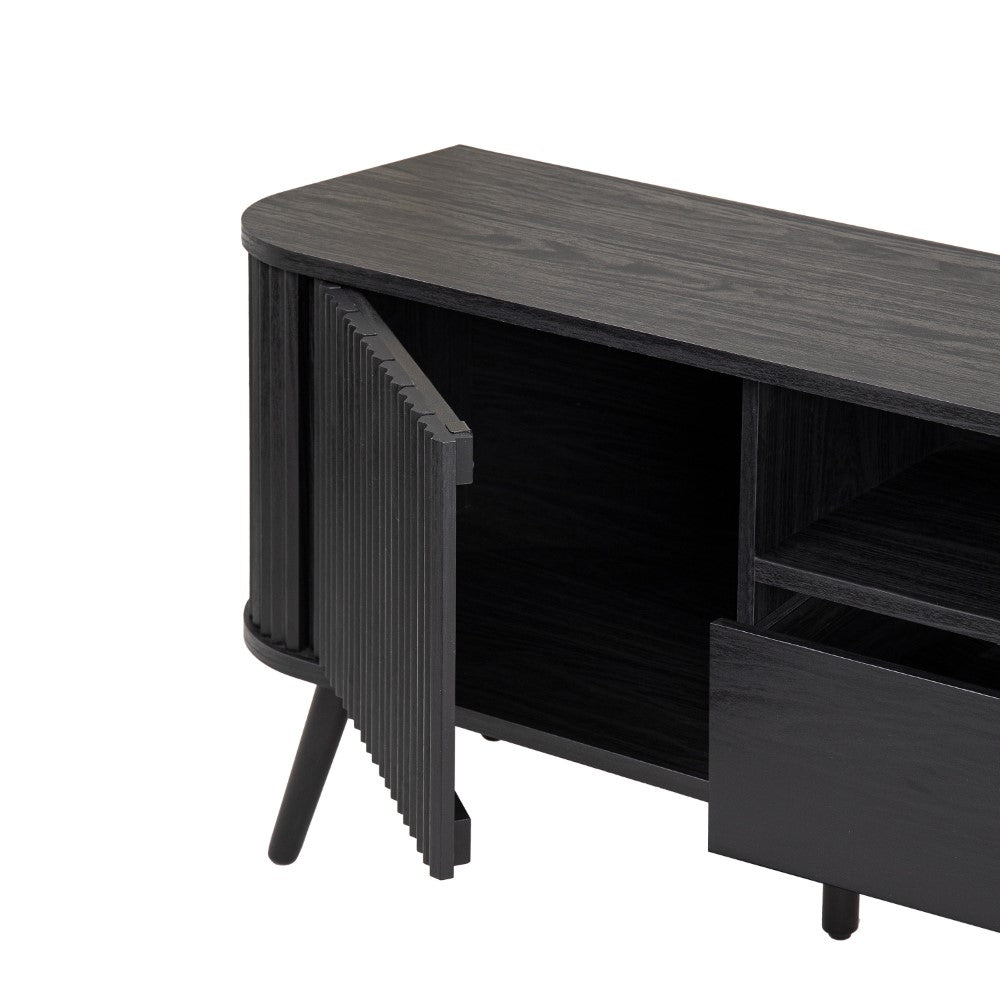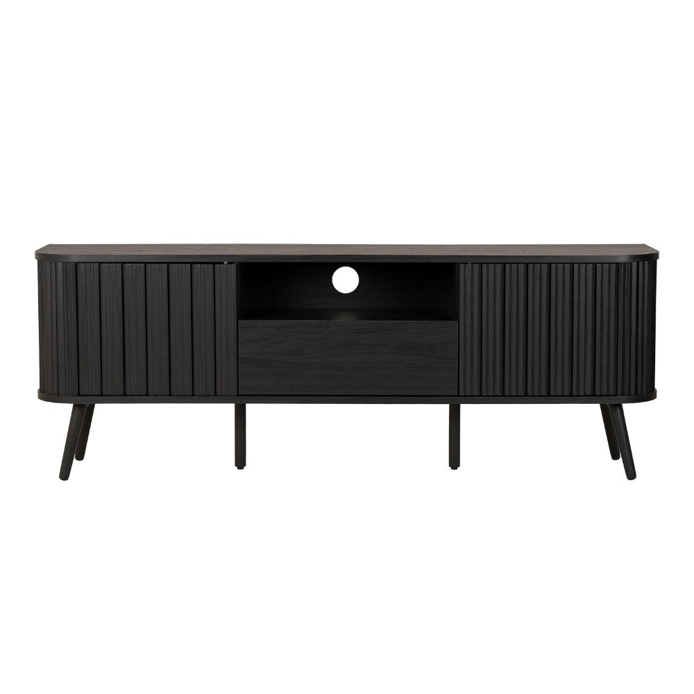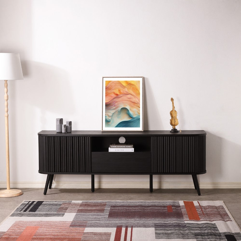 Bring an art deco flare to your TV room with this unique D-shaped curved console. At 70 inches wide, this is the perfect console to anchor a 75" TV in your living room or den. This console complements any bohemian or contemporary home.