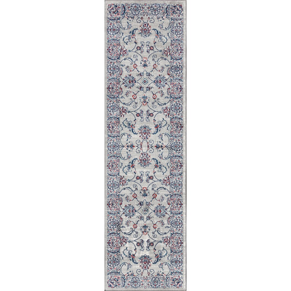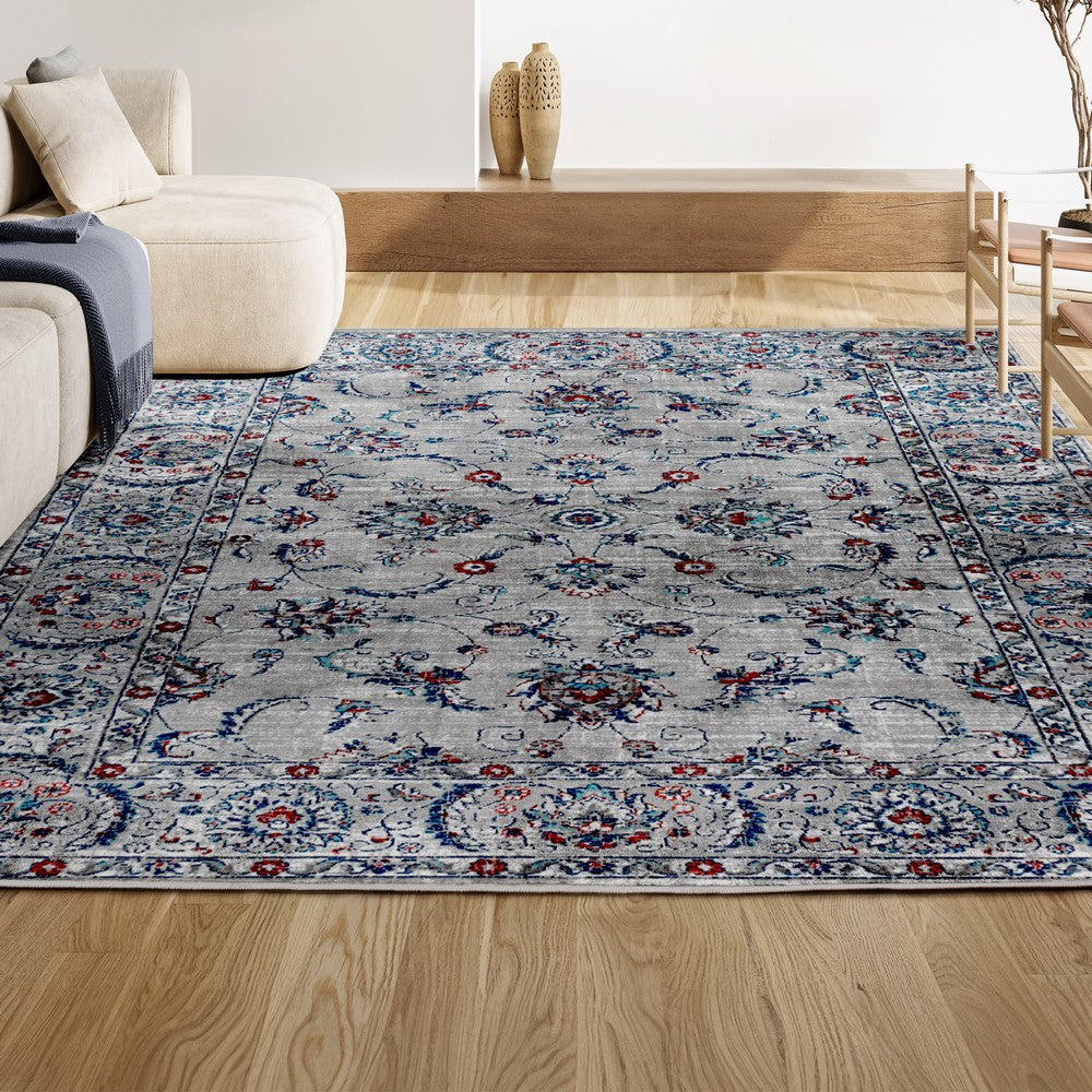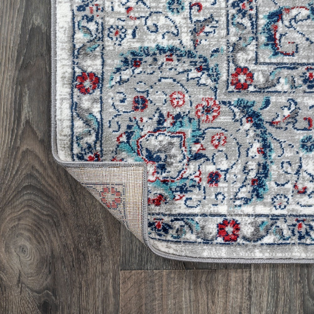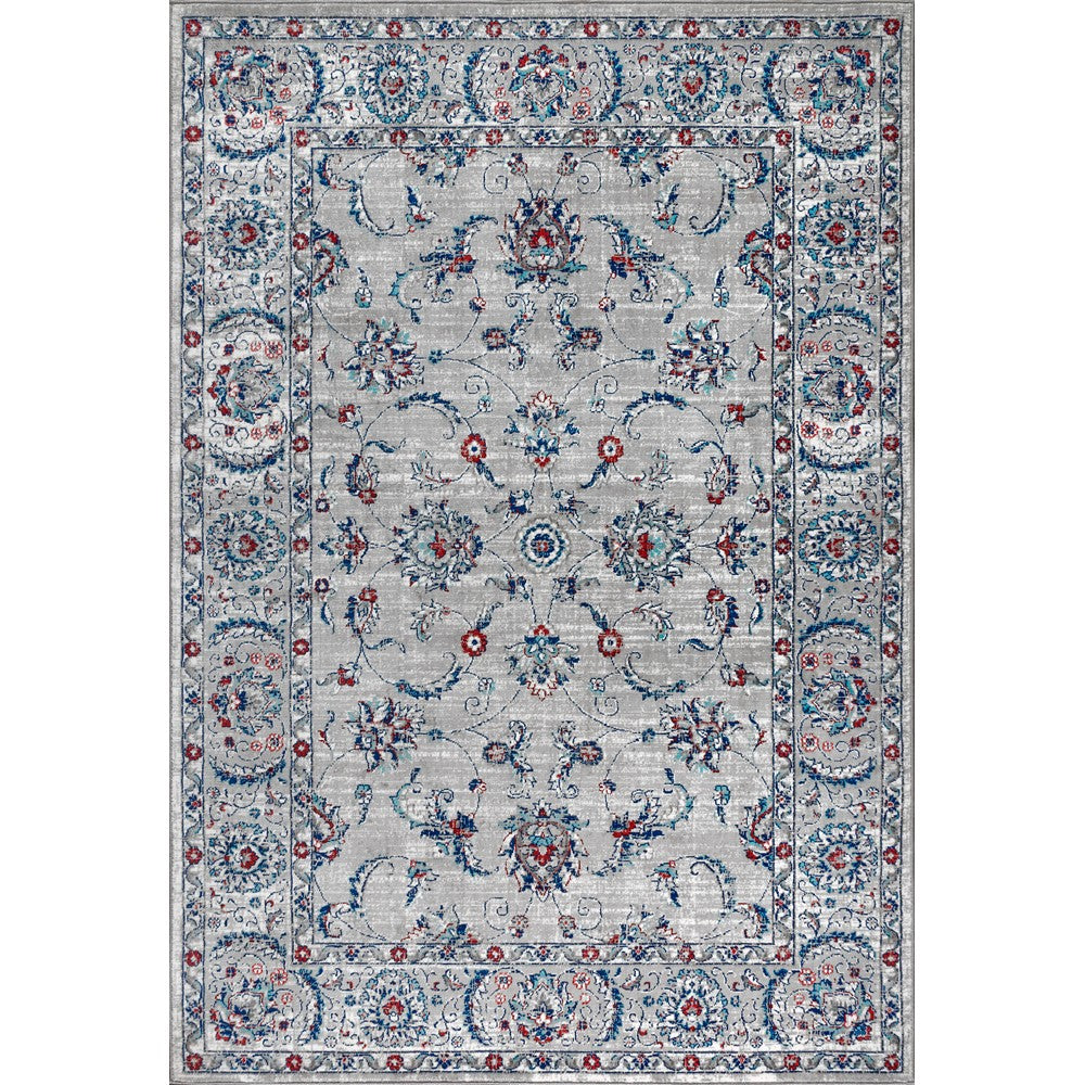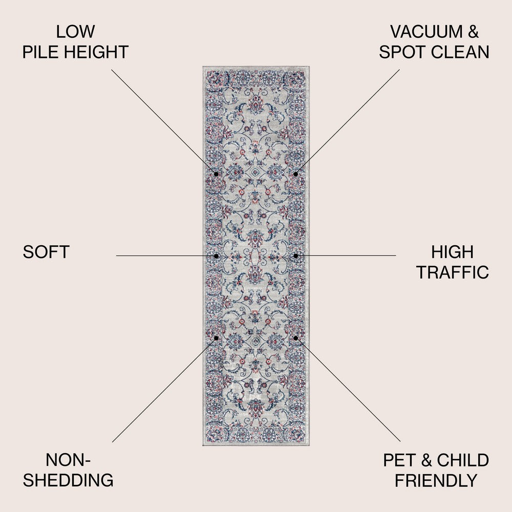 • The gray base is accented with notes of pink and blue throughout the Persian-inspired design
