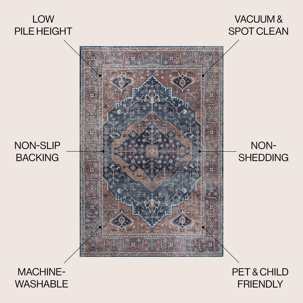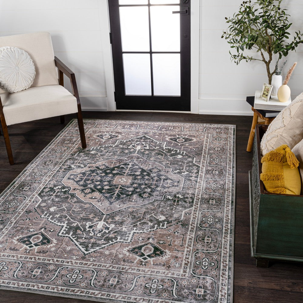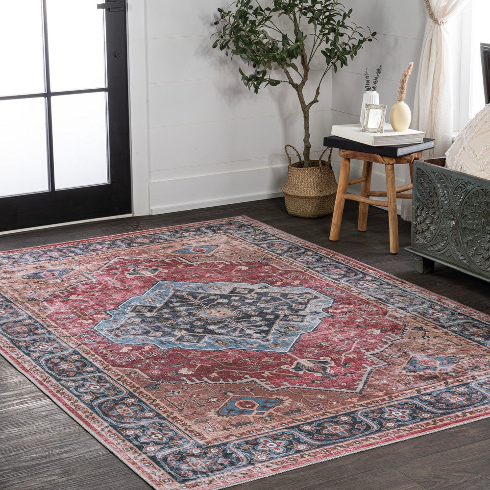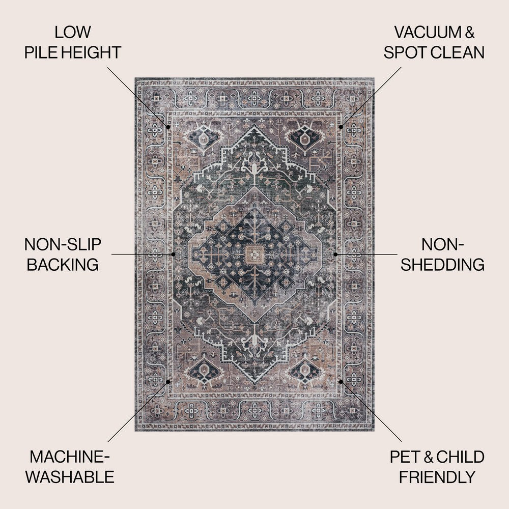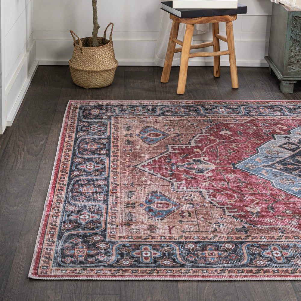 The ornate ogee medallion in the center of this rug recalls ancient Persian rug designs. Updated colors add a modern Bohemian-inspired twist to a classic design. With its pet-friendly pattern, this easy-care rug would be perfect for a dining room, living room, entry, bedroom or porch.