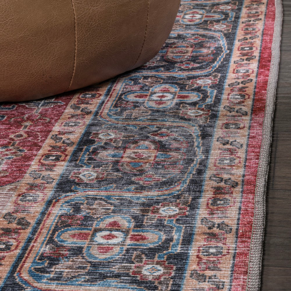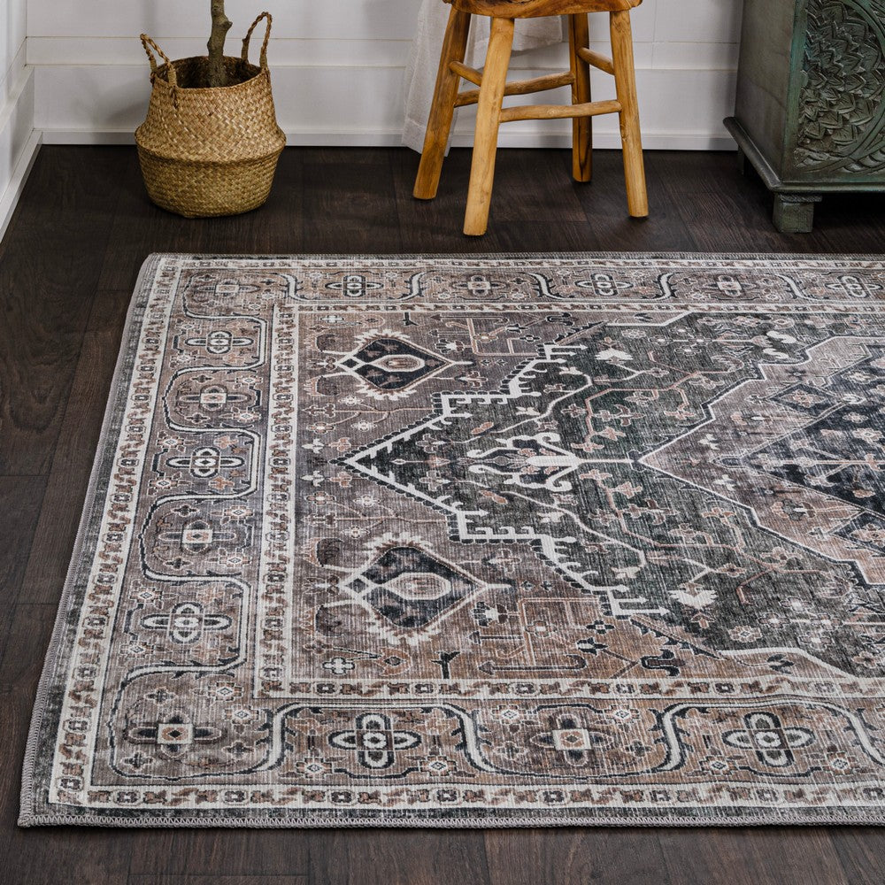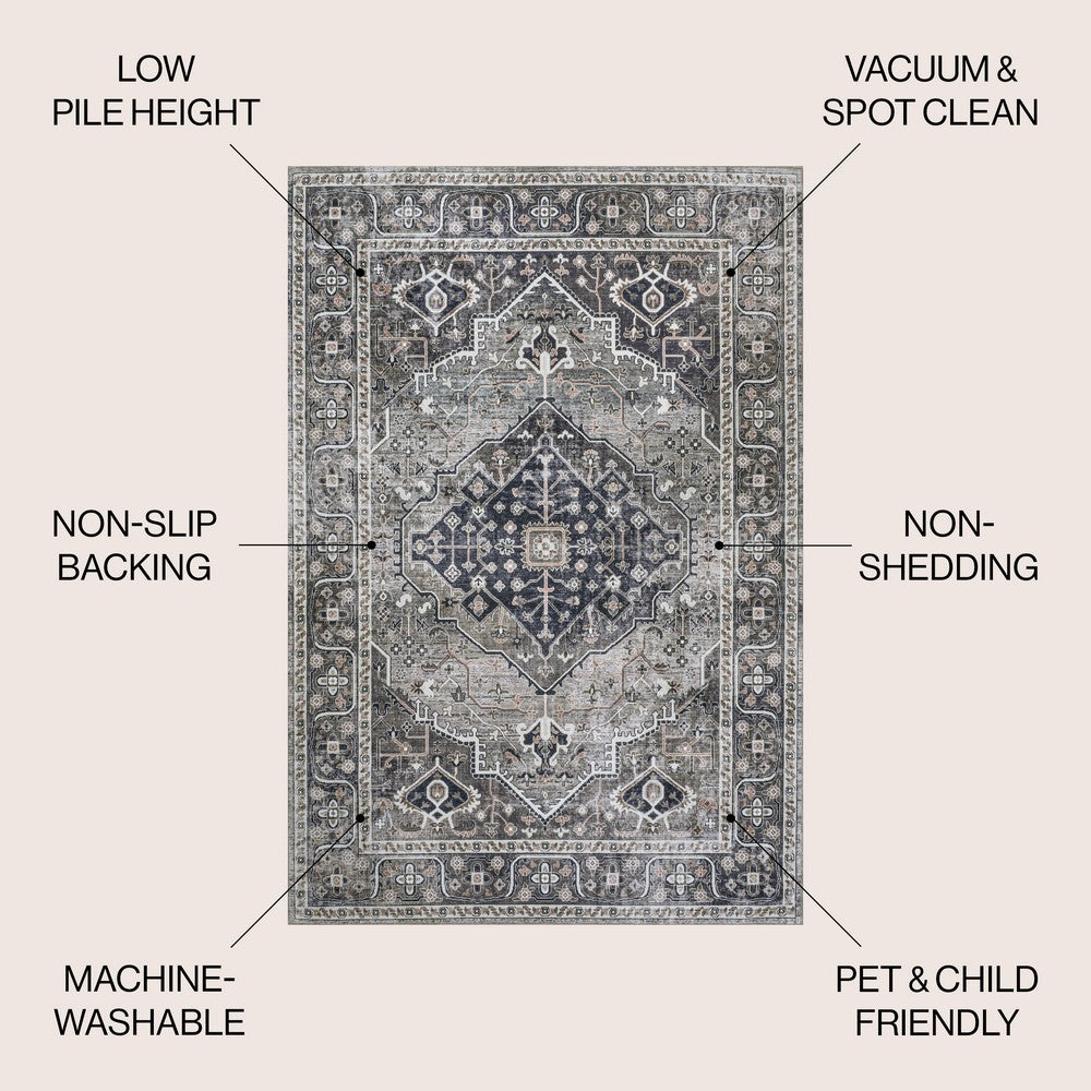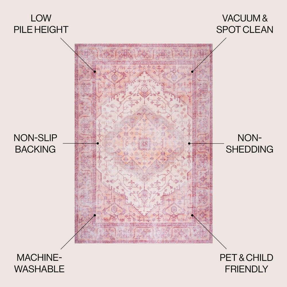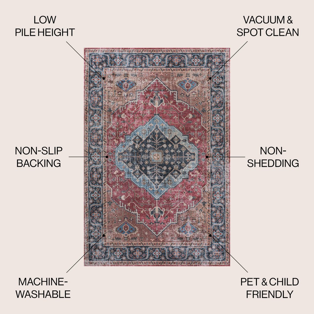 The ornate ogee medallion in the center of this rug recalls ancient Persian rug designs. Updated colors add a modern Bohemian-inspired twist to a classic design. With its pet-friendly pattern, this easy-care rug would be perfect for a dining room, living room, entry, bedroom or porch.