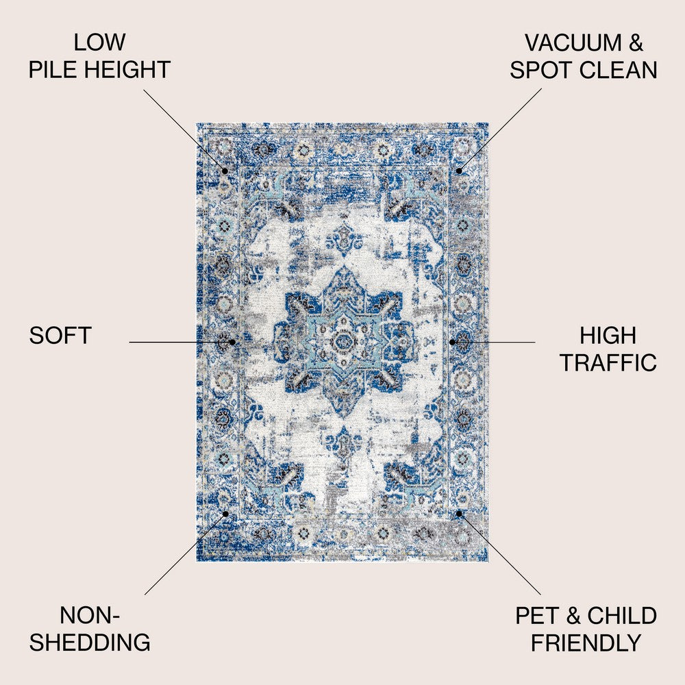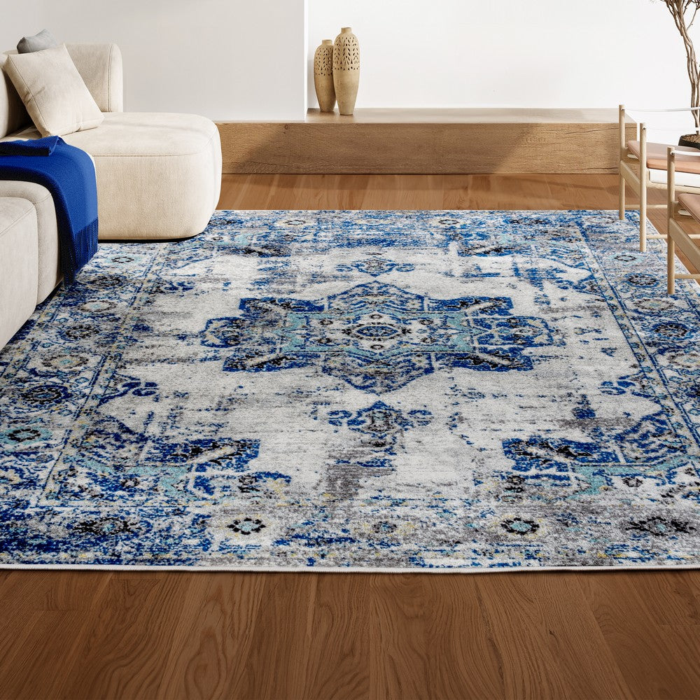 - Combining tones of blue, aqua and gray, this rug is a versatile addition to any color scheme