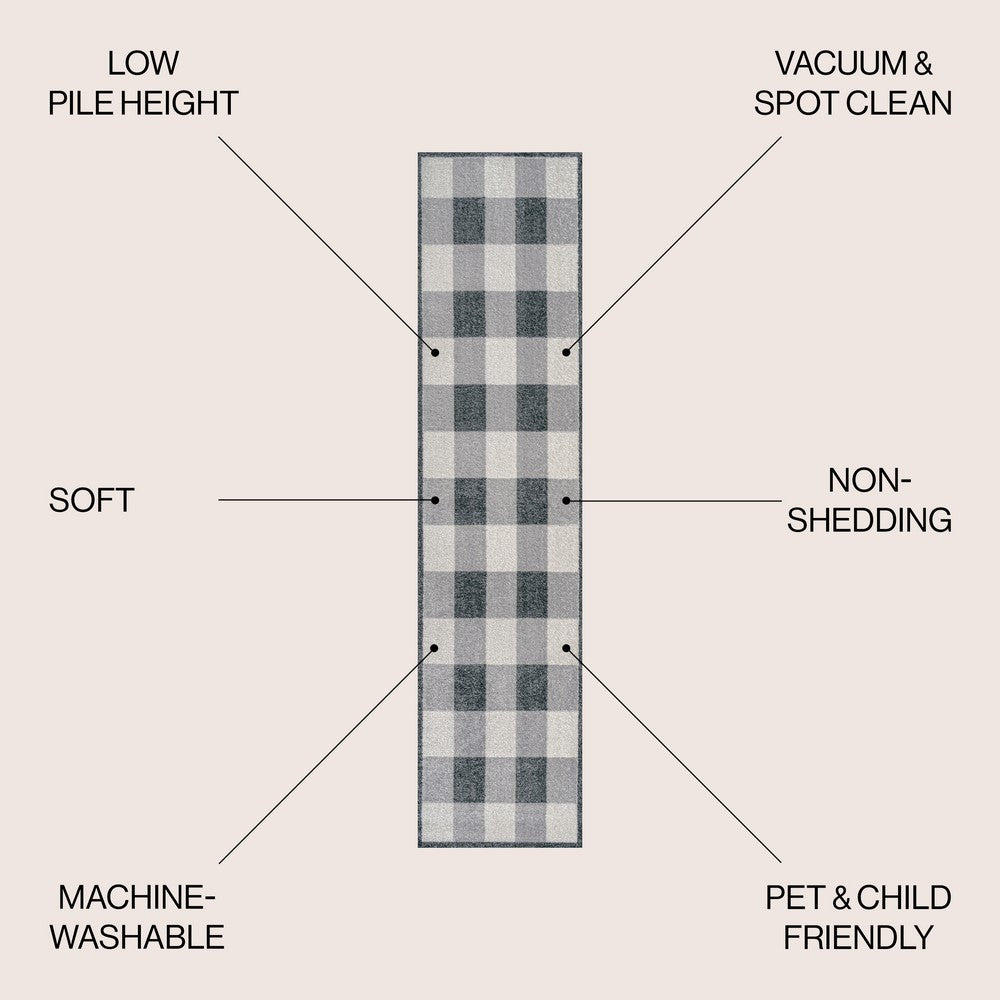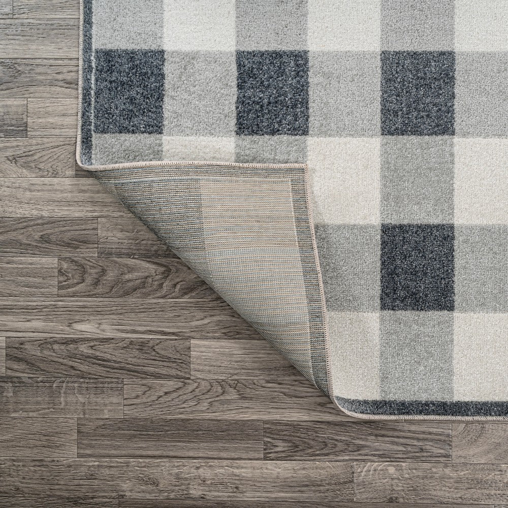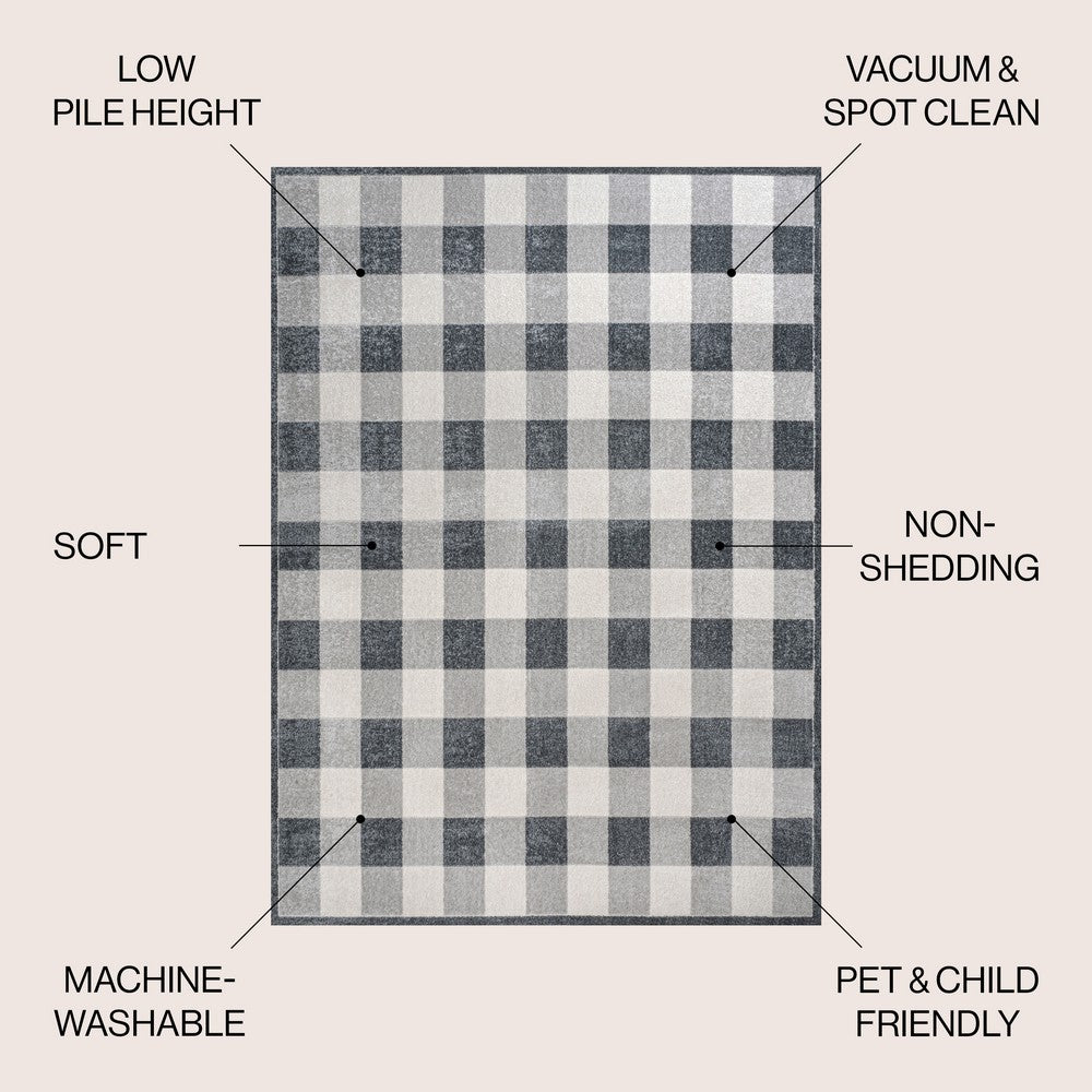 This washable rug features a classic plaid design. With its low pile and farmhouse style, our rug is ideal for any room in your home. Made of pet-friendly synthetic fibers, the rug is durable and easy to clean.