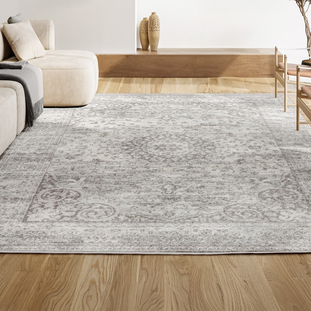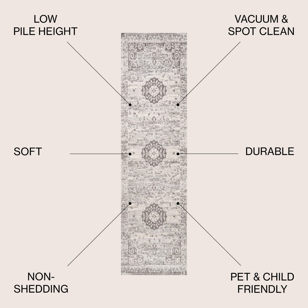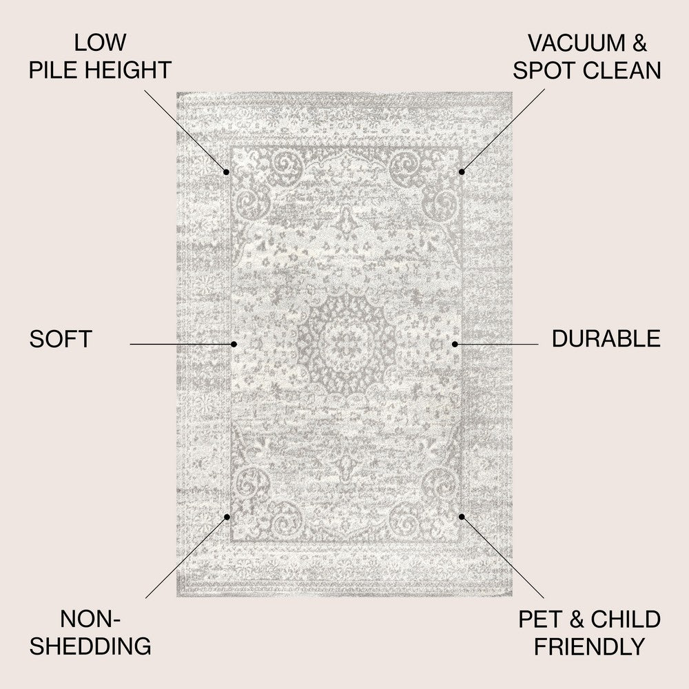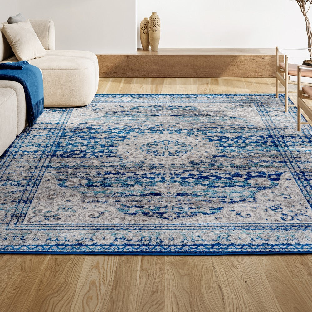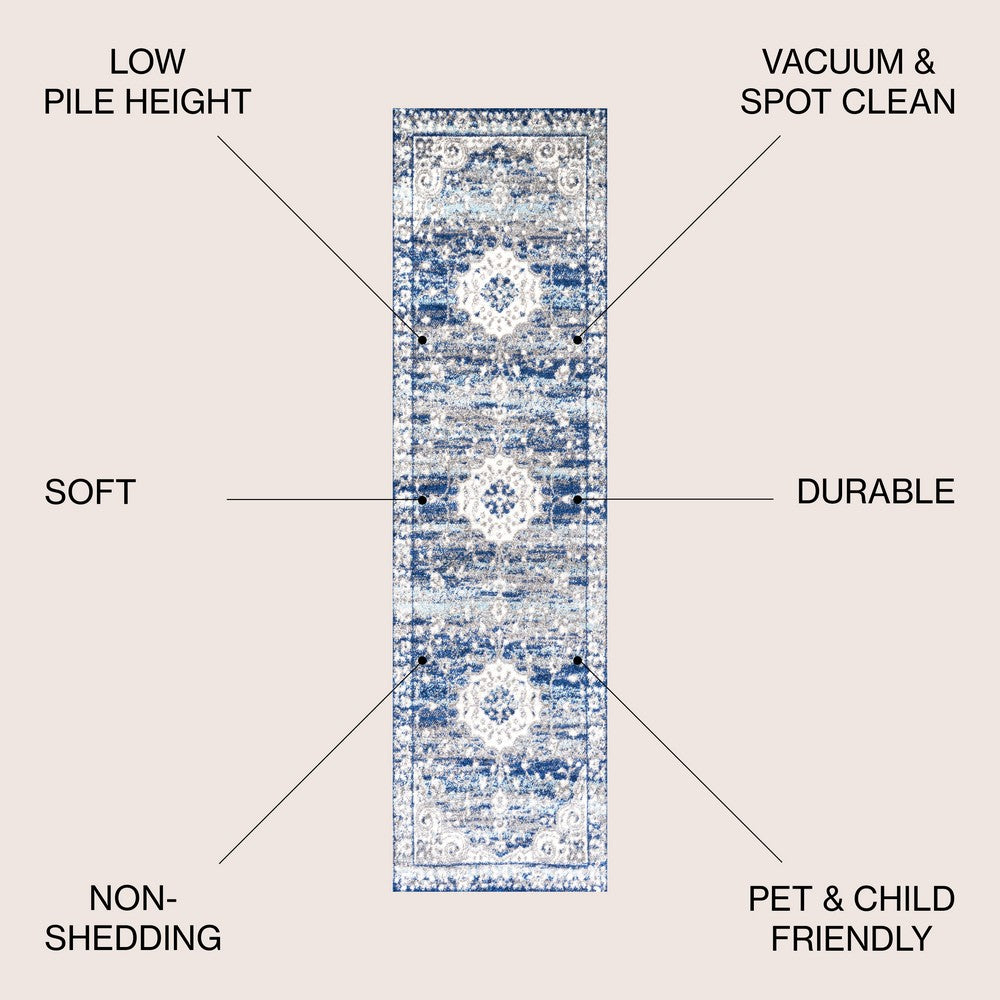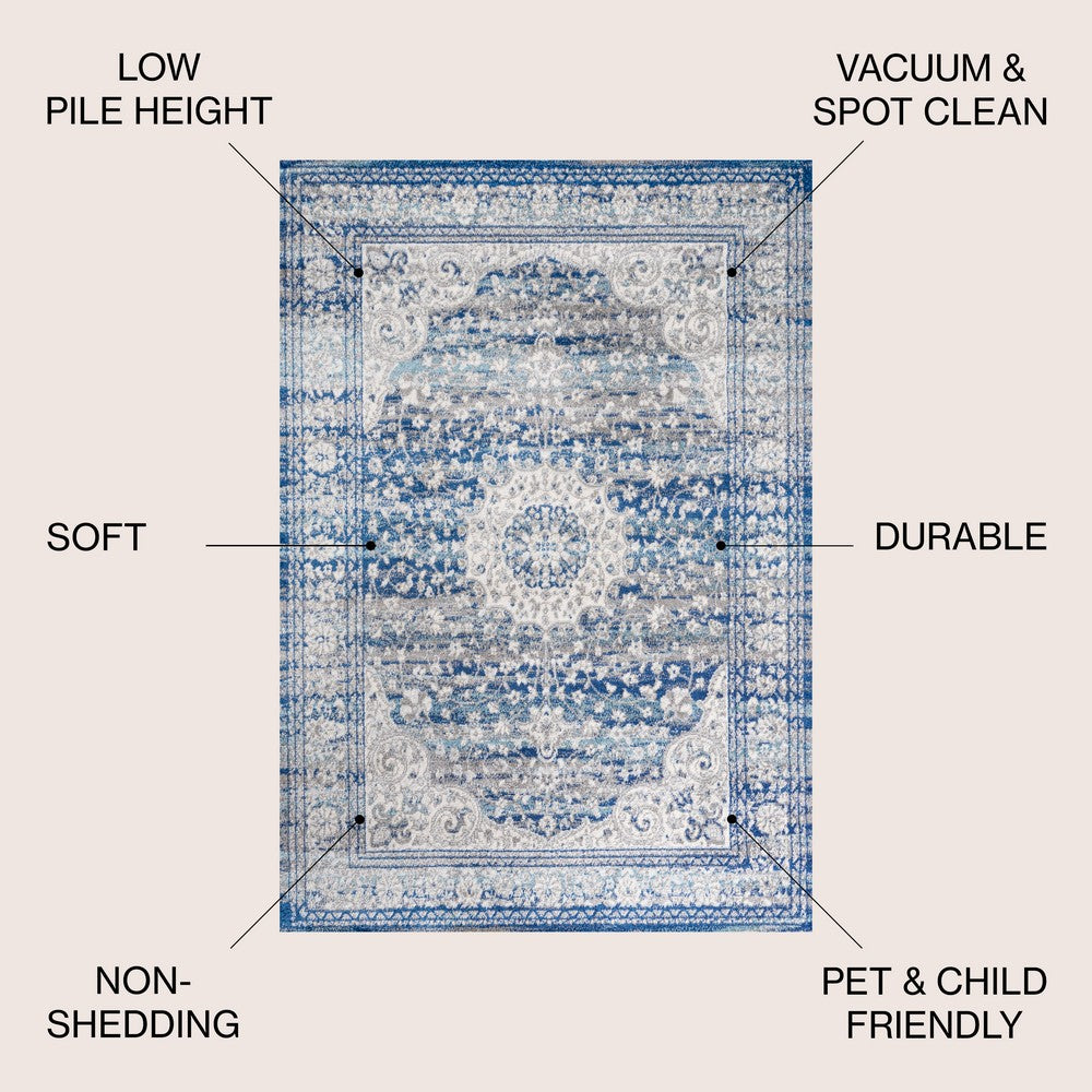 This ornate medallion rug has a scroll and floral pattern, adding modern Bohemian style to a living room, bedroom, entry or kitchen. Varied tones of navy mingled with a gray background give this rug a hand-woven, vintage vibe. The busy allover pattern is pet-friendly and great for kids too.