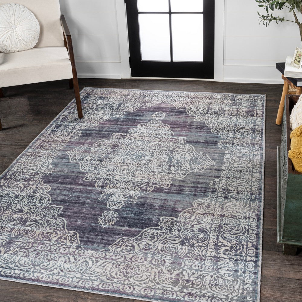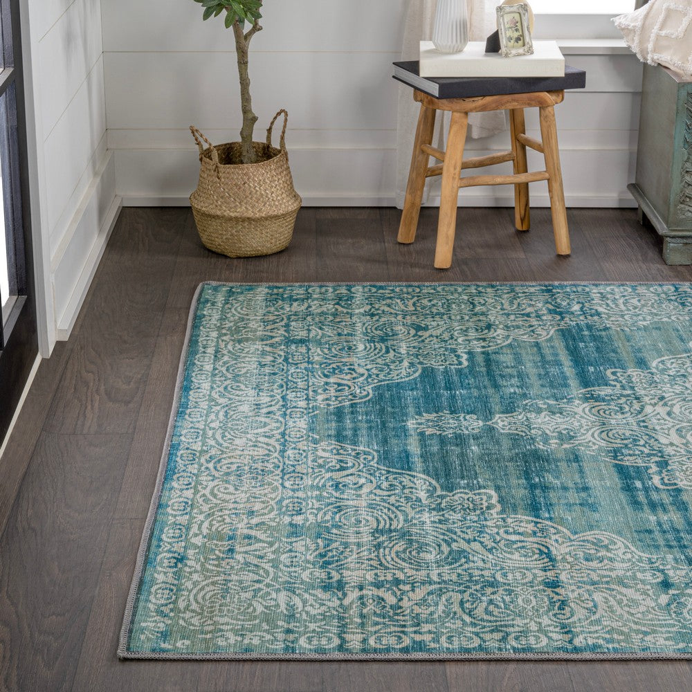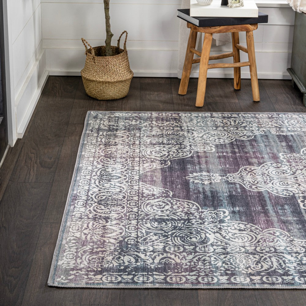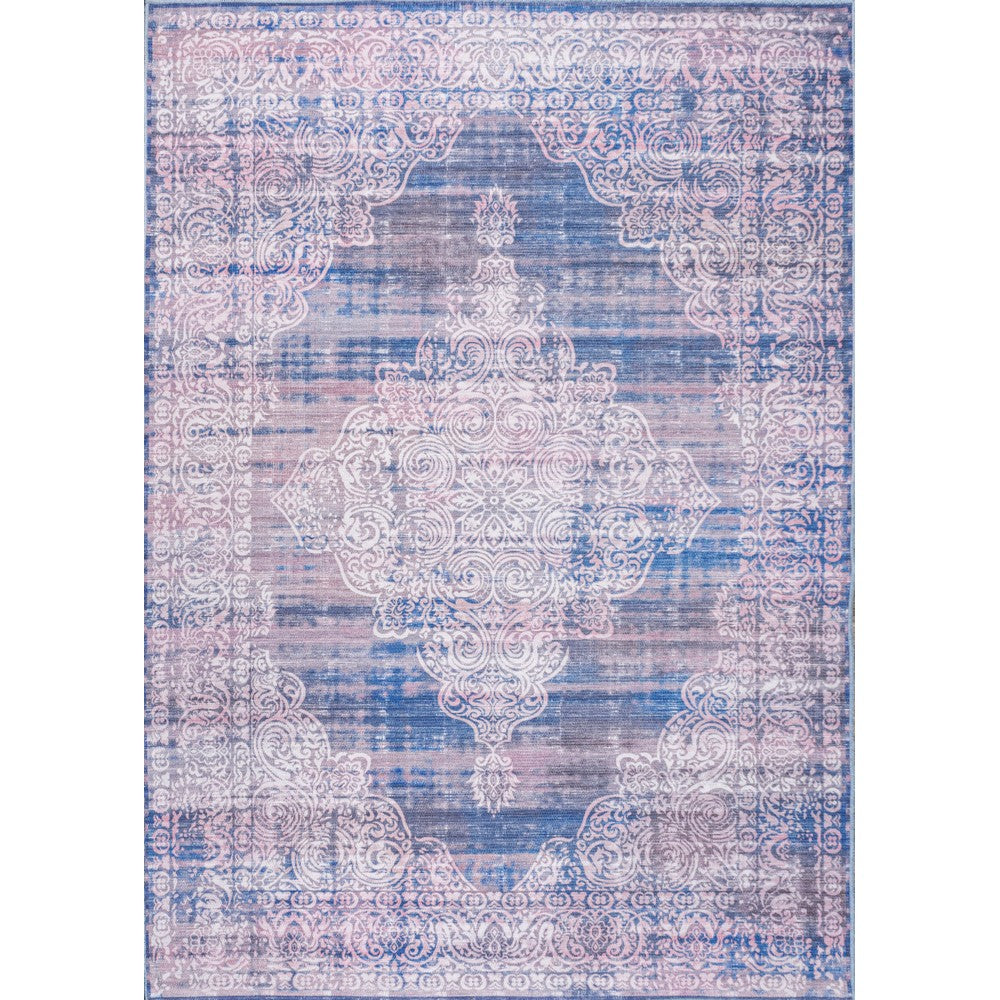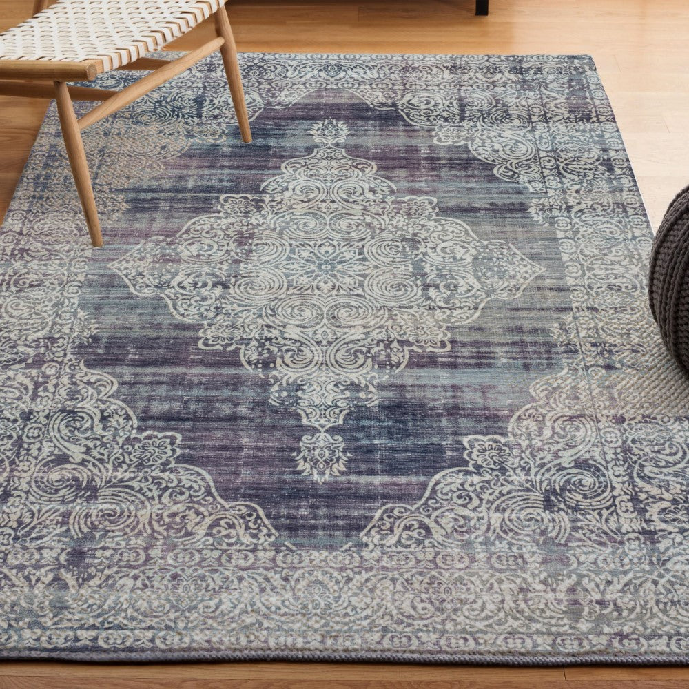 An ornate border and medallion design give this rug a French Country cottage look; but the faded color palette has a Bohemian vibe. Updated colors in a mingled weave create a vintage, distressed look. Use this romantic rug in a family room, bedroom, living room, dining room, entry, or porch; the busy pattern is kid and pet friendly.