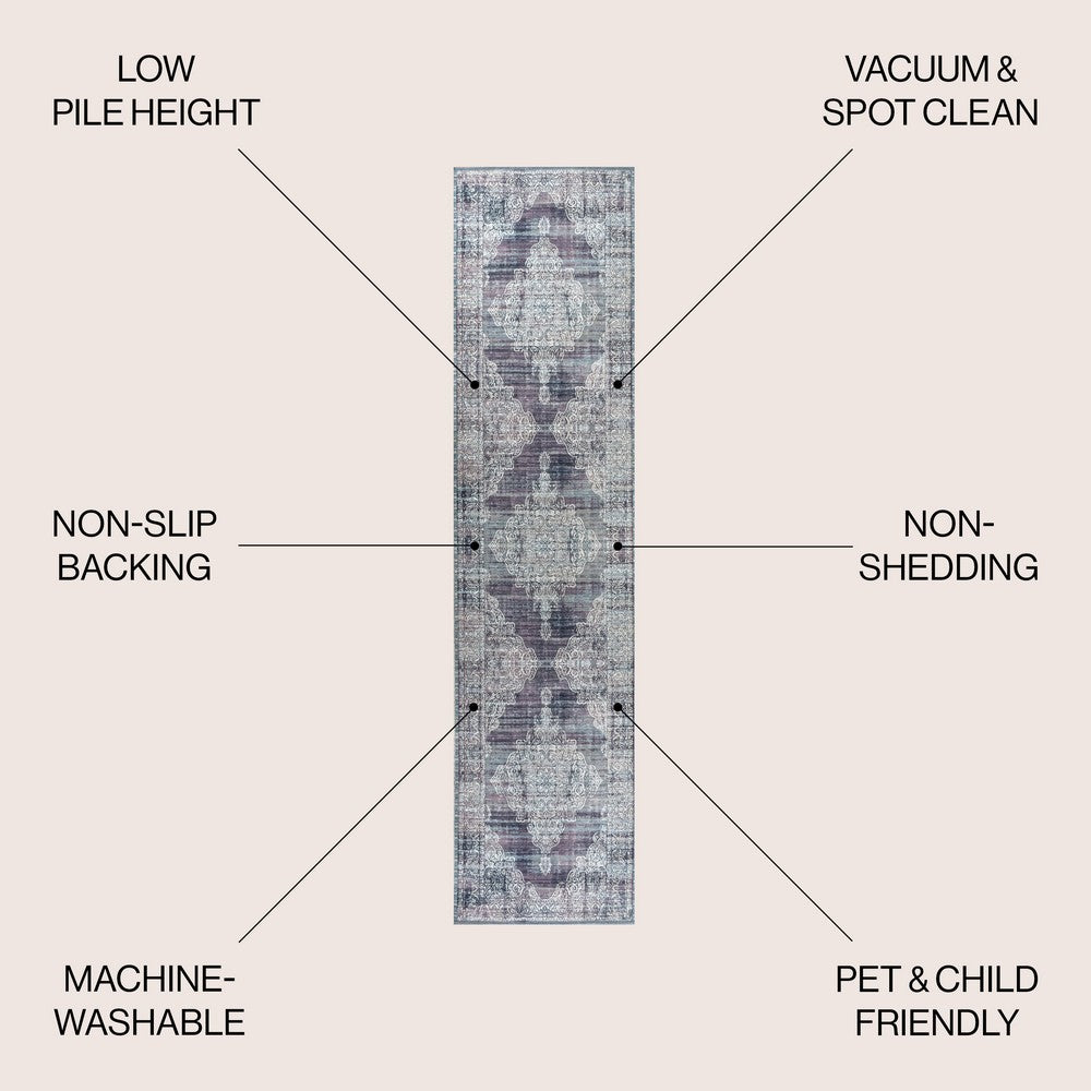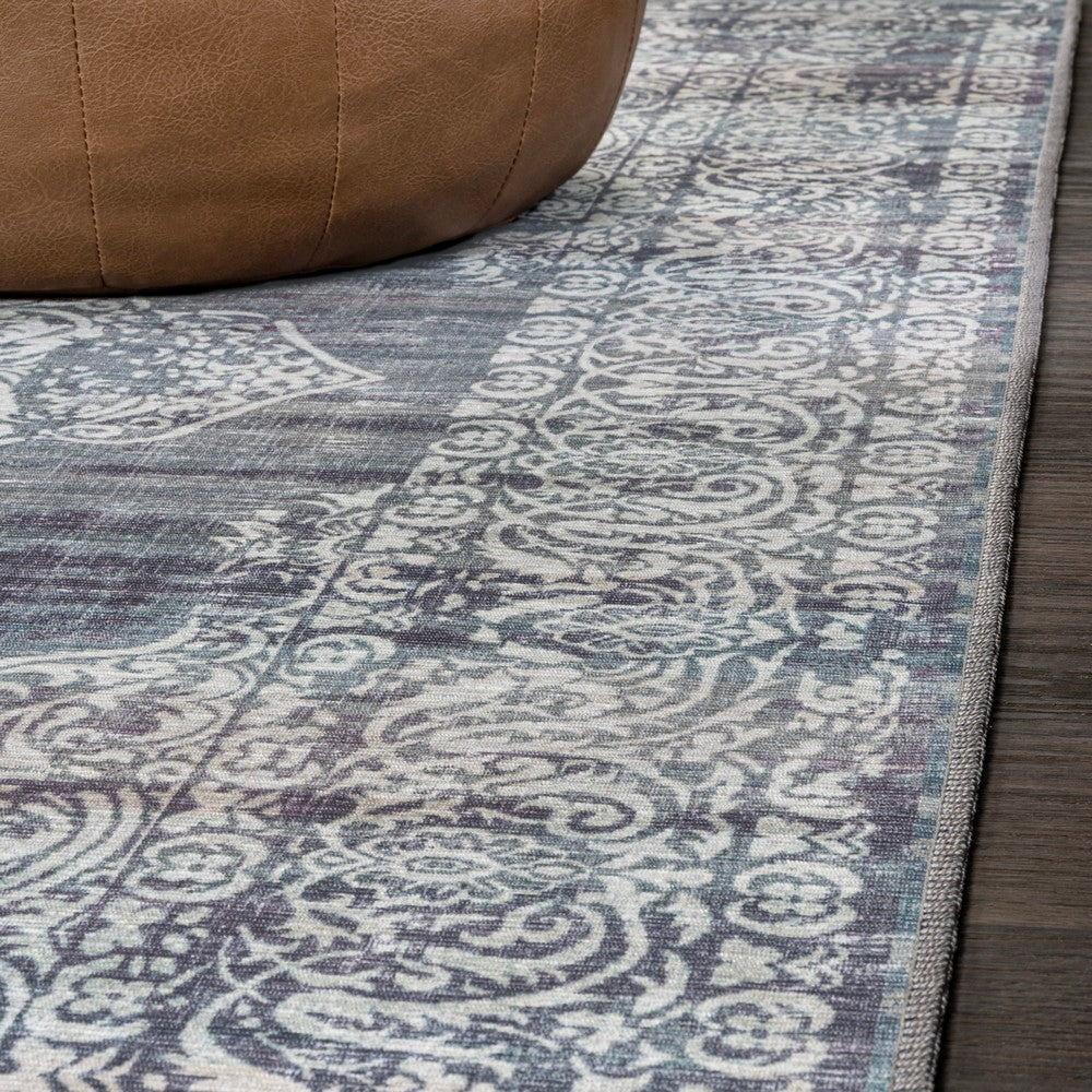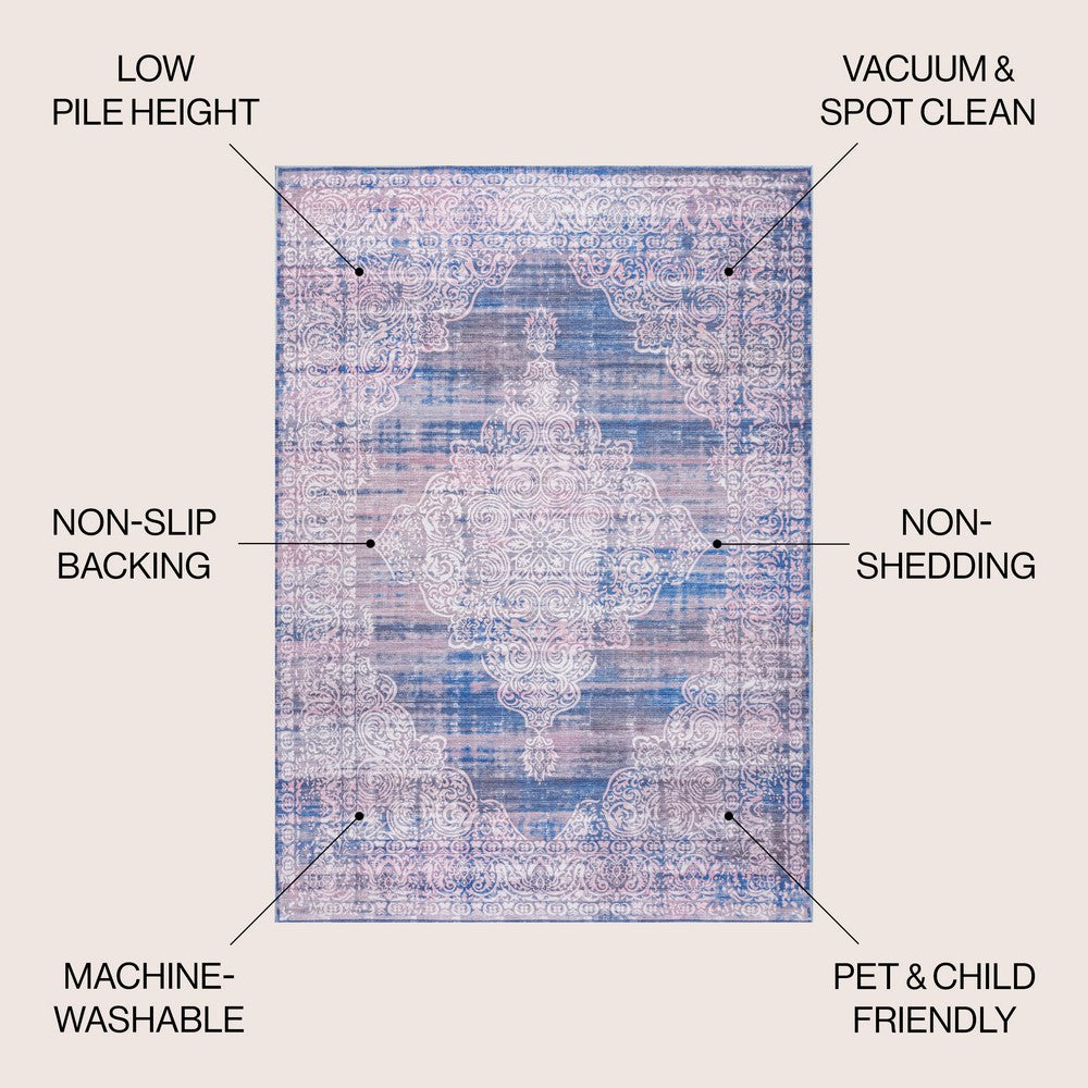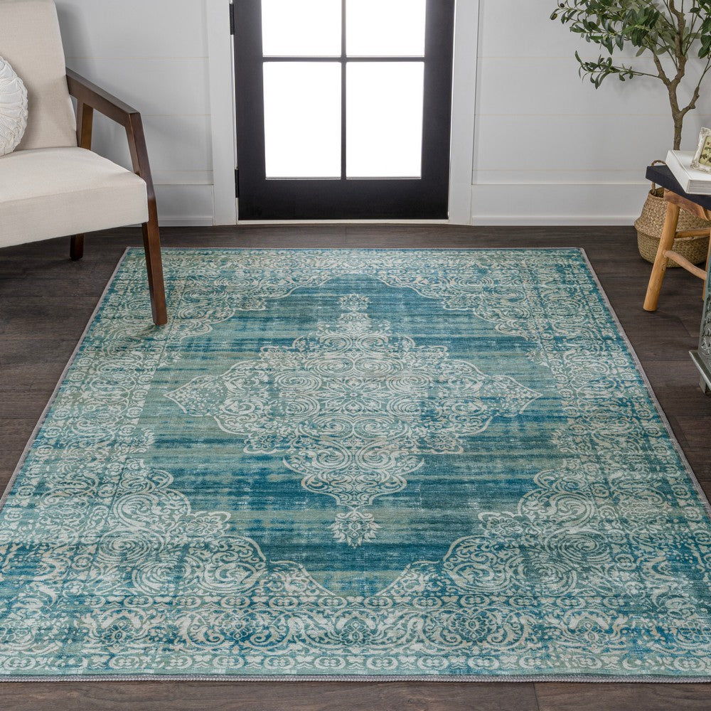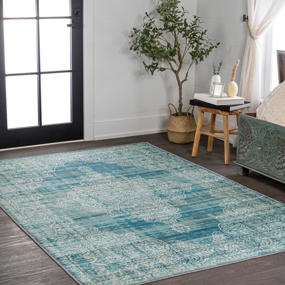 An ornate border and medallion design give this rug a French Country cottage look; but the faded color palette has a Bohemian vibe. Updated colors in a mingled weave create a vintage, distressed look. Use this romantic rug in a family room, bedroom, living room, dining room, entry, or porch; the busy pattern is kid and pet friendly.