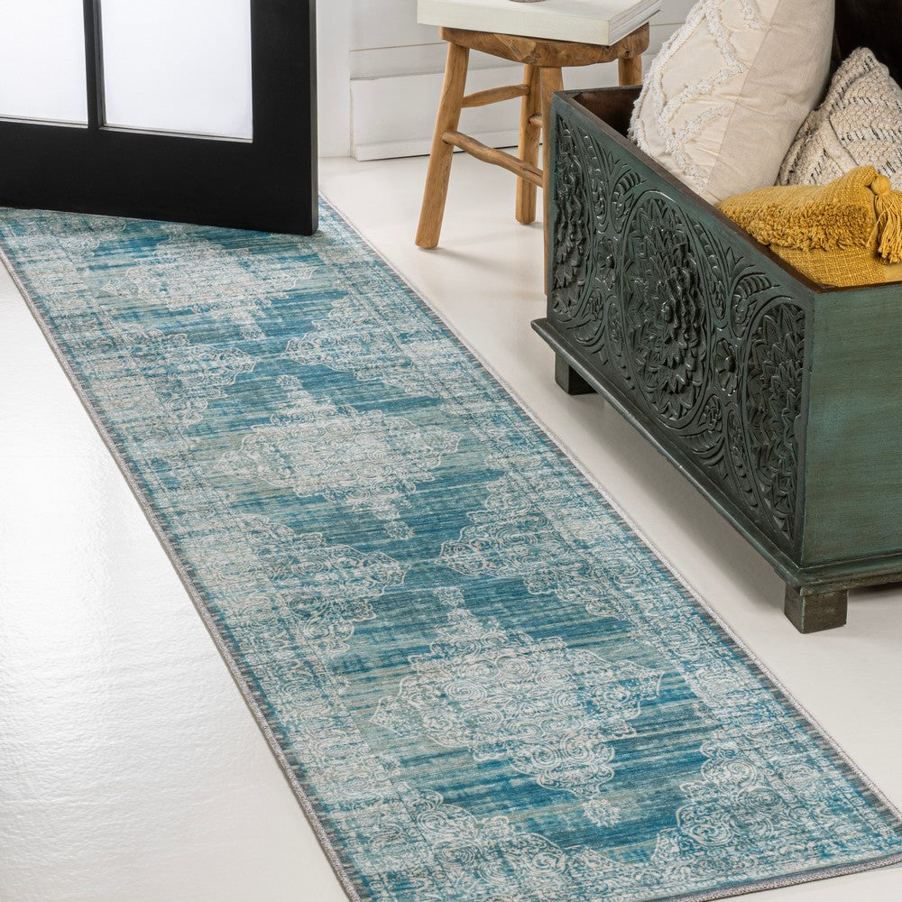 - Shades of blue and cream give this classic rug its Bohemian cottage look