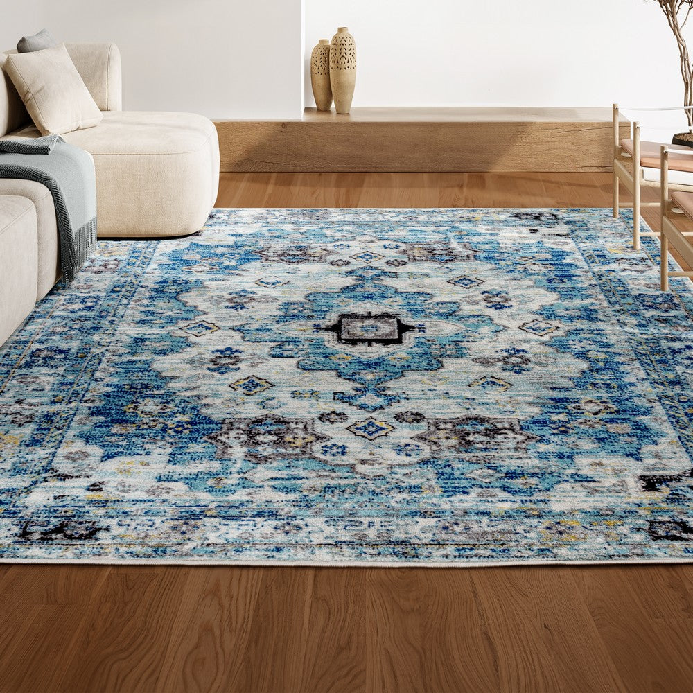 You'd never know its durability from looking at this Modern Persian style, but it's a classic that is built to stand the test of time. While it looks like an heirloom antique, it is made of modern materials woven on a power loom, and is perfect for homes with kids, pets, or high traffic. The lovely shades of turquoise and aqua bring new life to this traditional pattern.