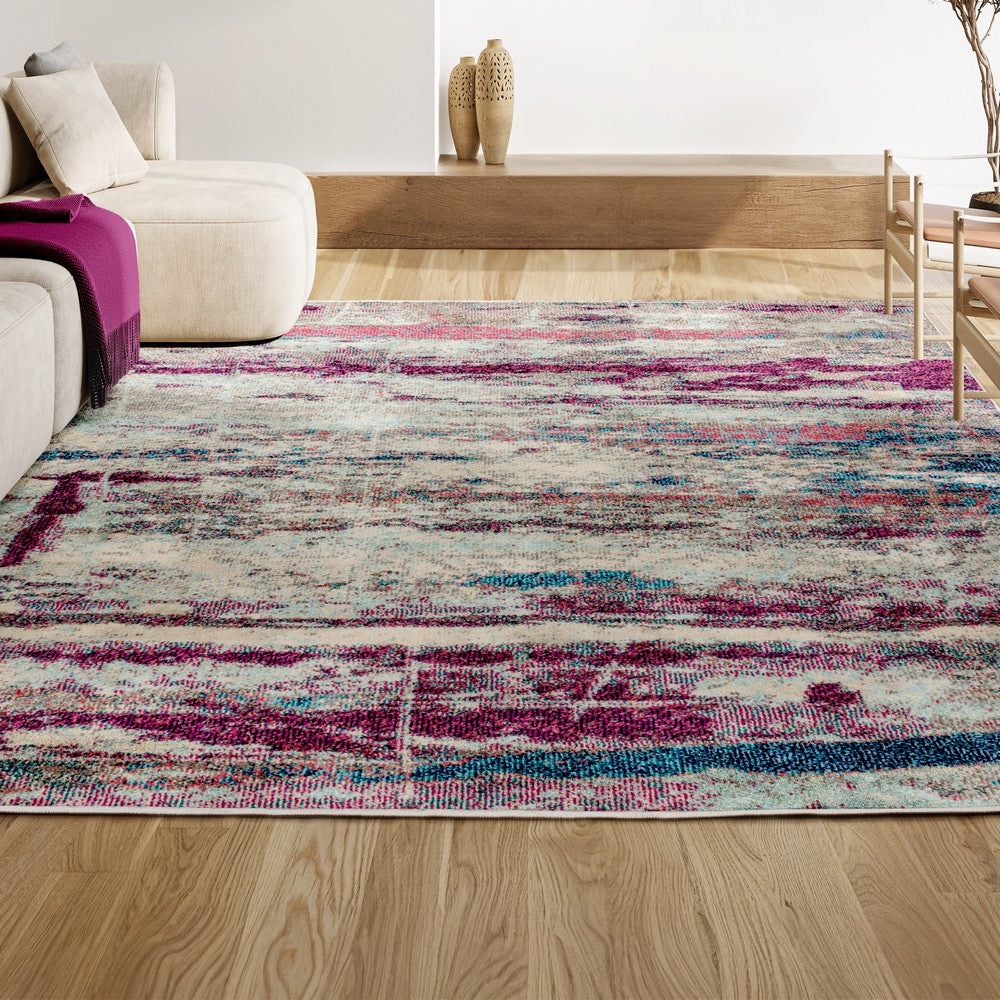 - Combining tones of pink, purple, aqua and cream, this rug is a versatile addition to any color scheme