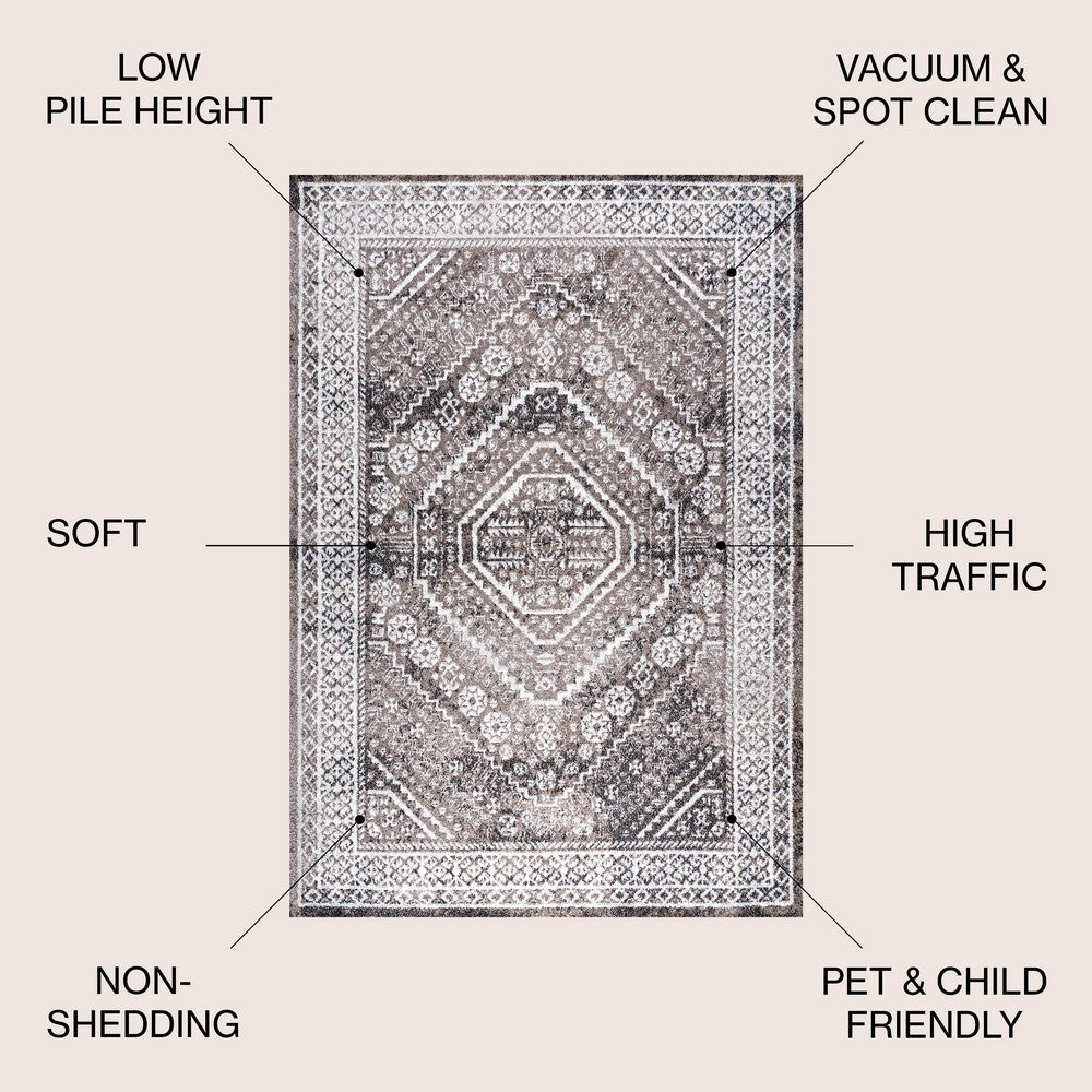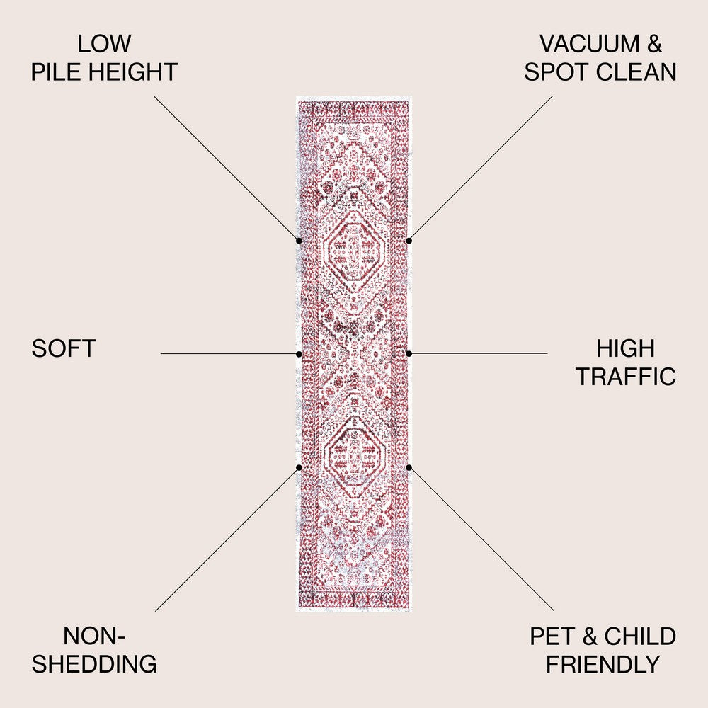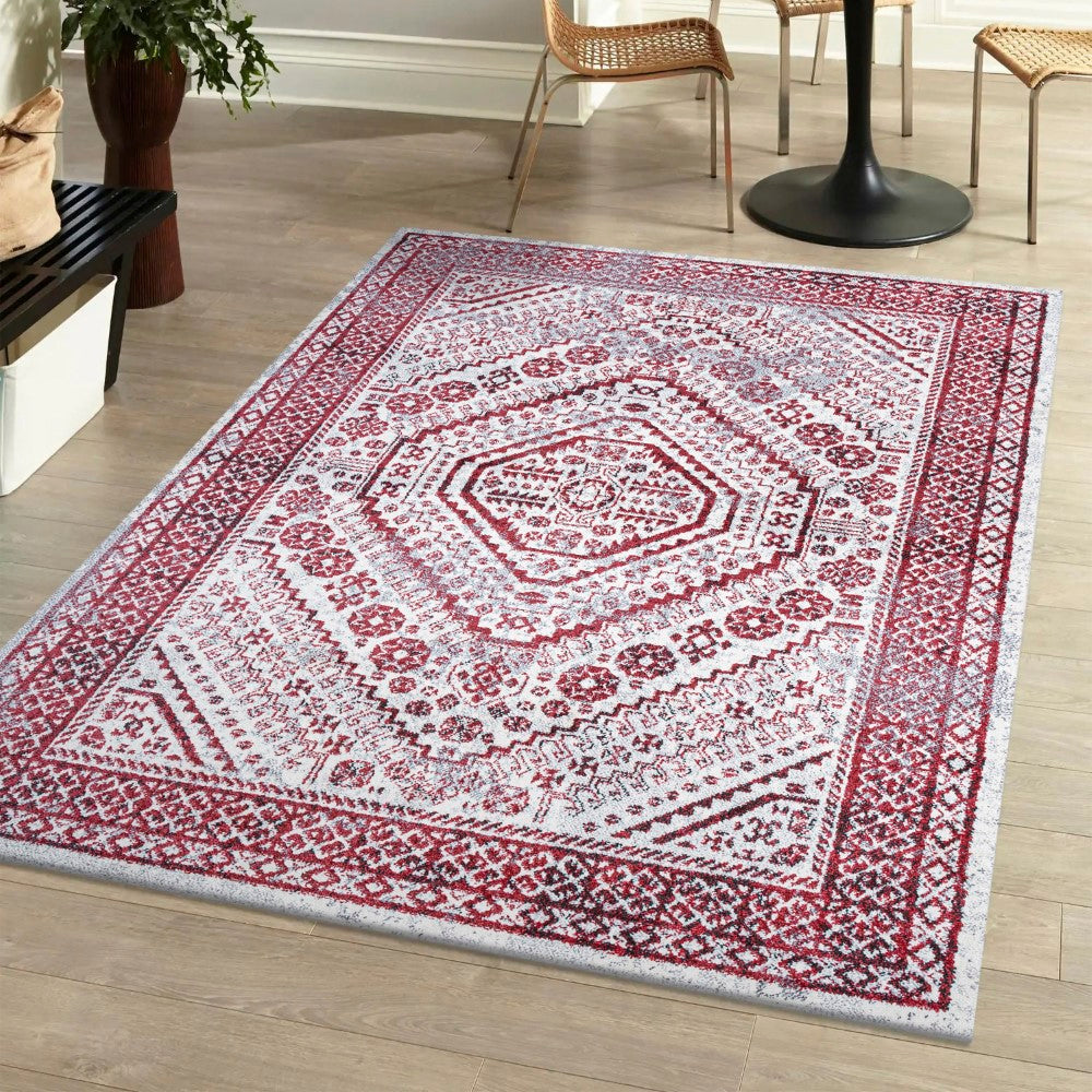 This ornate medallion rug has a geometric pattern that adds modern Bohemian style to a living room, bedroom, entry or kitchen. Varied tones of red mingled with a gray and ivory background give this rug a hand-woven, vintage vibe. The busy allover pattern is pet-friendly and great for kids too.