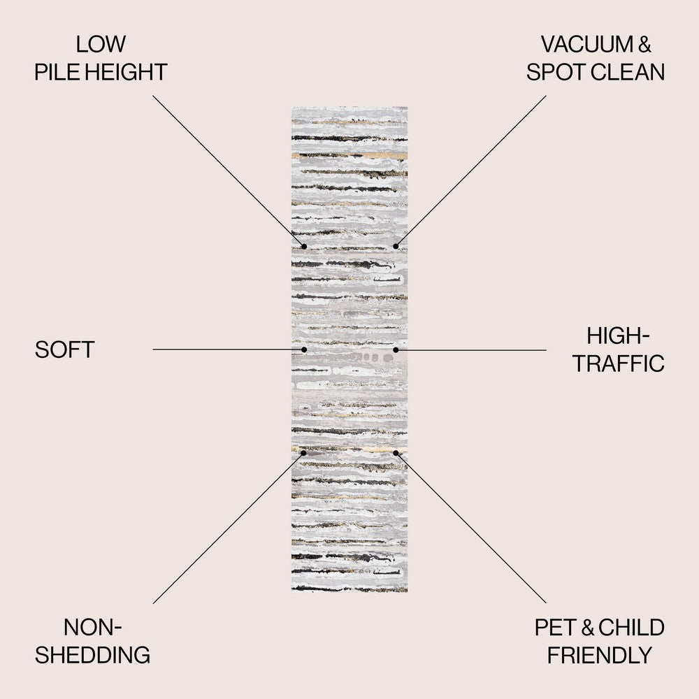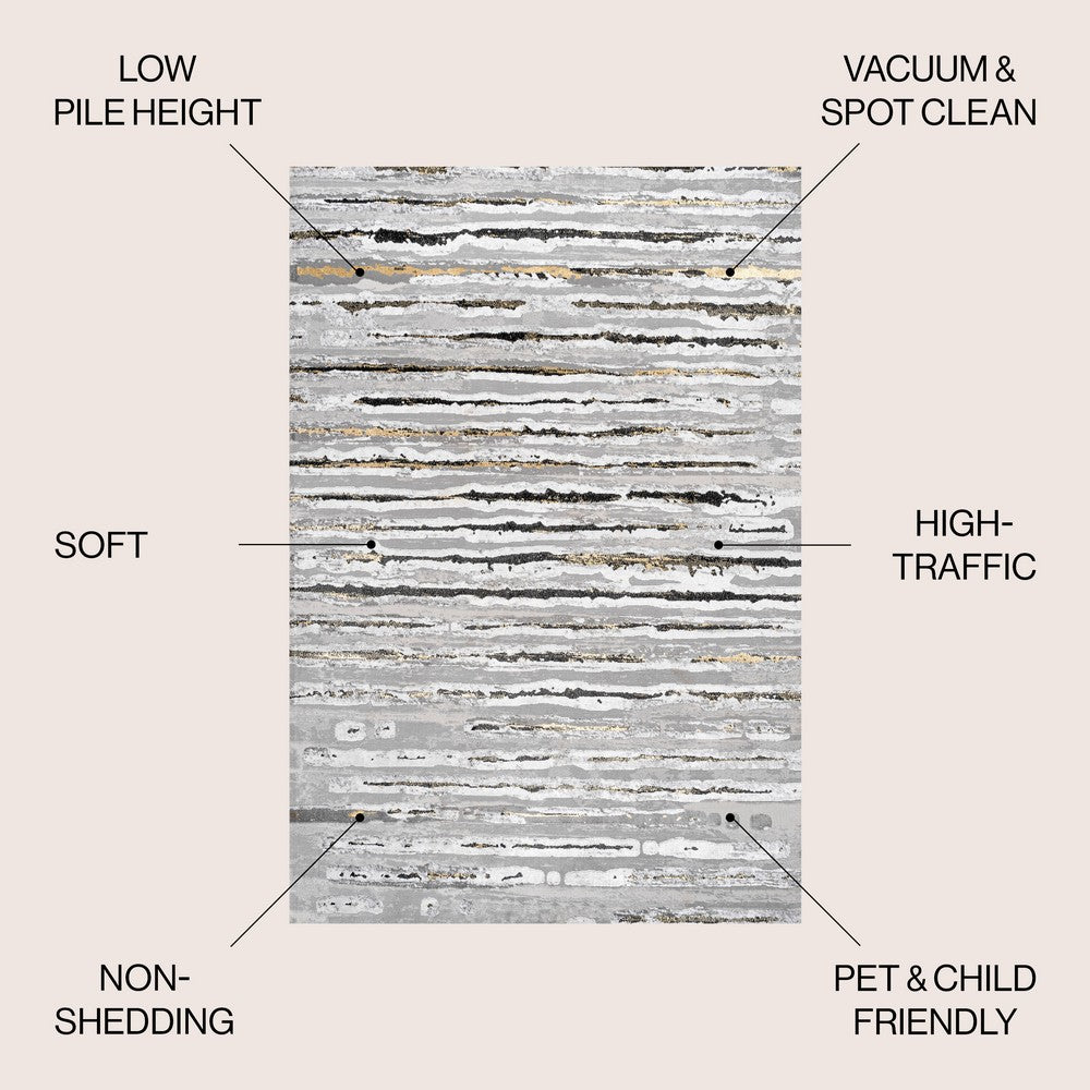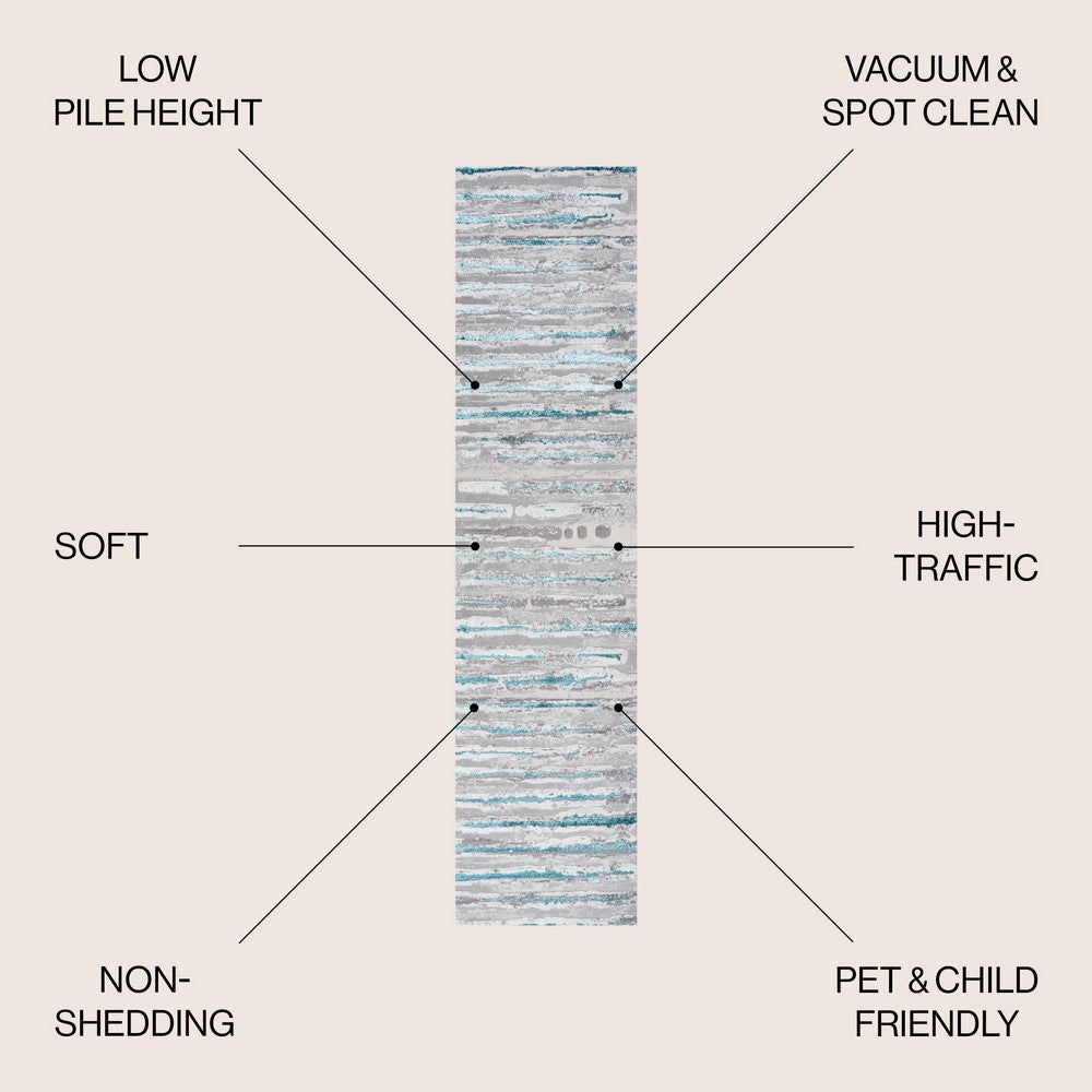 Mingled threads of turquoise, gray and ivory create a modern, abstract linear design with a mid-century look. This rug's unique strie' stripe pattern makes it perfect for homes with kids and pets. It's the ideal centerpiece for a contemporary, coastal or minimalist interior.