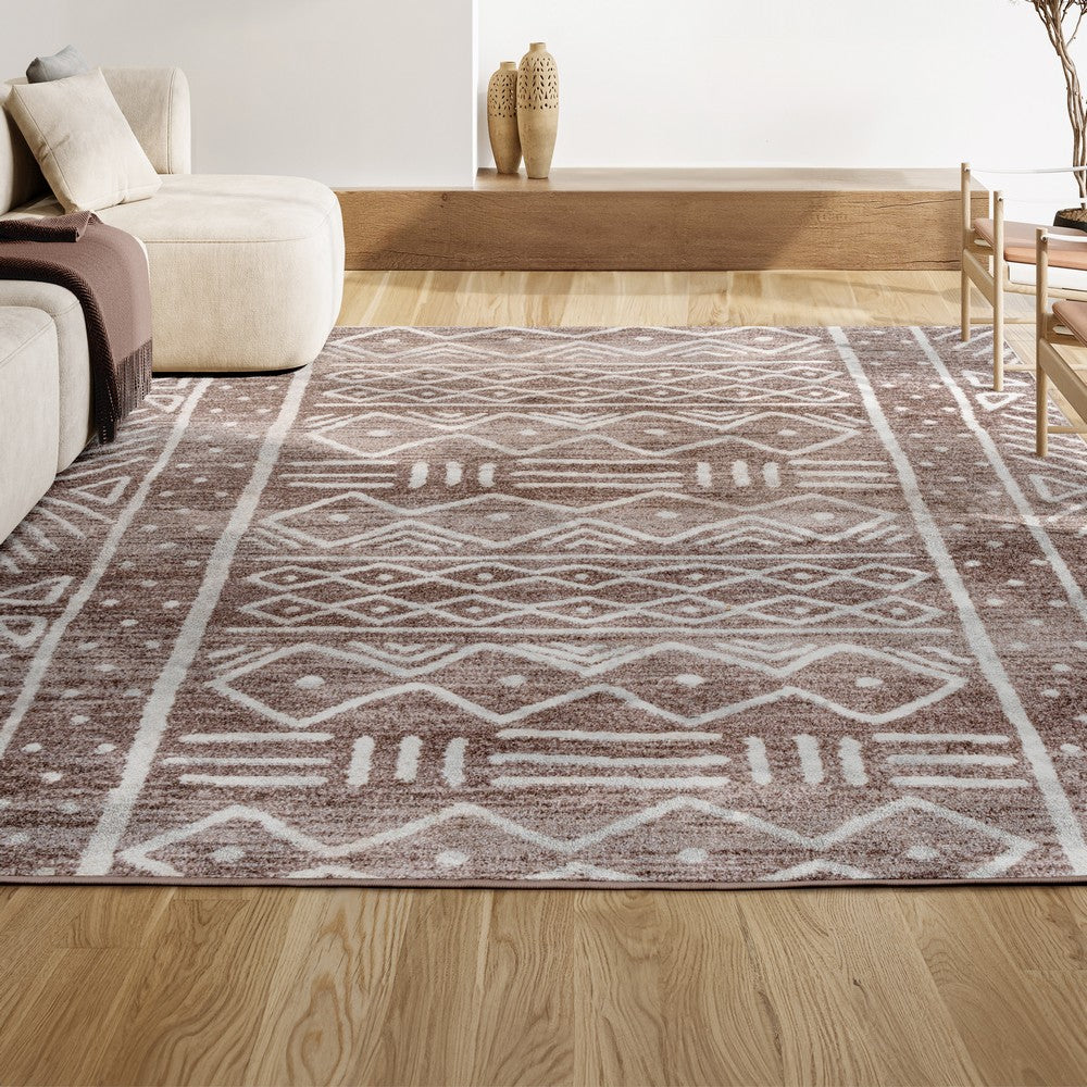 Inspired by vintage Moroccan rugs, our easy-care rug has a family-friendly short pile. The neutral brown and beige pattern features geometric tribal designs with a graphic border. Anchor your modern Bohemian space; add minimalist flair to a bedroom, living room, dining room, kitchen or entry; this is a durable rug with timeless style.