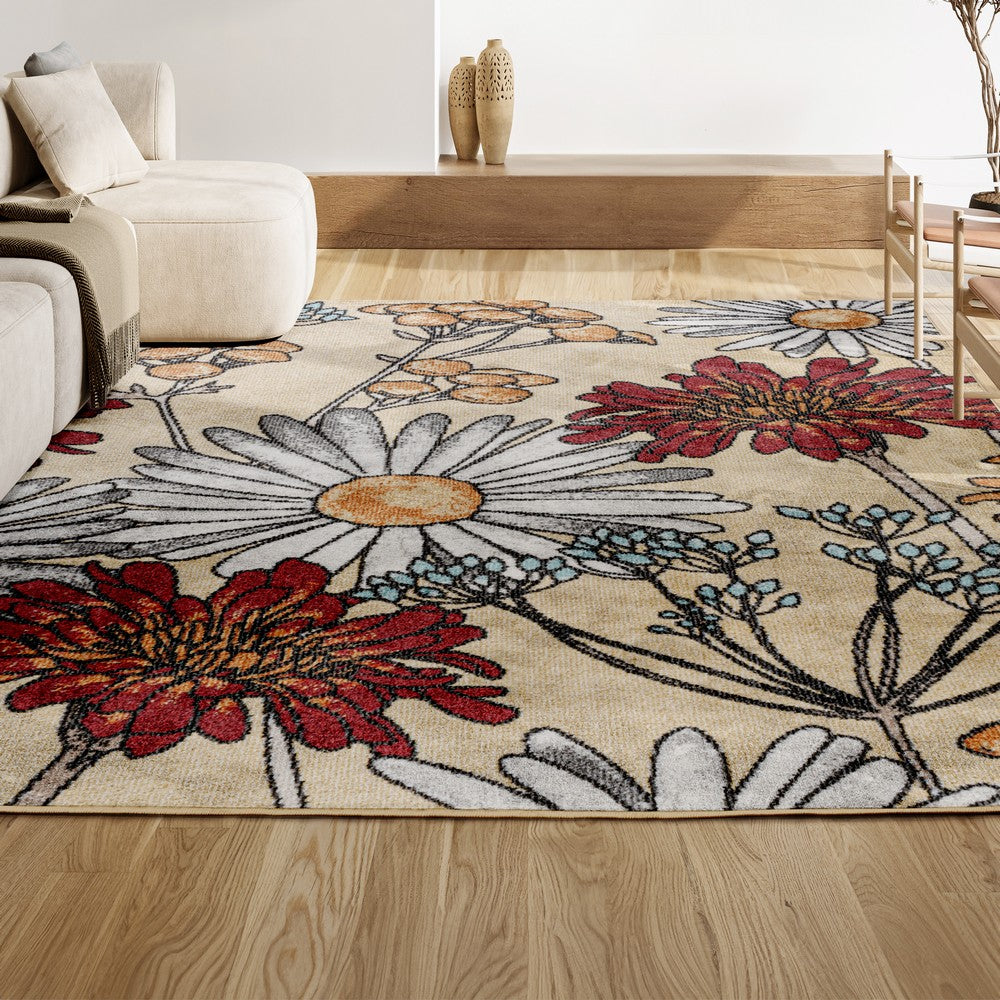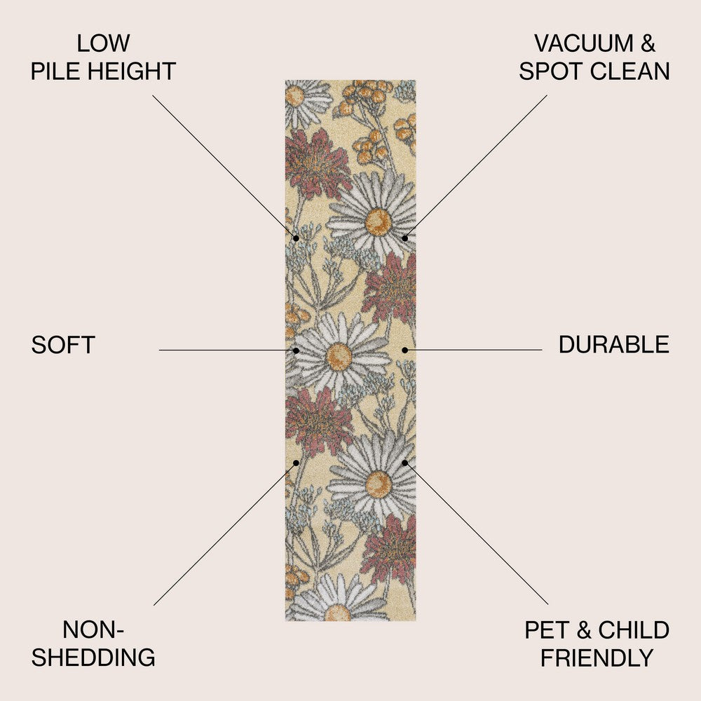 Layer on the cottage garden style with this lively rug's all-over floral design. The graphic wildflower pattern gives vintage botanical prints a modern vibe. Easy-care low pile and a busy pattern make this pet-friendly rug perfect for a bedroom, living room, kitchen, or dining area.