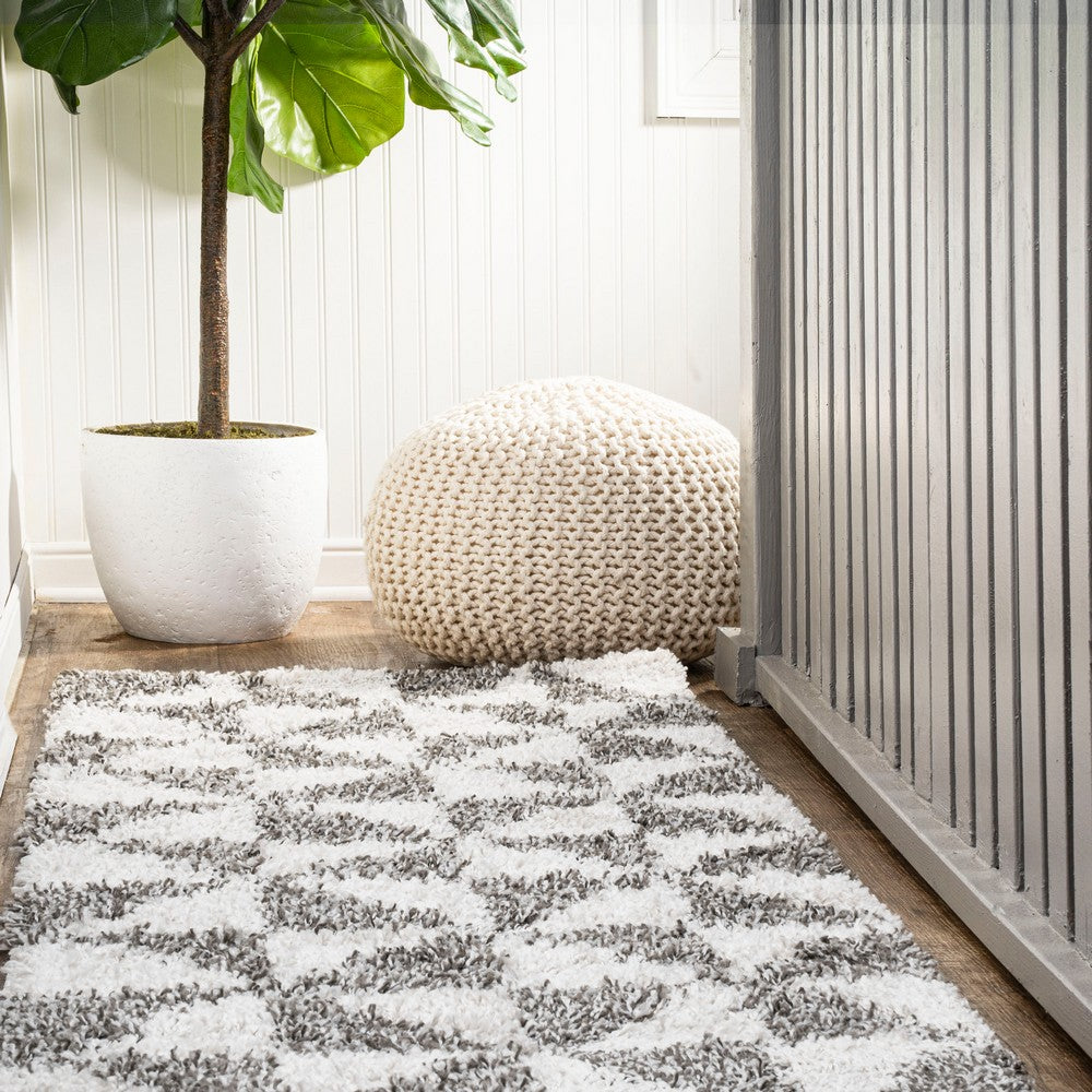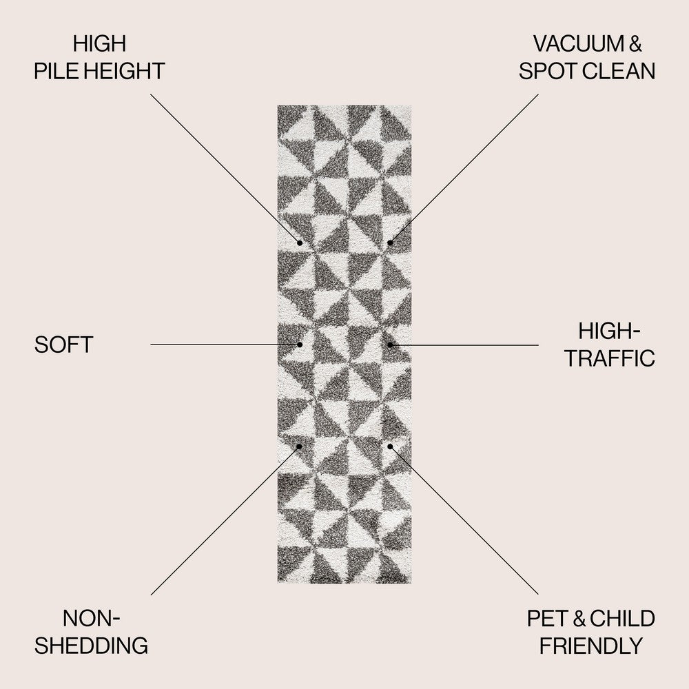 Inspired by Moroccan tile, our geometric rug has a soft, fluffy shag pile. The all-over pattern is woven in a modern deep gray and ivory. Add some graphic mid-century punch to your living room, bedroom, or reading nook with this easy-care rug.