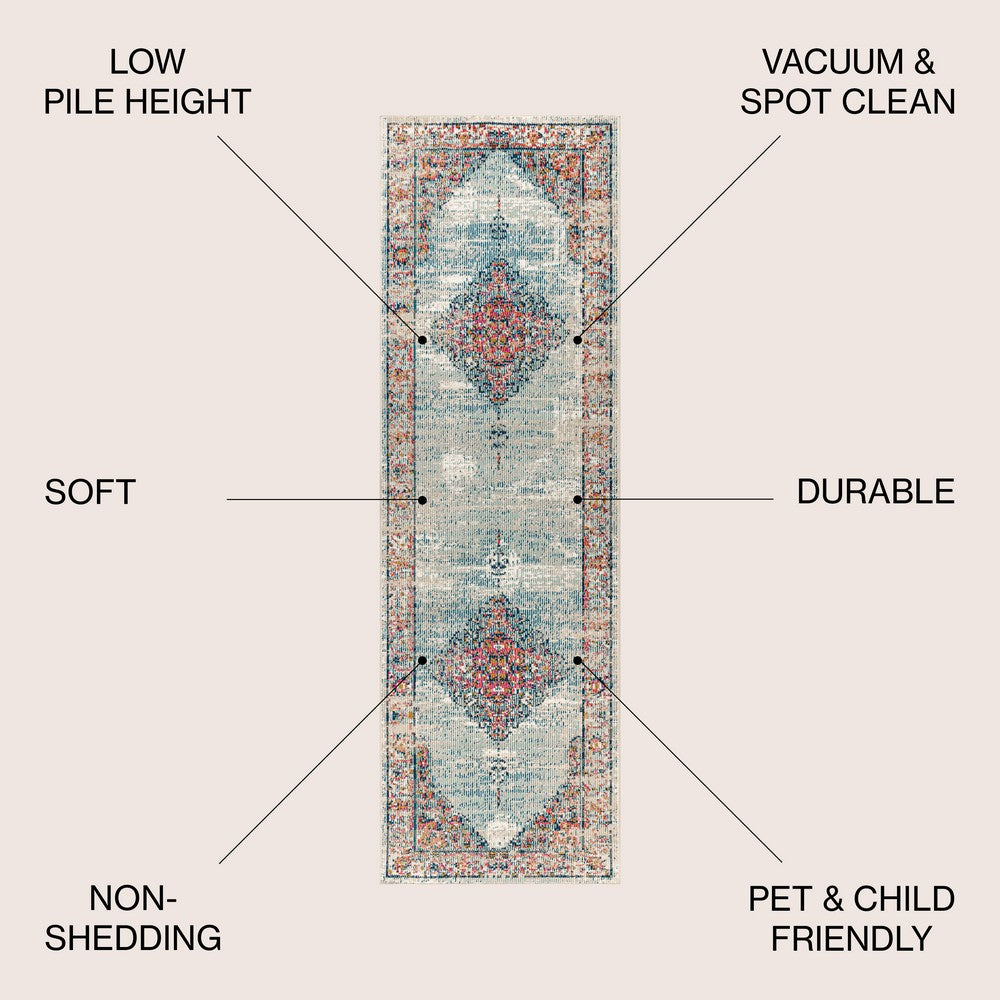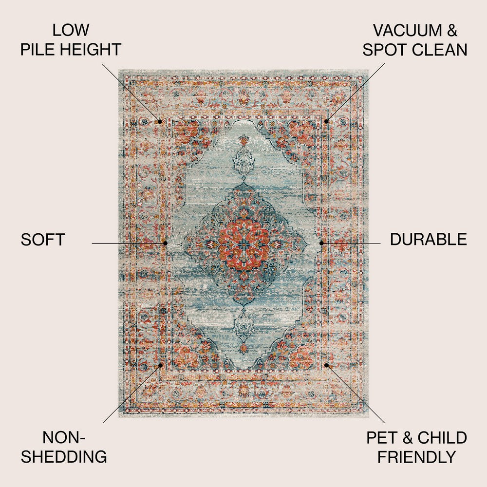 Featuring a floral central medallion and a cheerful Bohemian color scheme, our Cadiz rug adds a vintage vibe to your living room, bedroom, or den. The coral pattern on an aqua and ivory ground has a timeworn, faded effect. Power loomed from synthetic materials, it is as durable as it is beautiful.