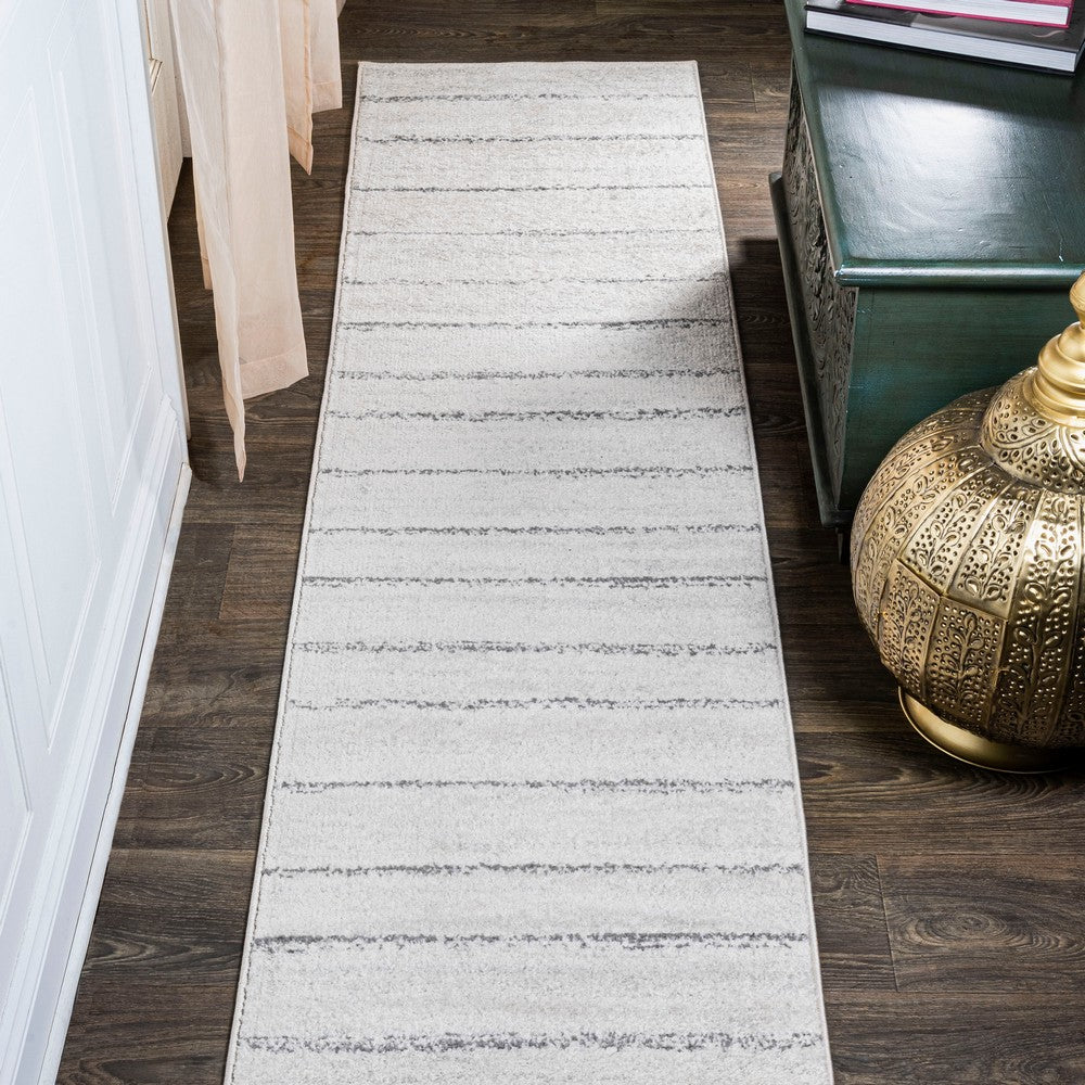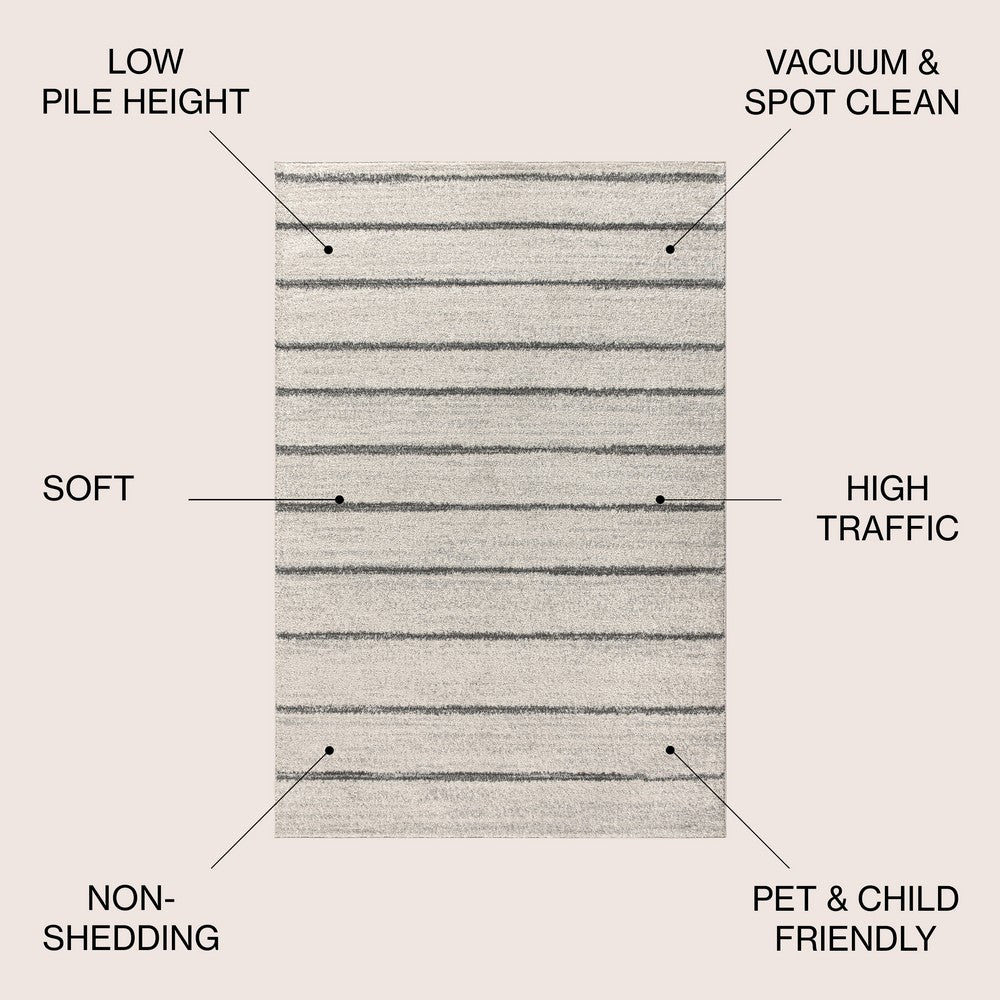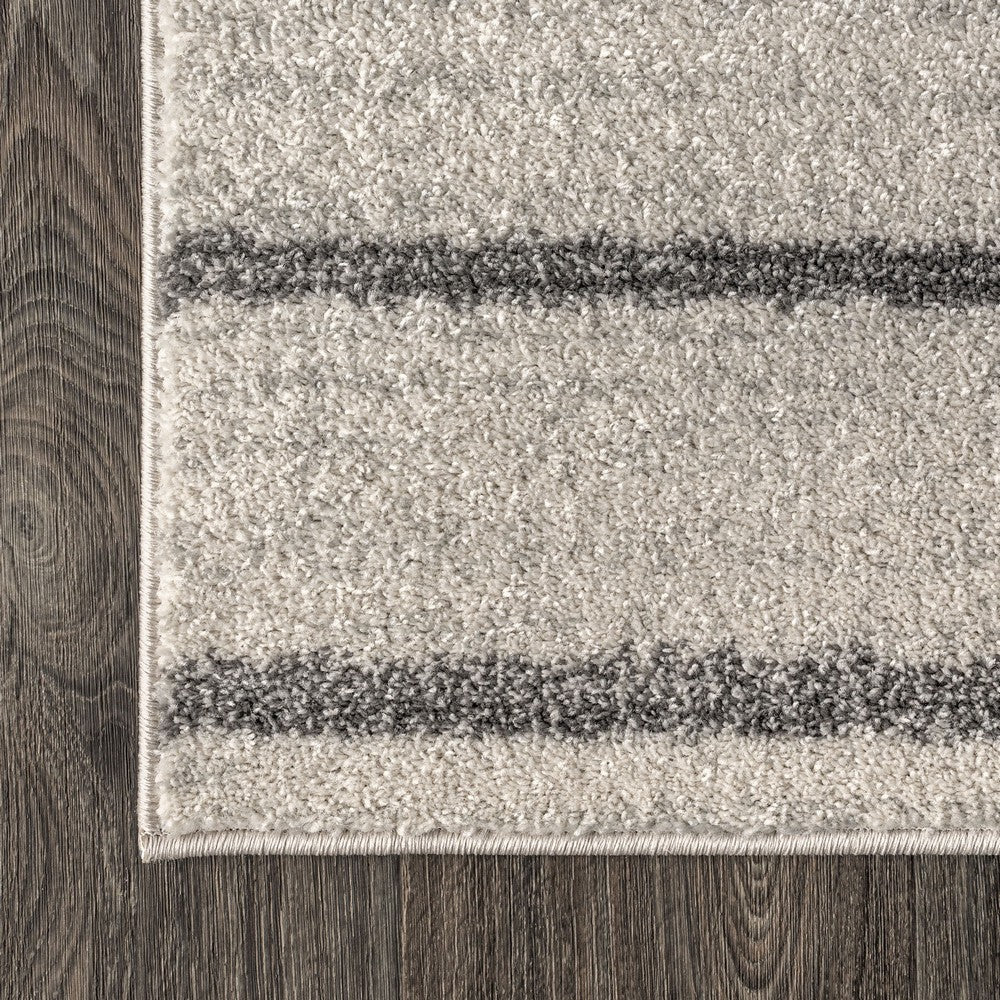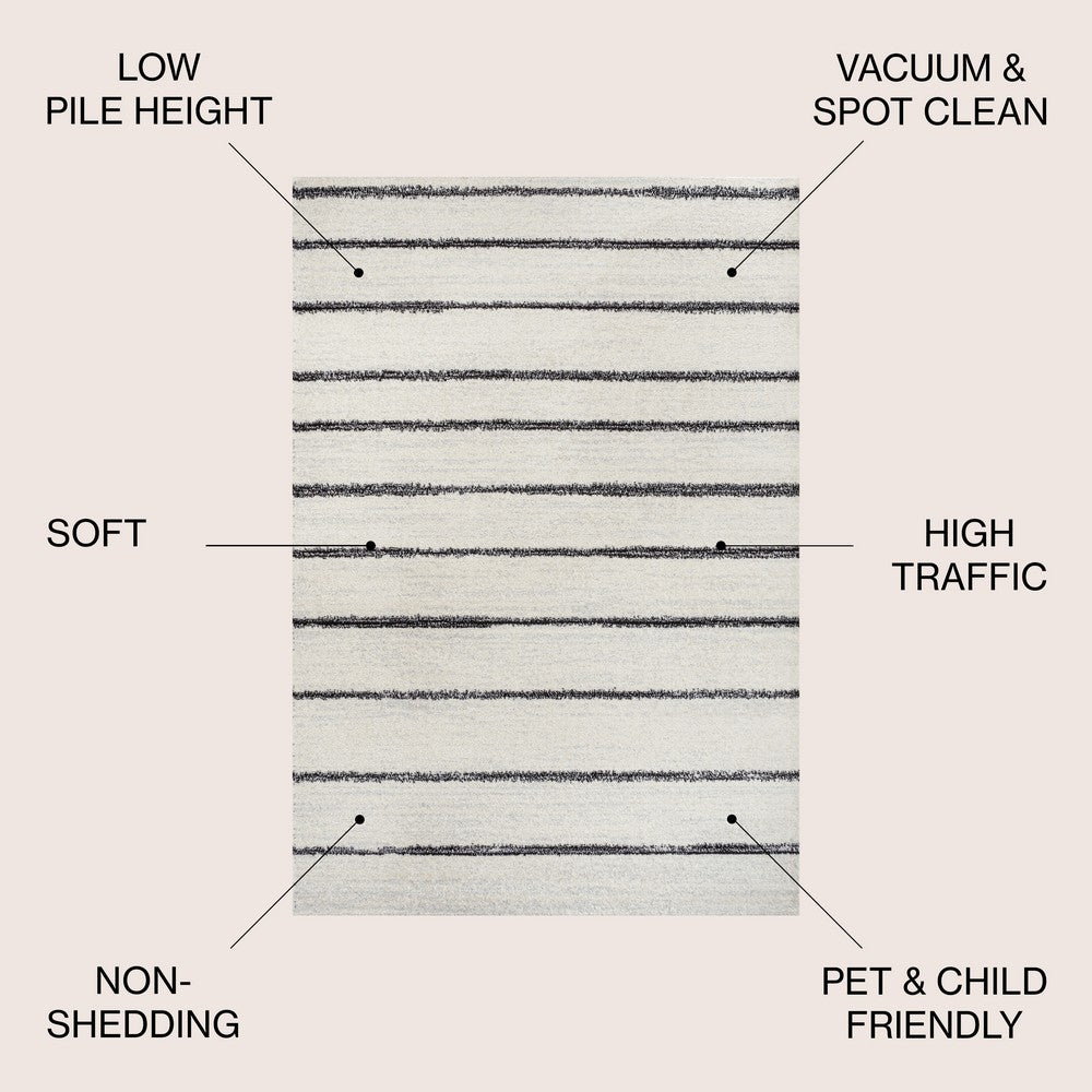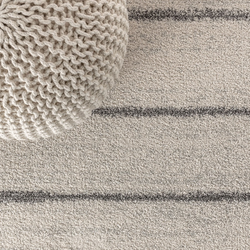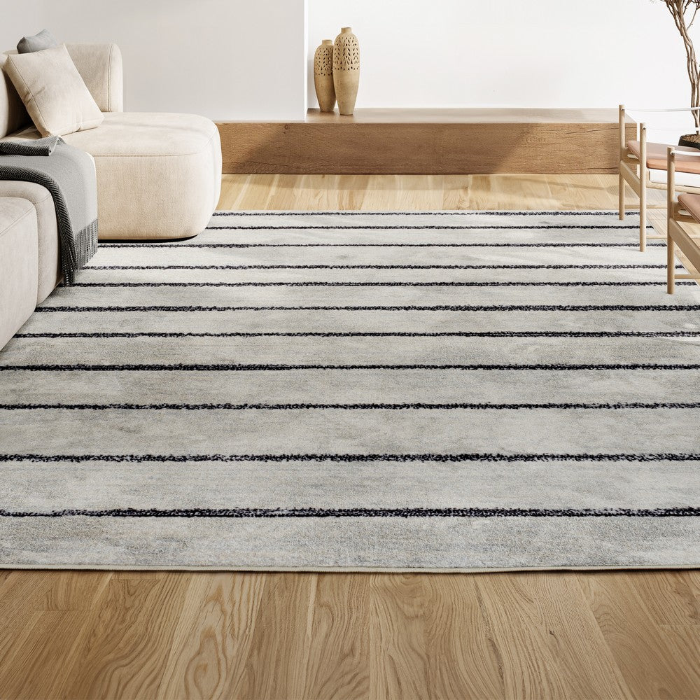 The neutral gray stripes in this rug are the perfect backdrop for modern furniture. Subtle tones of ivory and gray mingled throughout the background add a hand-woven effect. Simple and chic, this versatile rug is at home in a modern loft or classic farmhouse interior.