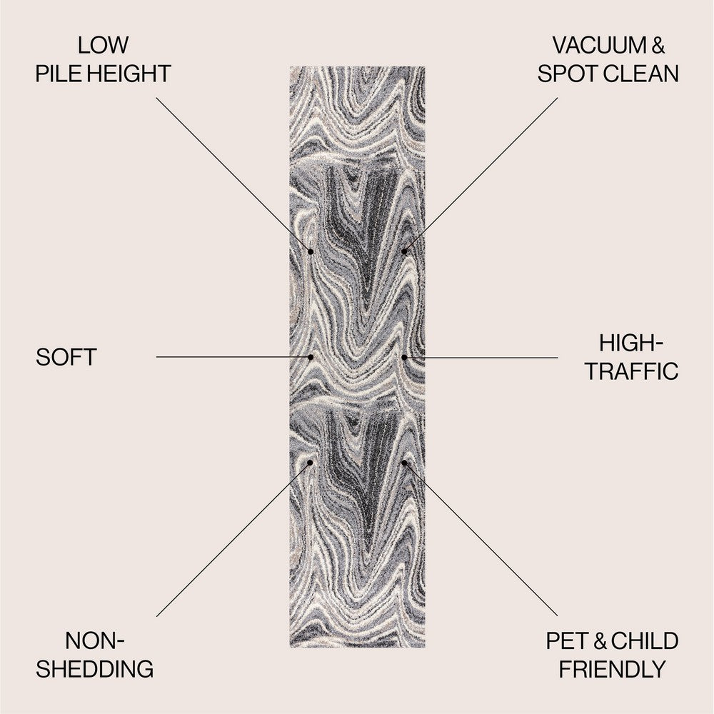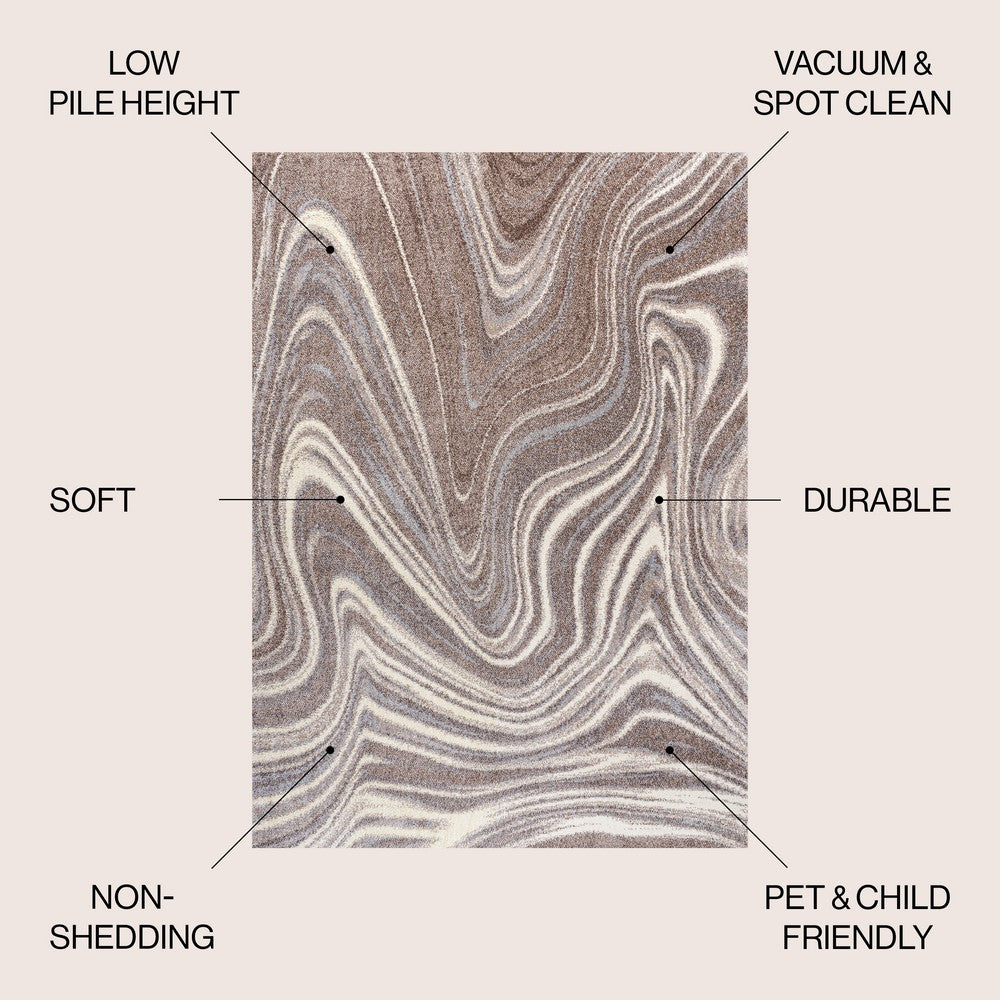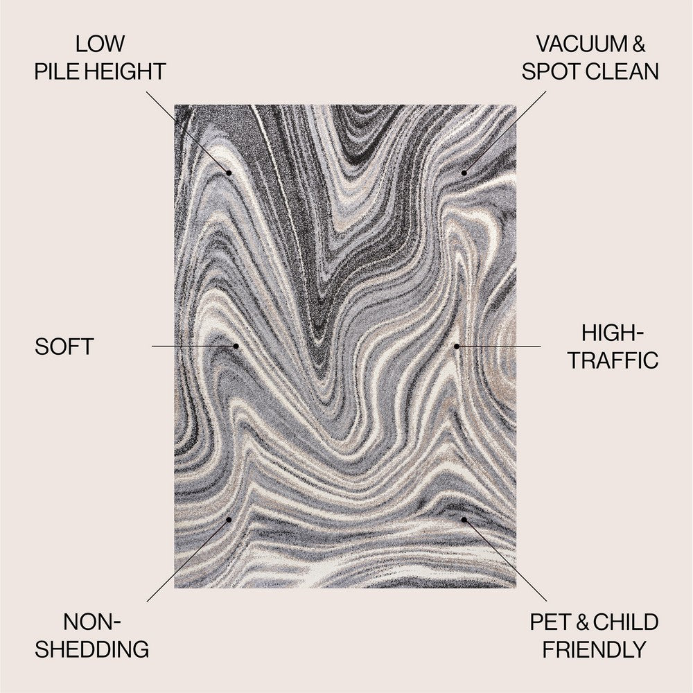 Inspired by natural marble, this modern, abstract rug makes a bold statement. With soft, durable synthetic fibers and a busy pattern, this rug is ideal for homes with kids and pets. It's also the perfect centerpiece for a contemporary or industrial interior.
