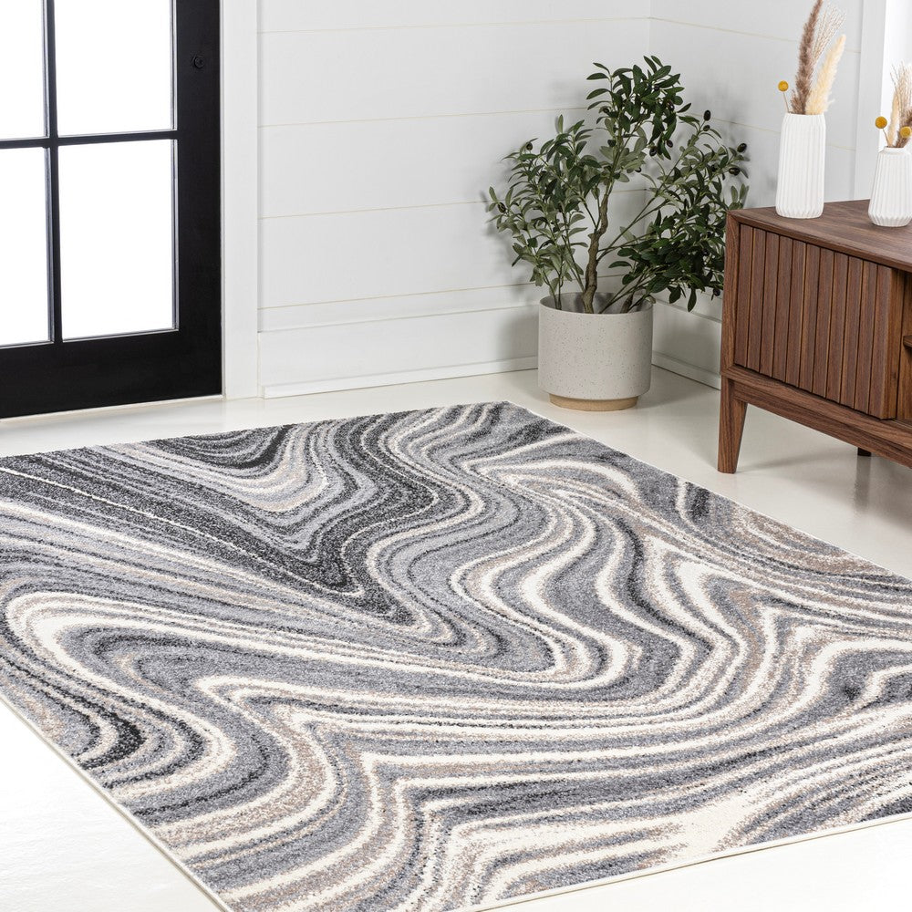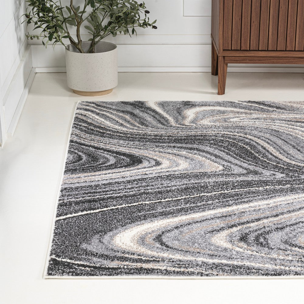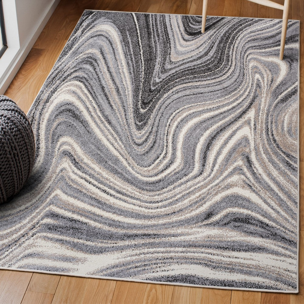 - Deep charcoal against a soft gray and cream background gives this modern rug a marbled look