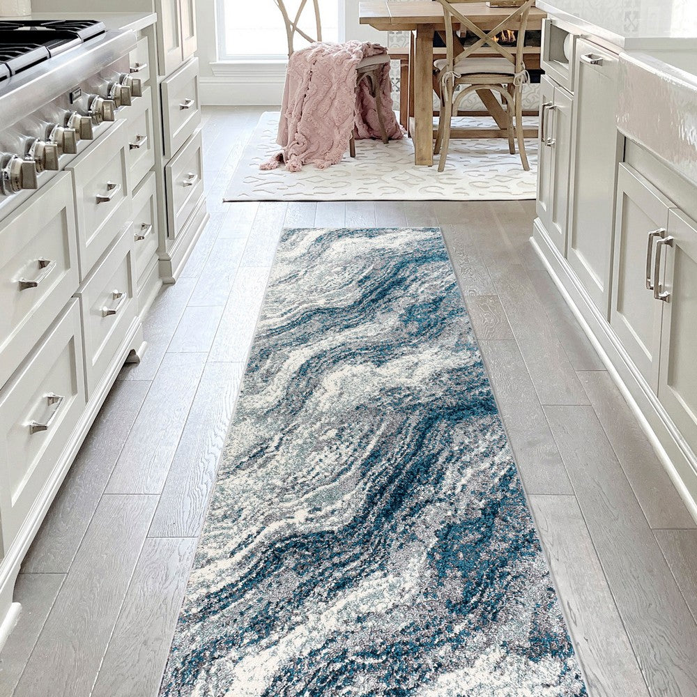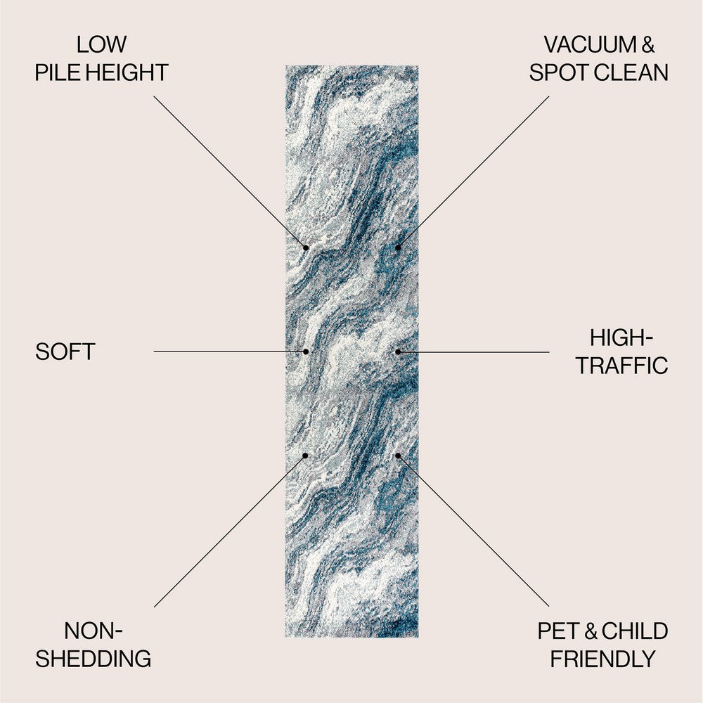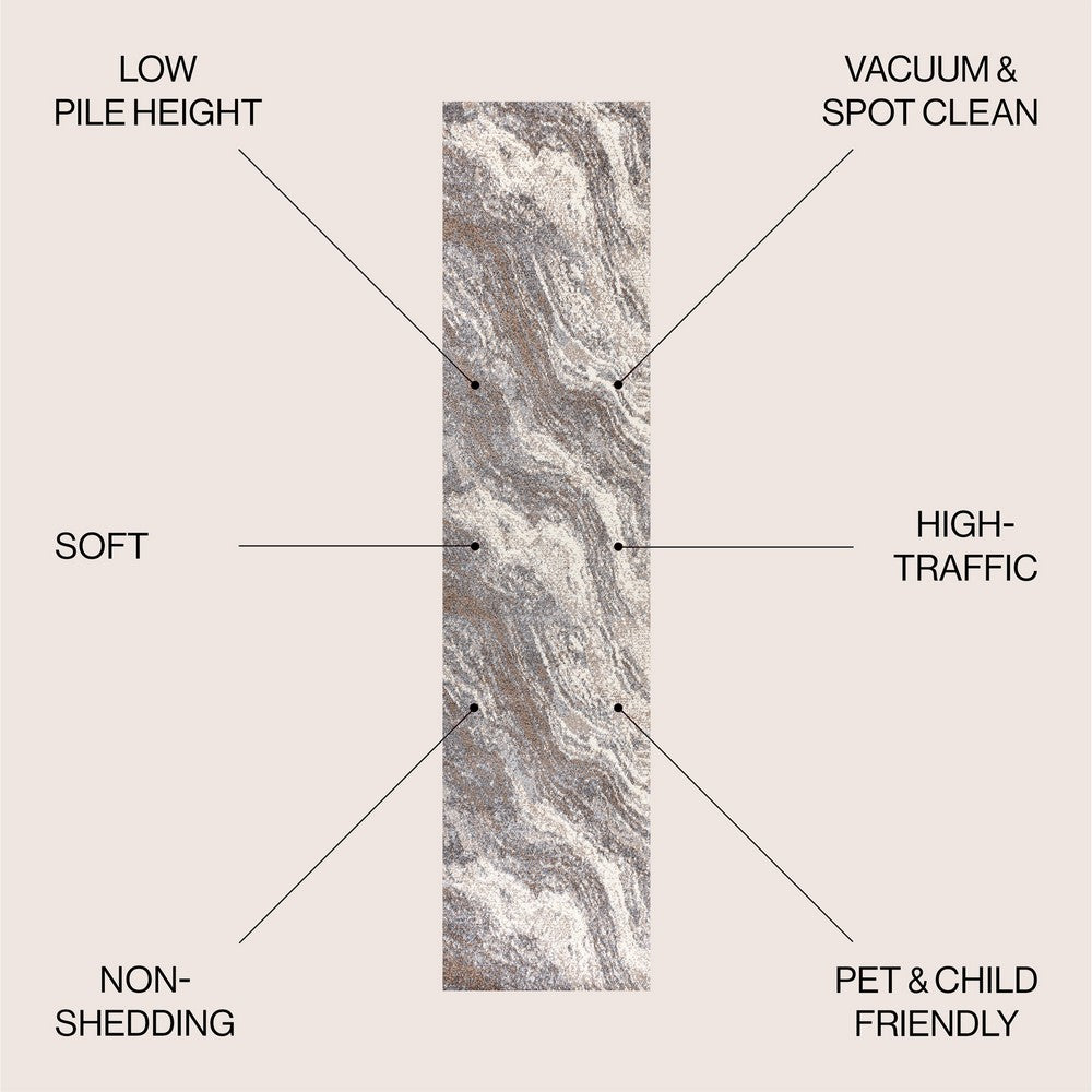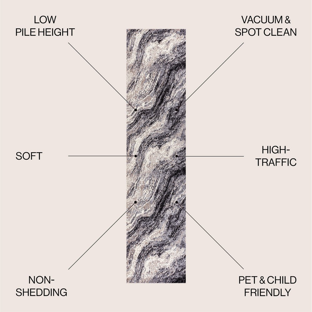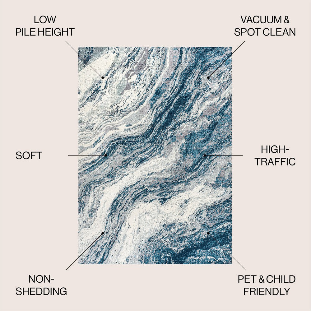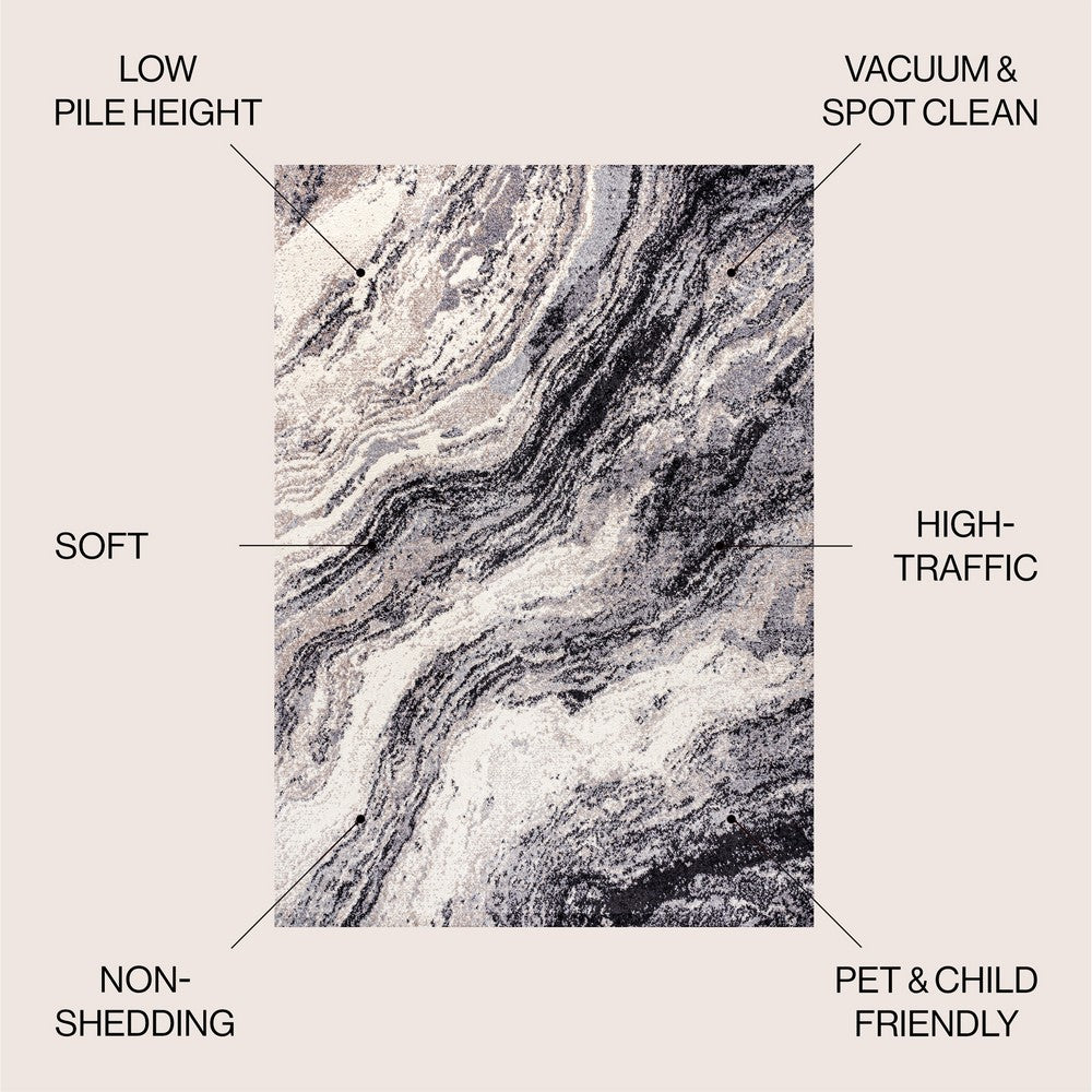 Patterned after natural marble, this rug creates a modern, abstract design on your floor. Soft and durable synthetic fibers and a busy pattern make it perfect for homes with kids and pets. This unique rug is the perfect centerpiece for a contemporary, or industrial interior.