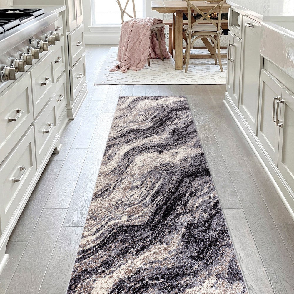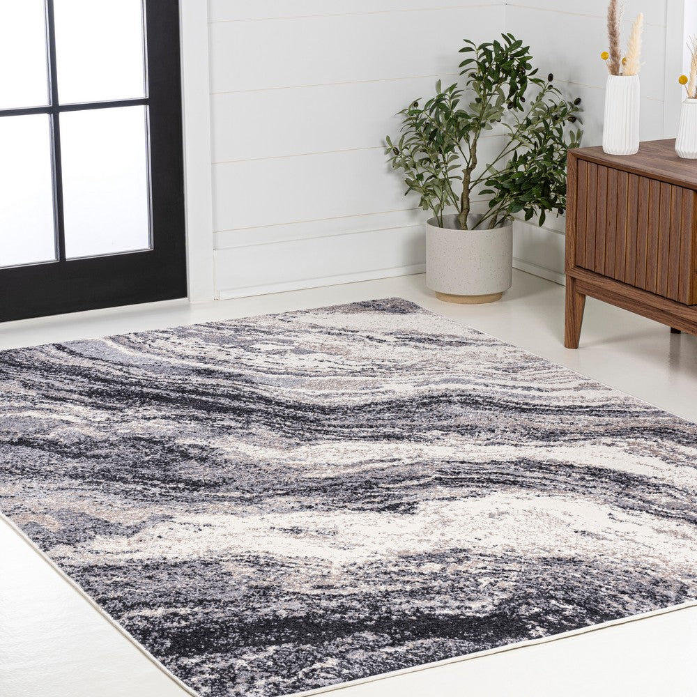 - Deep charcoal against a soft gray and cream background gives this modern rug a marbled look