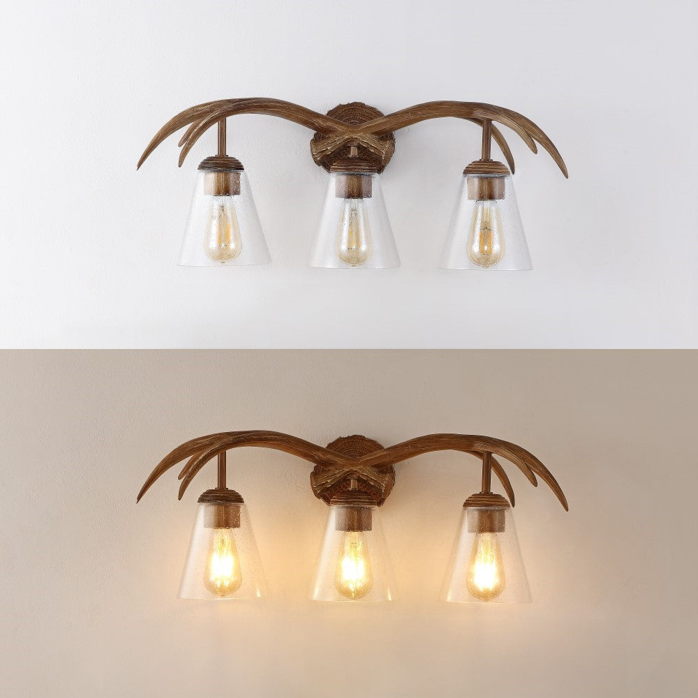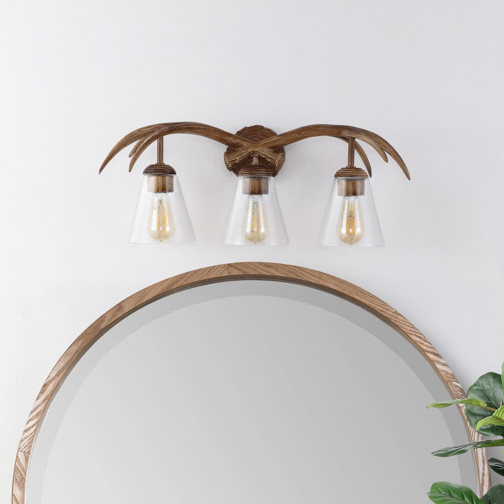 Realistic faux antlers give this farmhouse-inspired wall light its rugged look. Flared, clear glass shades add a traditional touch. Whether your style is Scandinavian or mountain modern, this antler light is a stylish addition to your bathroom vanity or kitchen.