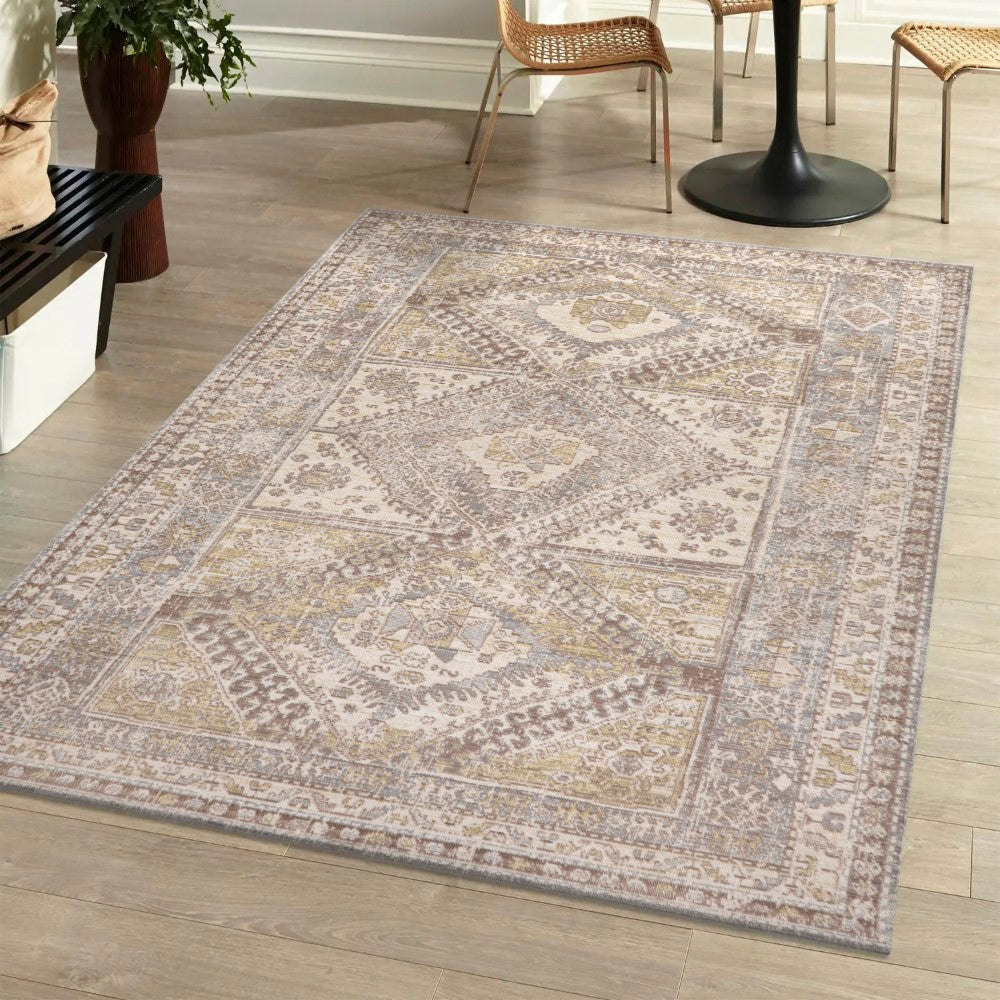 - Mingled shades of gray and gray-brown with sand and ivory create a distressed effect in the geometric design
