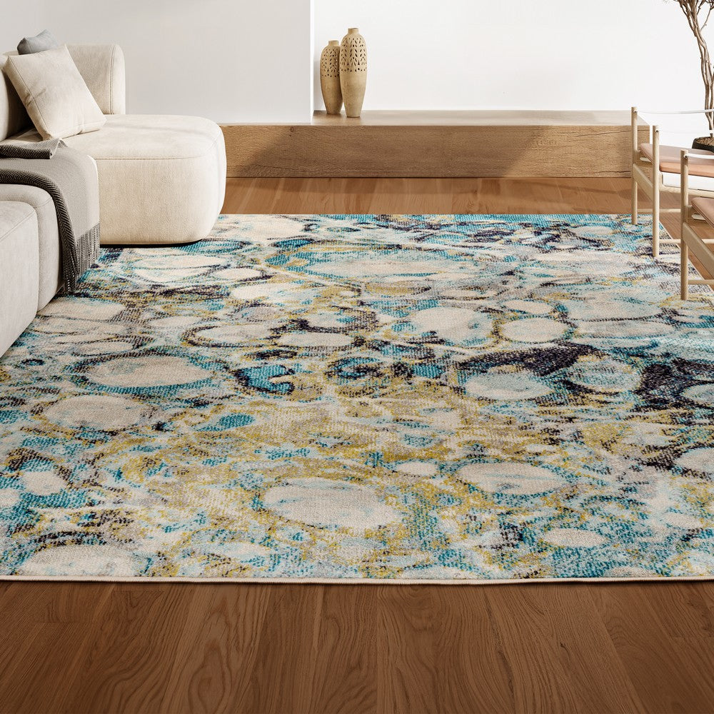 Inspired by the colorful abstract designs of marbled papers, this bold rug has a modern, coastal vibe. Deep blue and accents of gold swirl around pebble-gray elements. This unique rug's overall pattern makes it perfect for homes with kids and pets. It's the perfect centerpiece for a mid-century modern, contemporary, beach house or minimalist interior.