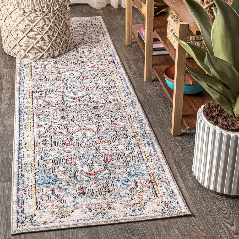 A classic medallion rug design, Maras stands out with its unusual gray color scheme. A central medallion on a mingled ivory and gray background is accented with faded red and turquoise. Varying shades of charcoal and gray create a worn, vintage look.