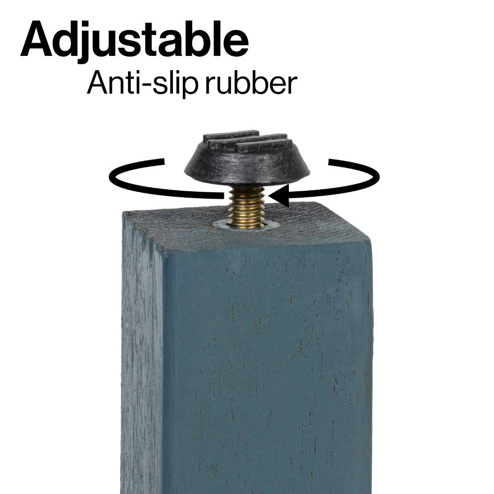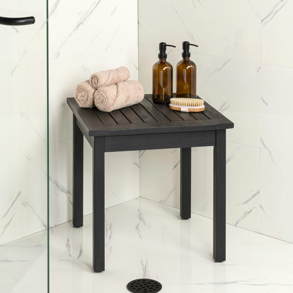 - Traditional slatted design is made from solid acacia wood and finished in black, accented with silver hardware