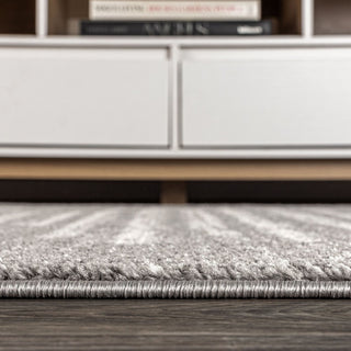 Inspired by vintage Moroccan rugs, our modern striped rug is power-loomed with a short pile. The central stripe pattern is woven in gray on an ivory background; the mingled threads recall traditional handwoven rugs. Add some Bohemian style to your home with this easy-care rug.