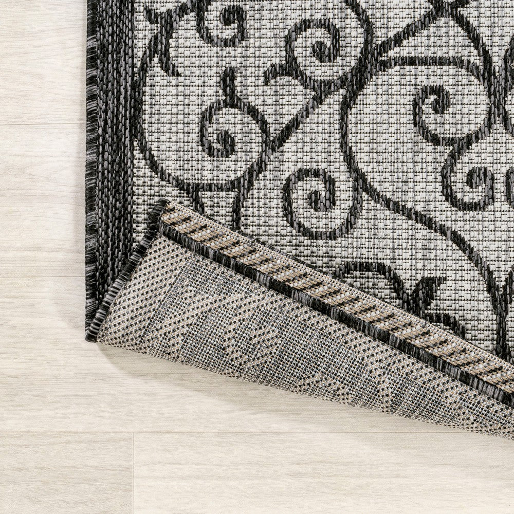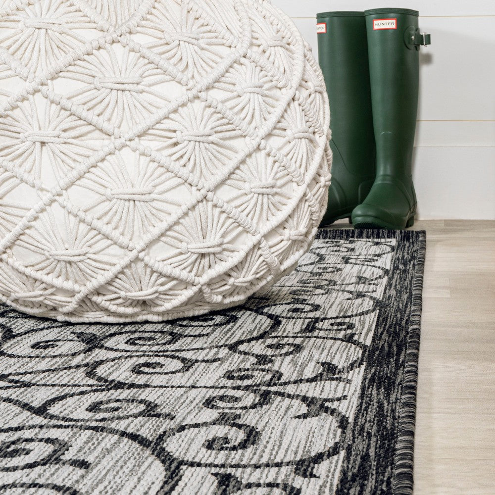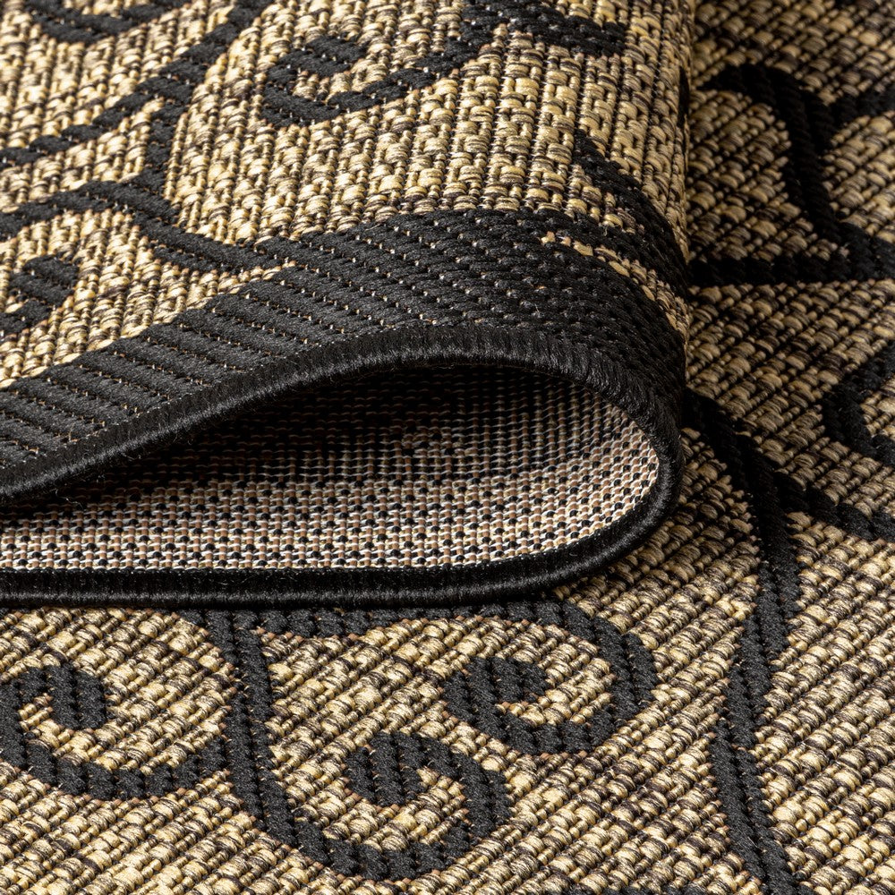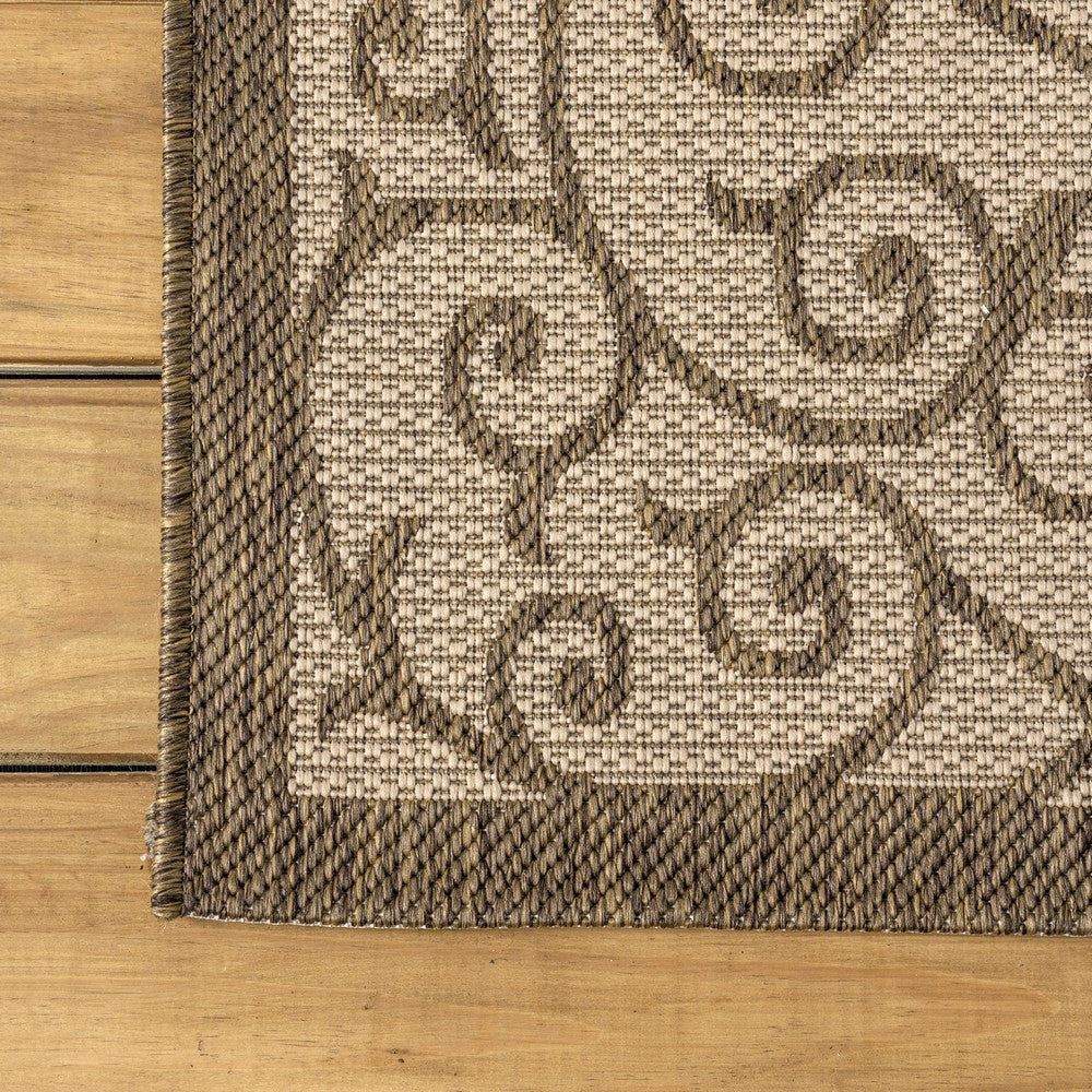 With its filigree design inspired by Spanish wrought iron, our Boho-chic rug adds eclectic style to an outdoor porch or patio. Varied tones of beige and brown mingled with a black pattern give this rug a hand-woven, vintage vibe. The flatweave design is great for high-traffic spaces indoors too.