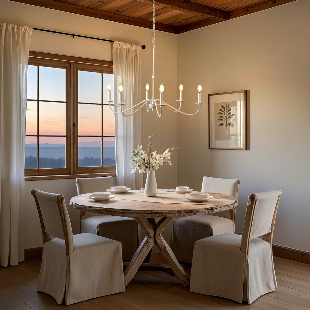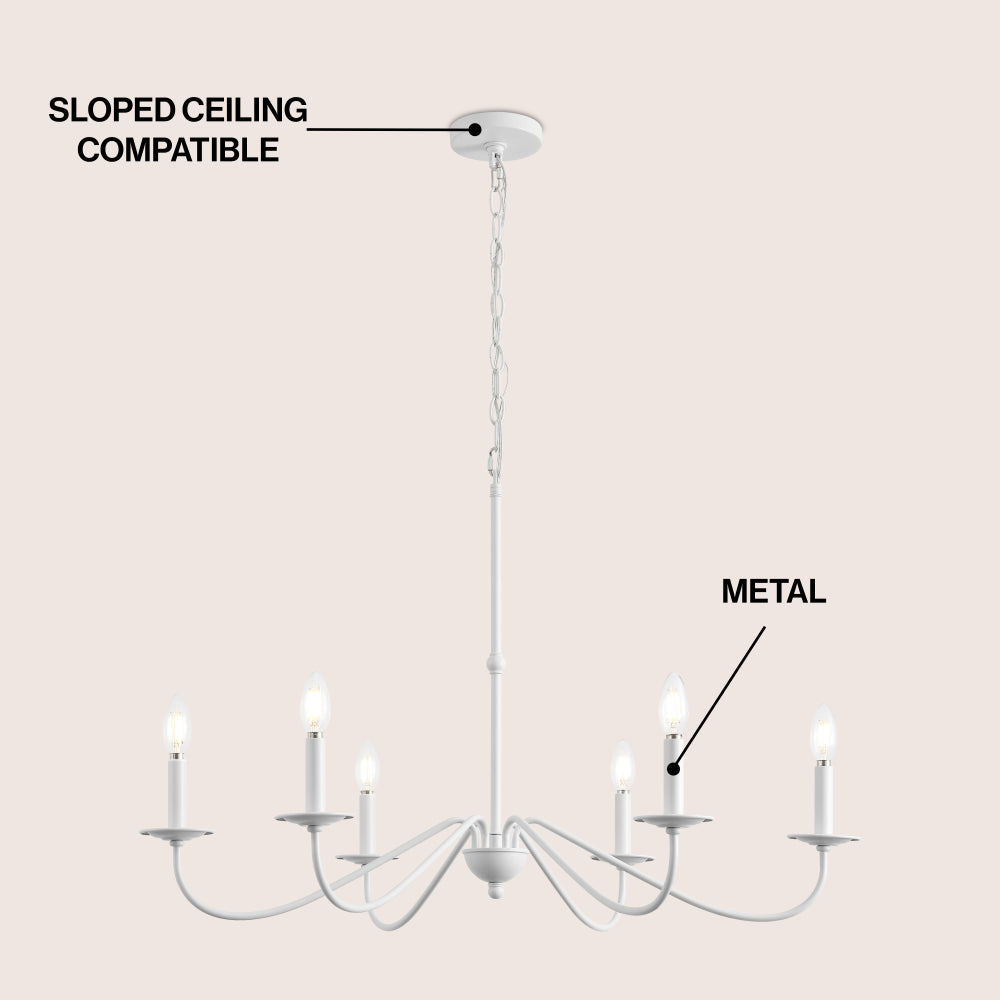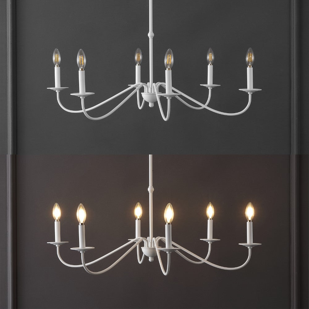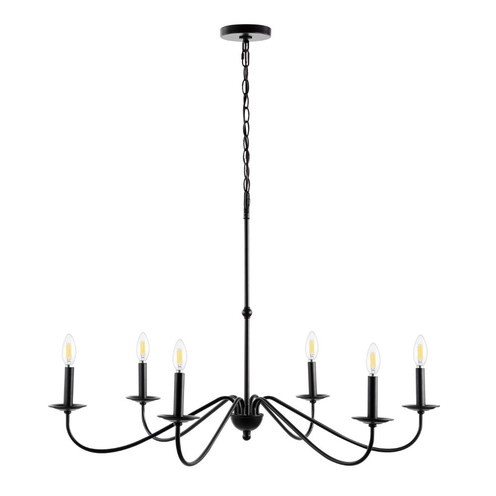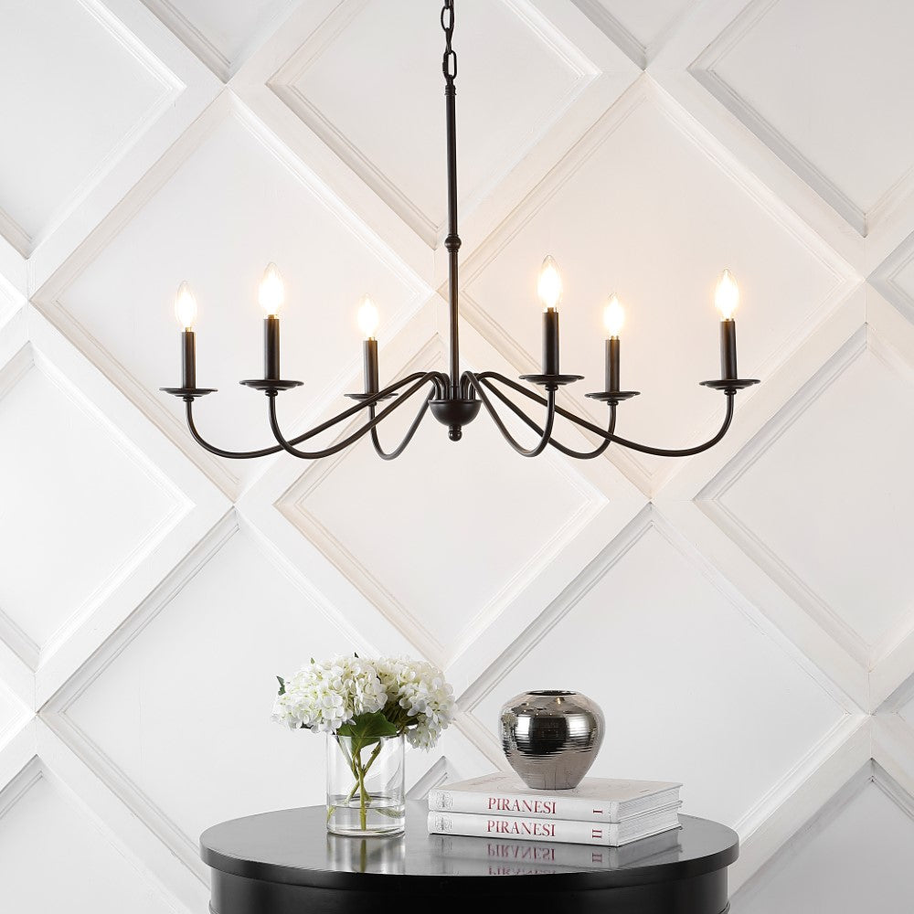 Based on historic wrought iron chandeliers, our rustic 6-light design features a quality finish. Perfectly sized for a farmhouse dining room, tall entry, or great room with high ceilings, our chandelier is just under 35" wide and features tall candles with LED candle bulbs. Use this versatile chandelier in a modern farmhouse, French country or Tuscan style home, or to add character to a rustic, industrial space.