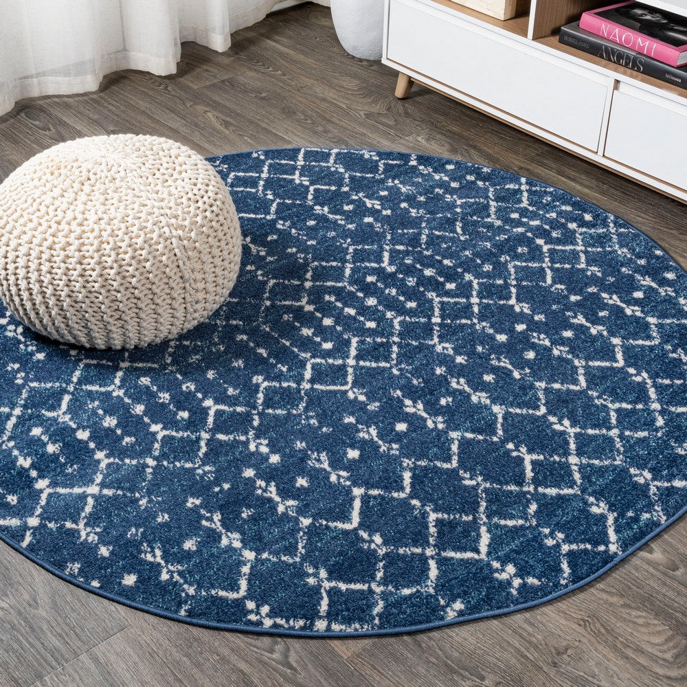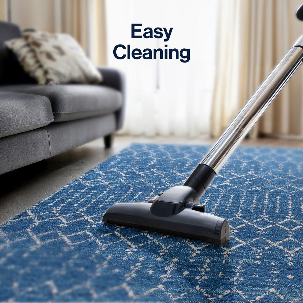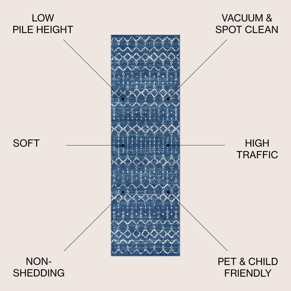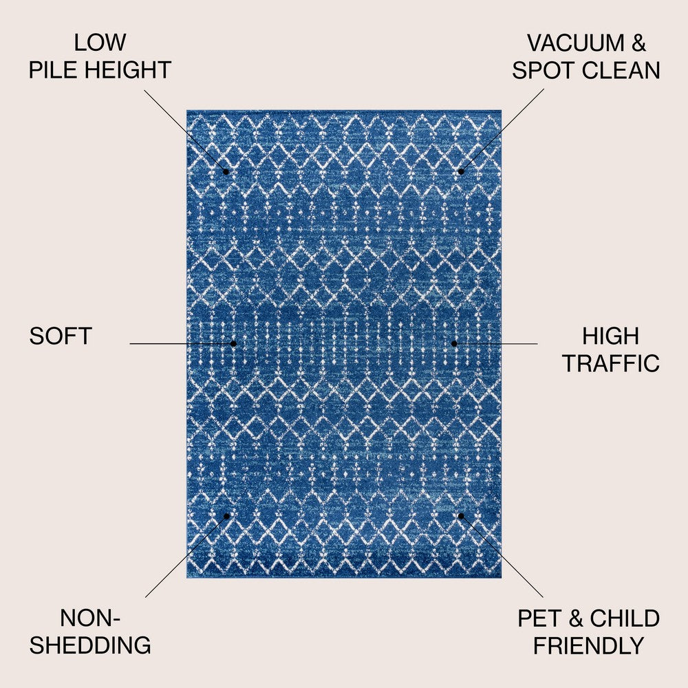 In shades of indigo and ivory, this Moroccan trellis is Inspired by timeless vintage designs and crafted with the softest polypropylene available. Originating with the Berber tribes of North Africa, this beautiful linear pattern is made modern in a deep navy yarn power loomed for durability. The simple geometric stripes, triangle and diamond motifs will give a fresh look to any room.
