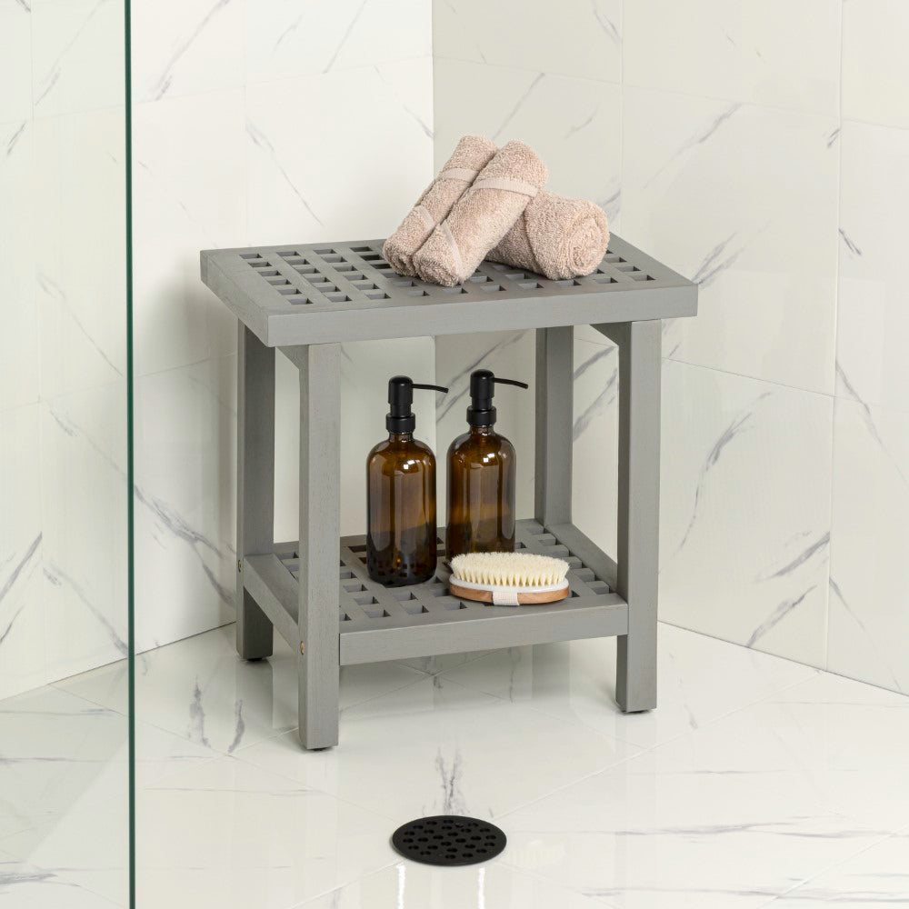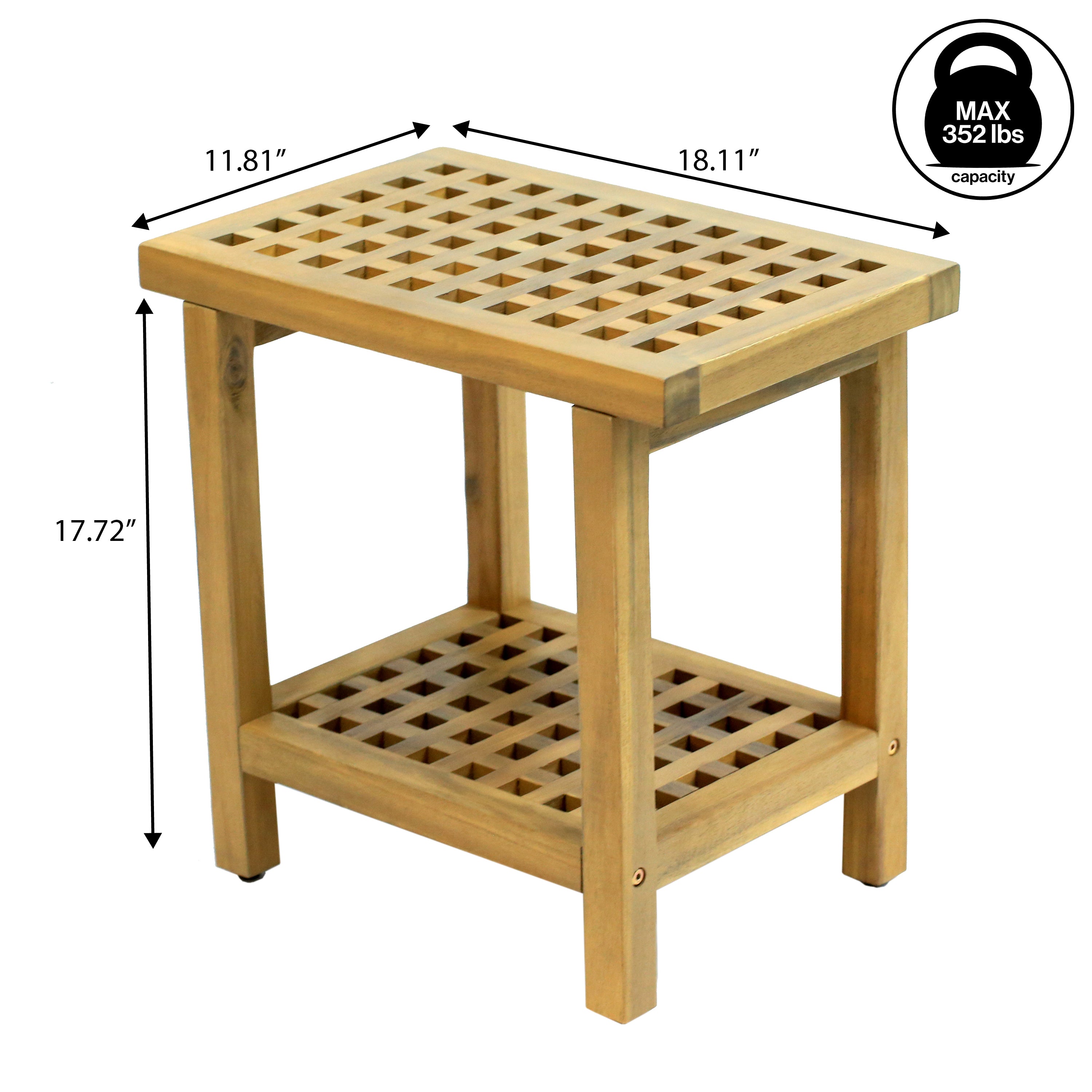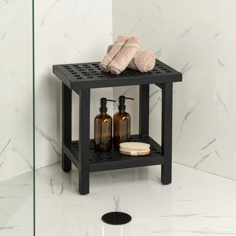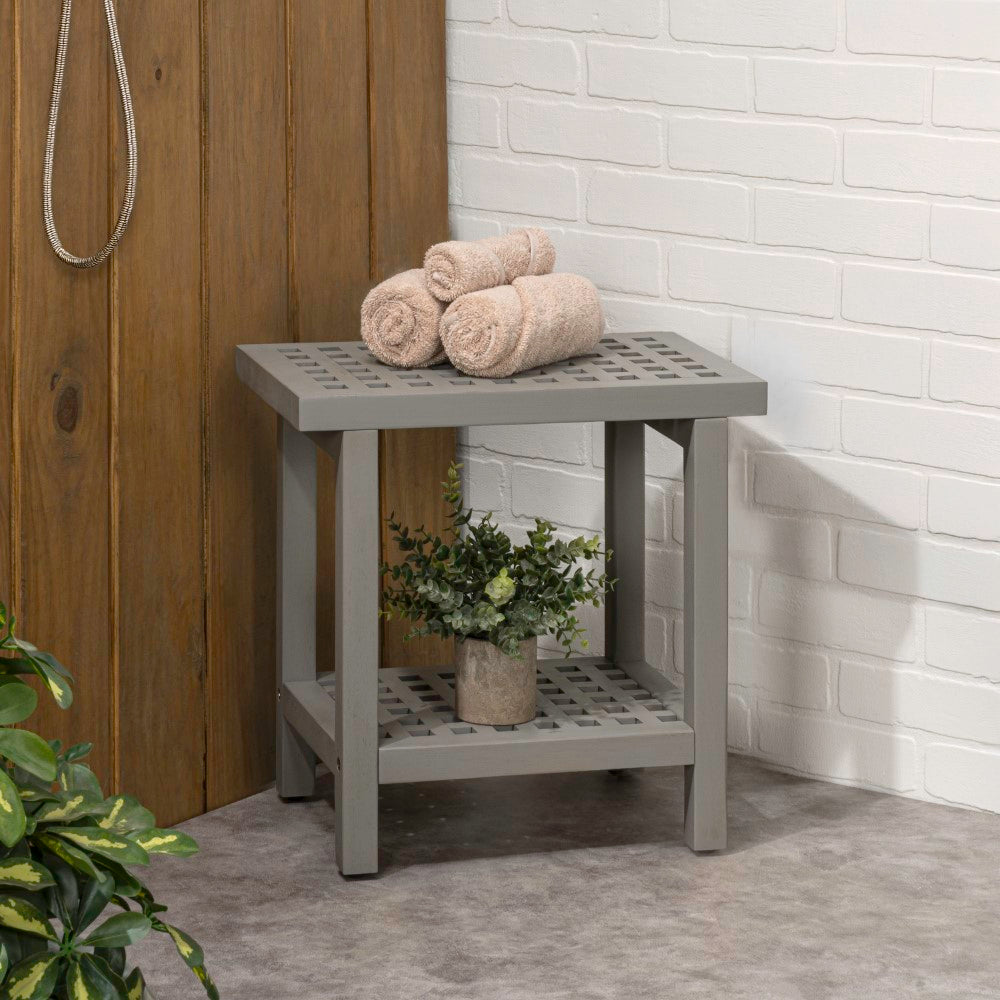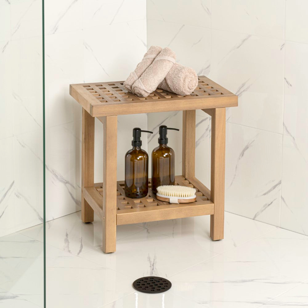 This classic spa stool fits in a walk-in shower and doubles as extra seating or a stylish display for towels, books, or décor, with an elegant design that elevates any space. The modern geometric design features a slatted grid and lower shelf; made from water-resistant acacia wood, the stool has a protective oil-stain finish. This timeless shower stool adds comfortable seating and storage to your bathroom or bedroom.