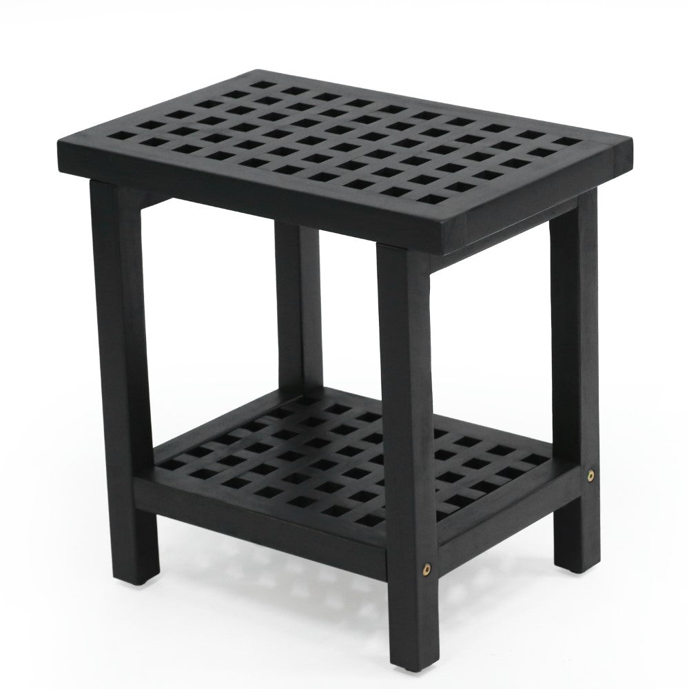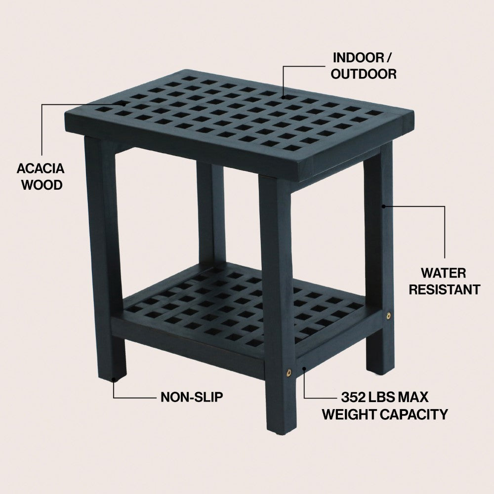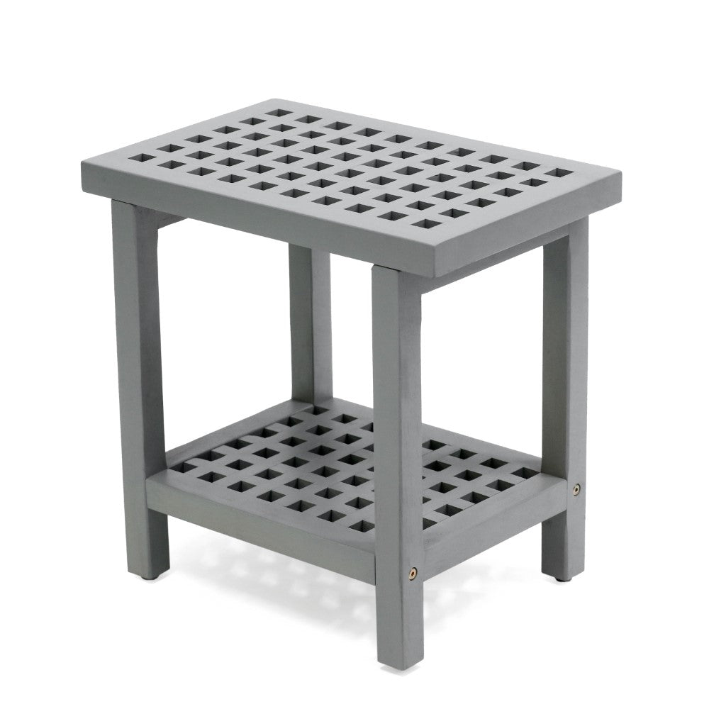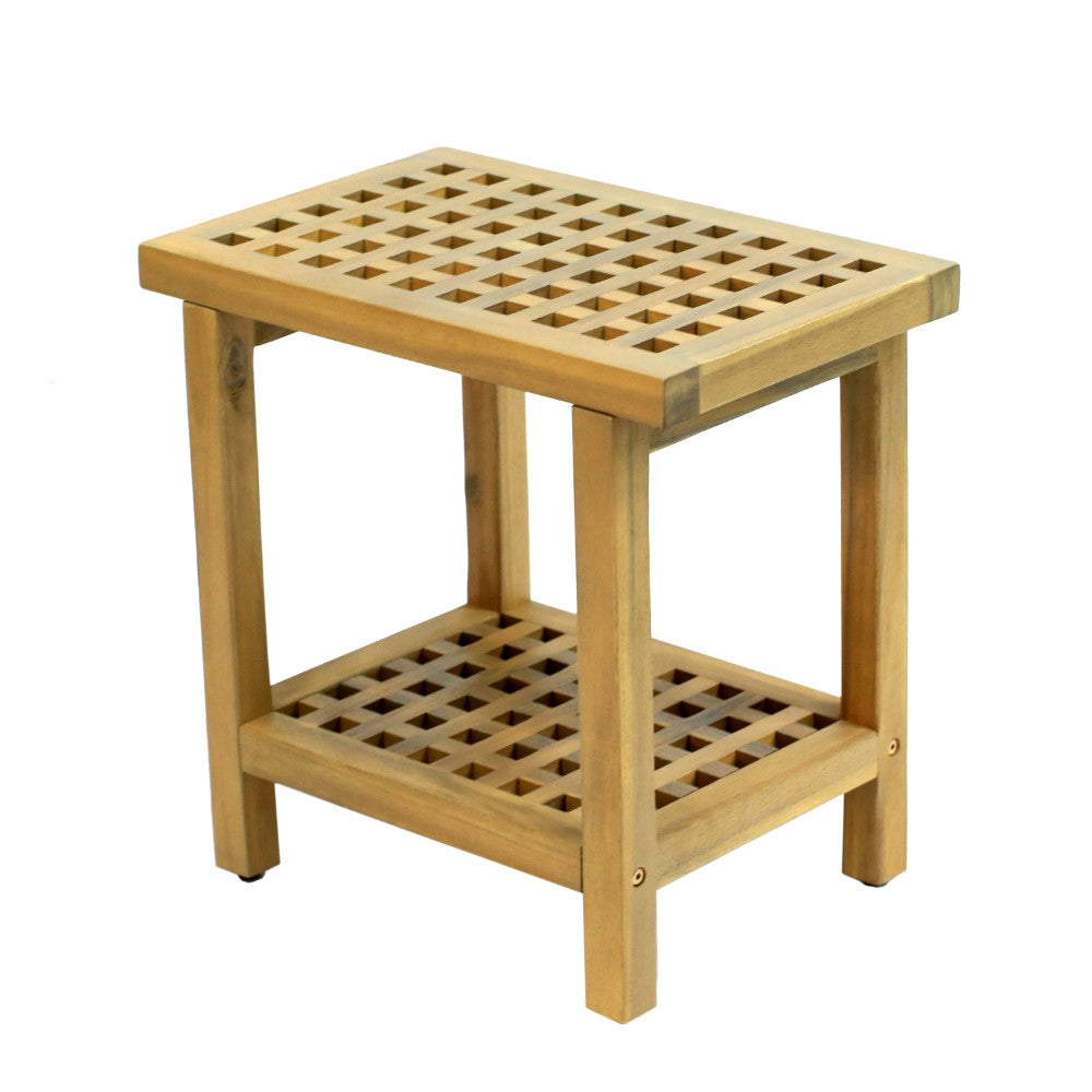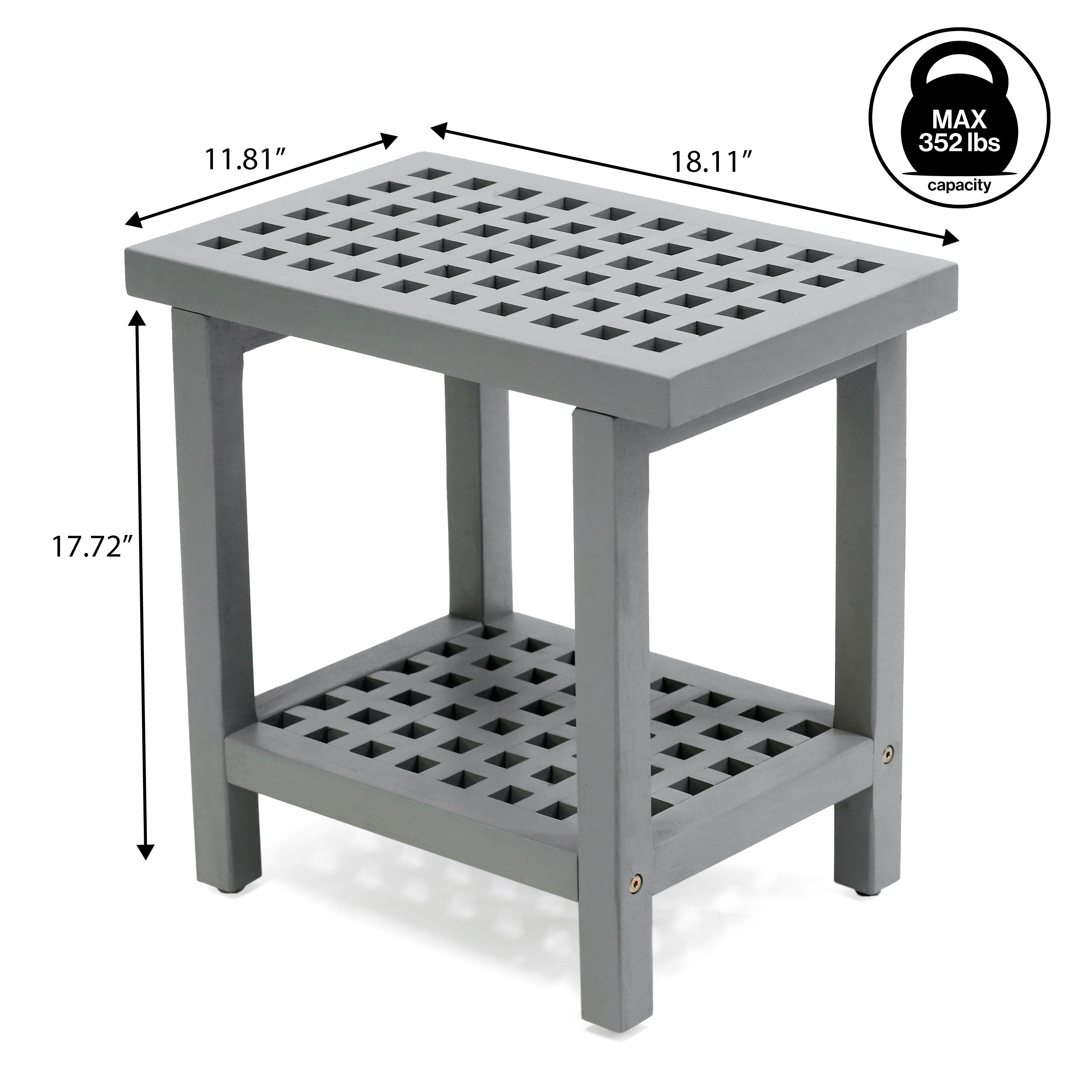 This classic spa stool fits in a walk-in shower and doubles as extra seating or a stylish display for towels, books, or décor, with an elegant design that elevates any space. The modern geometric design features a slatted grid and lower shelf; made from water-resistant acacia wood, the stool has a protective oil-stain finish. This timeless shower stool adds comfortable seating and storage to your bathroom or bedroom.