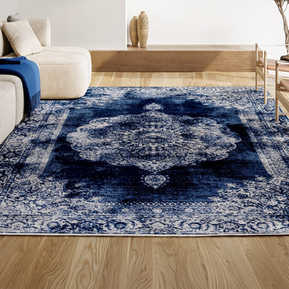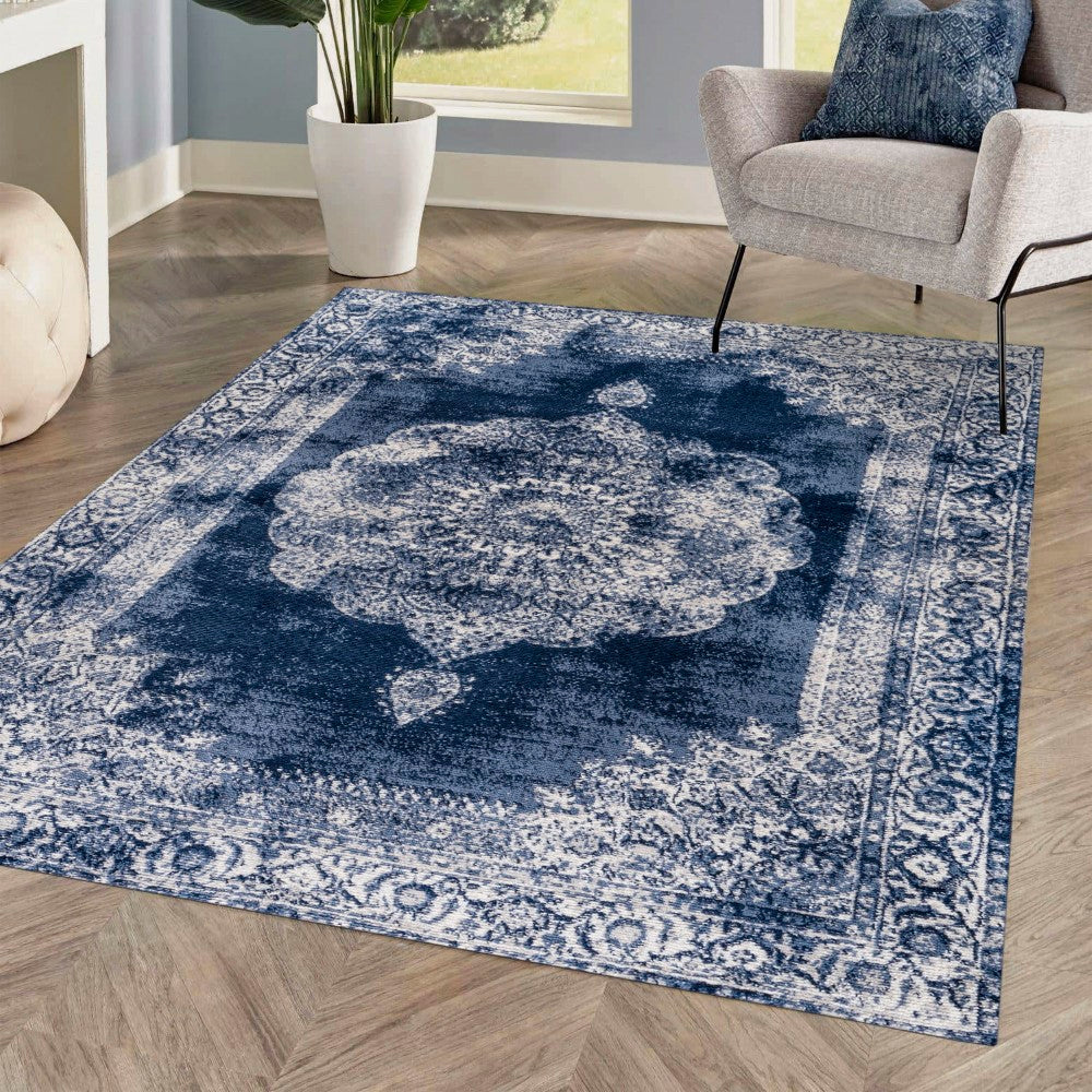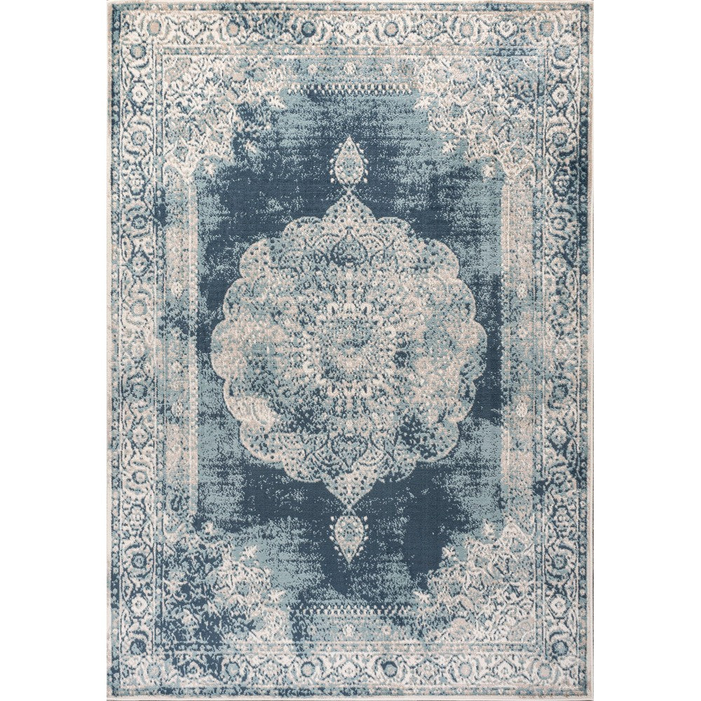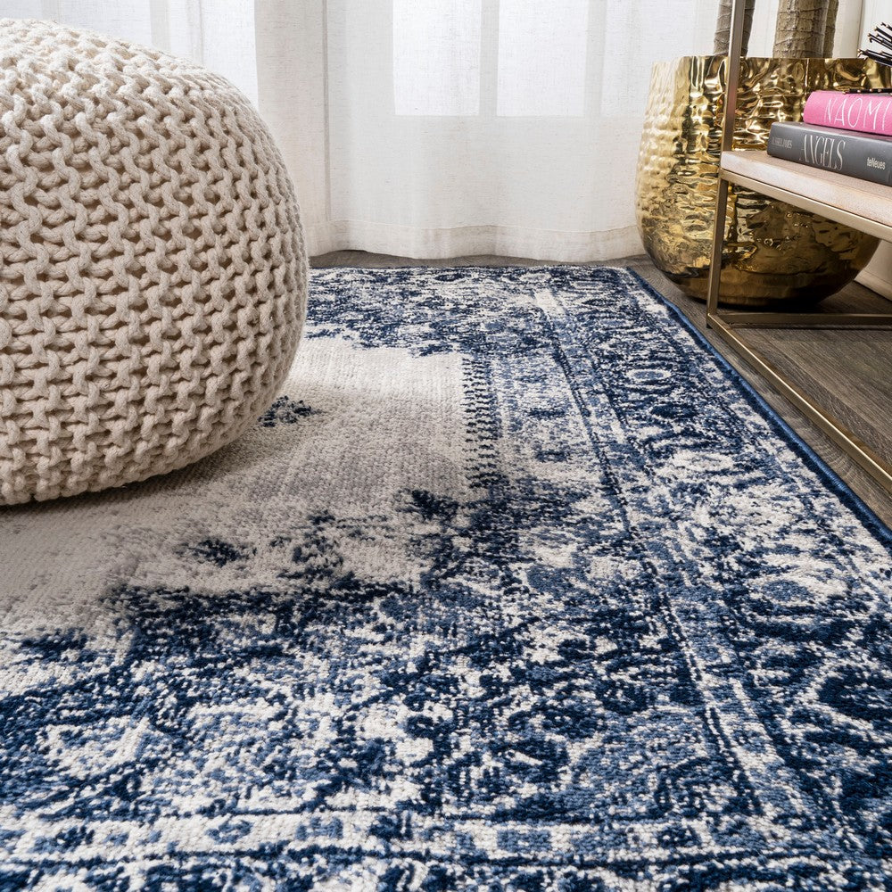 - Mingled denim blue and navy on an ivory background give this rug a vintage texture