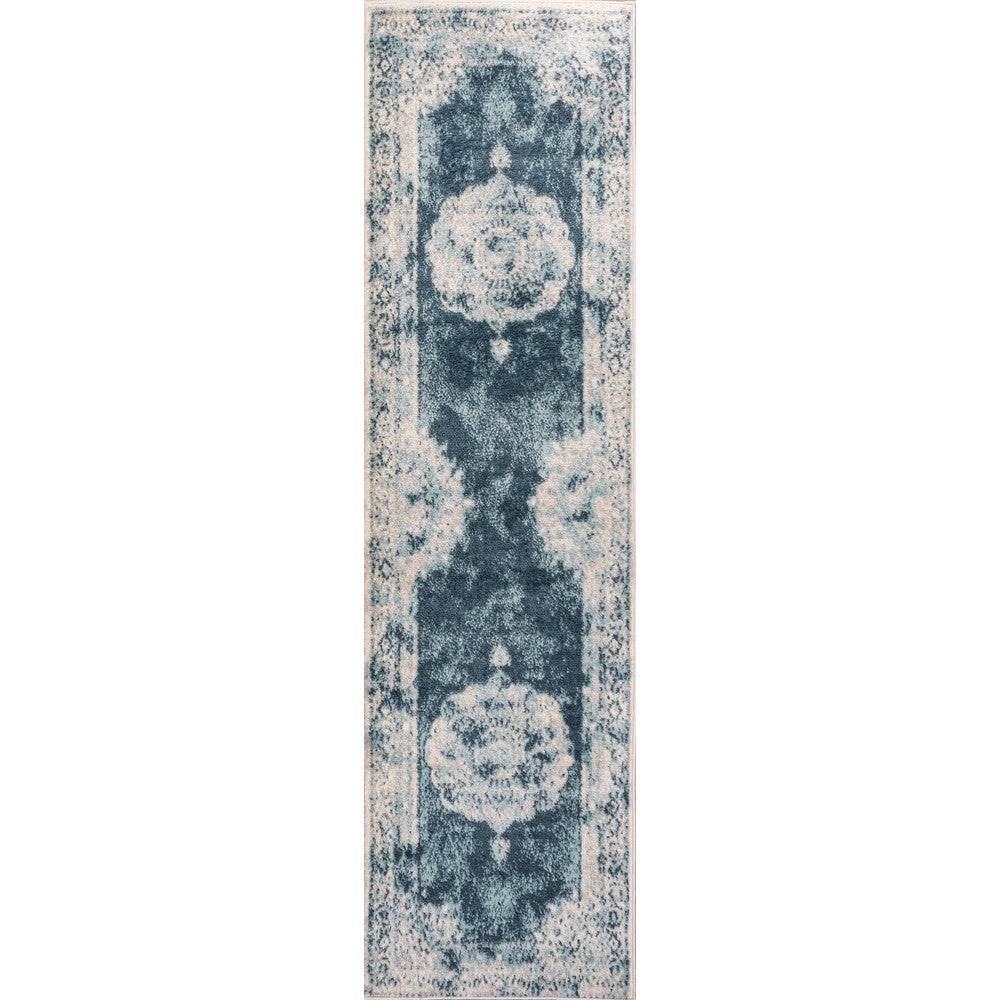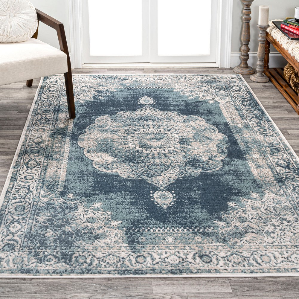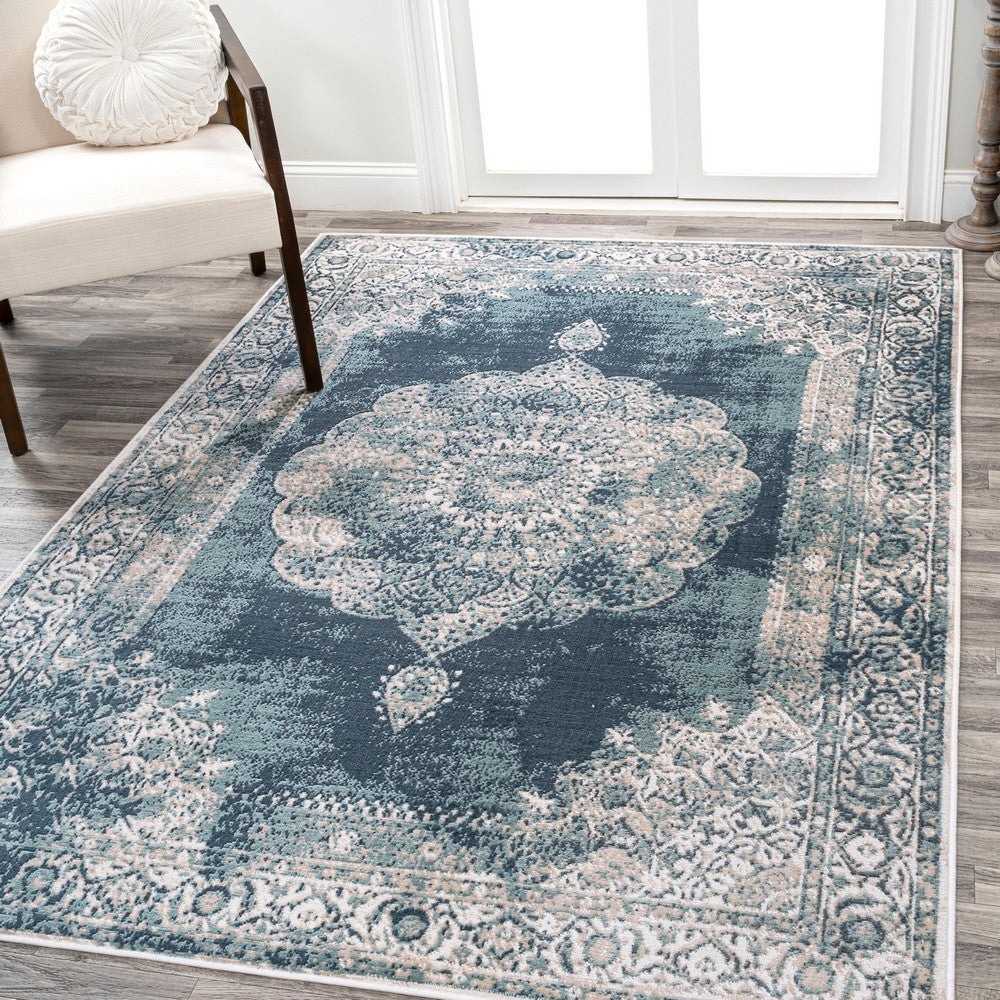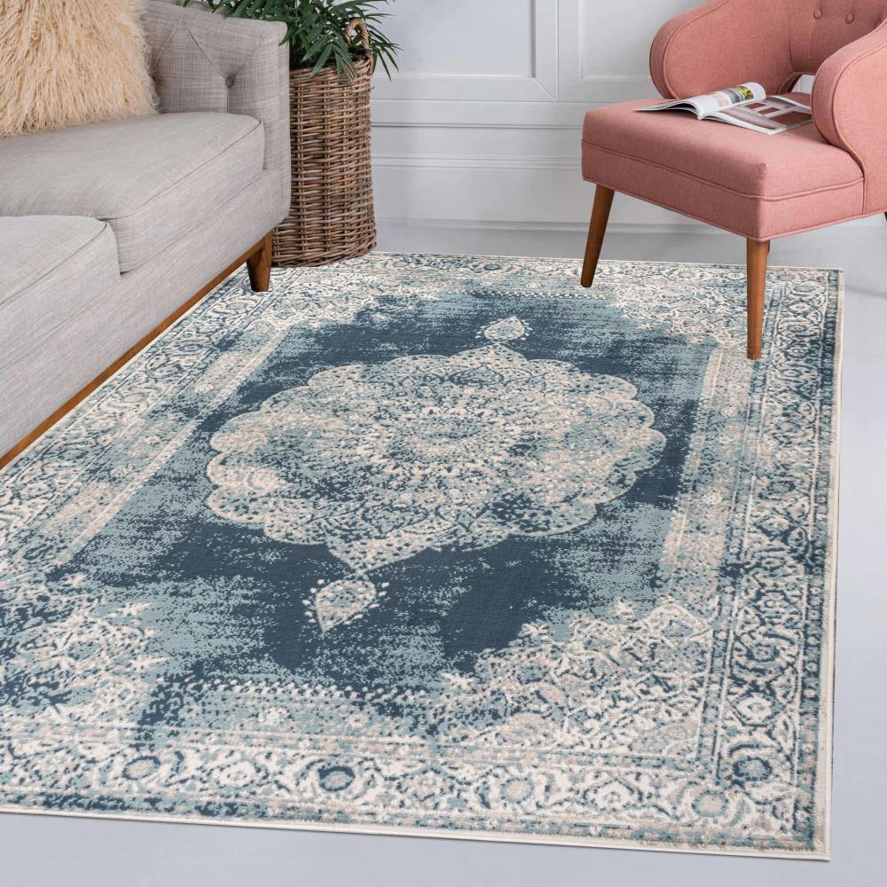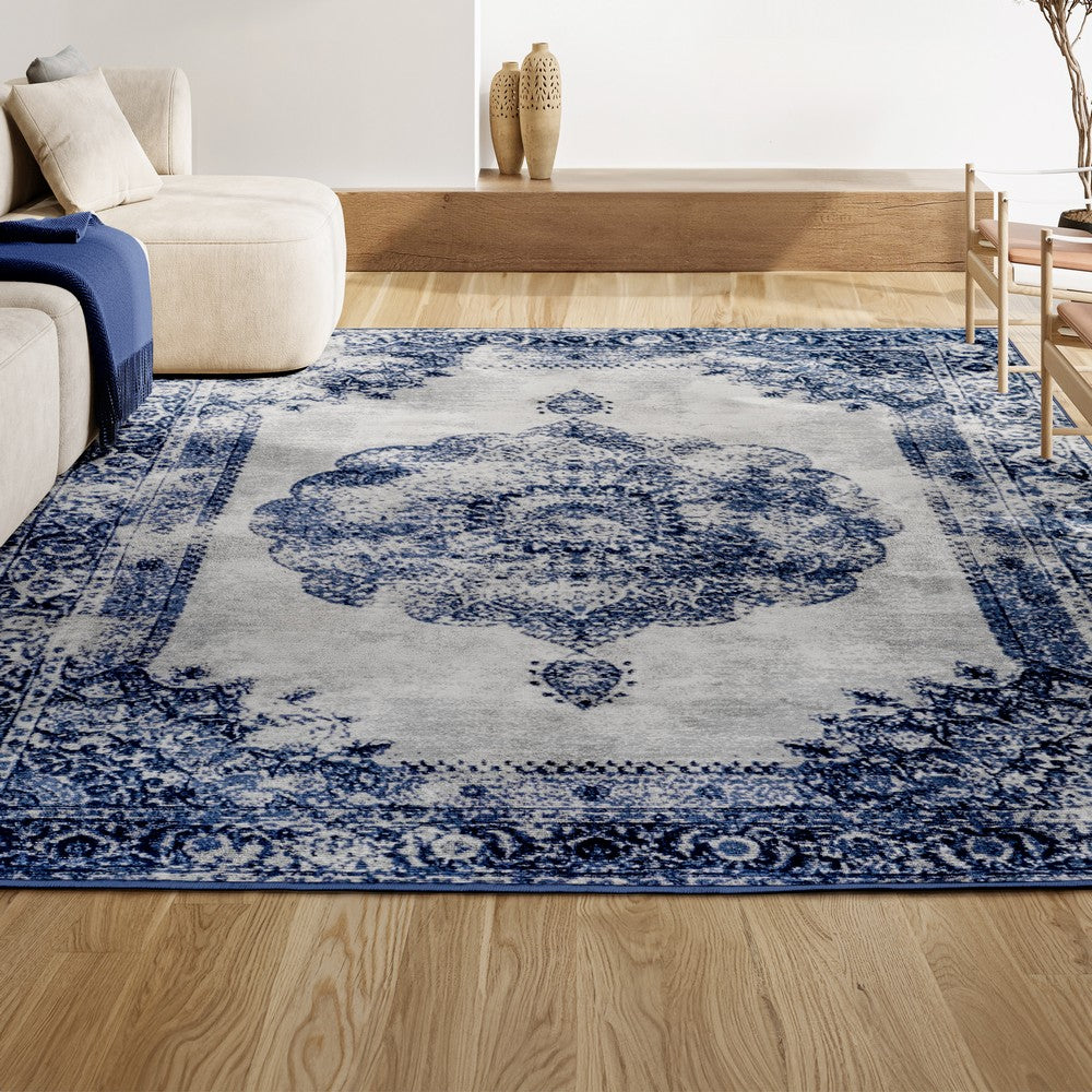 - Mingled denim blue and navy on an ivory background give this rug a vintage texture