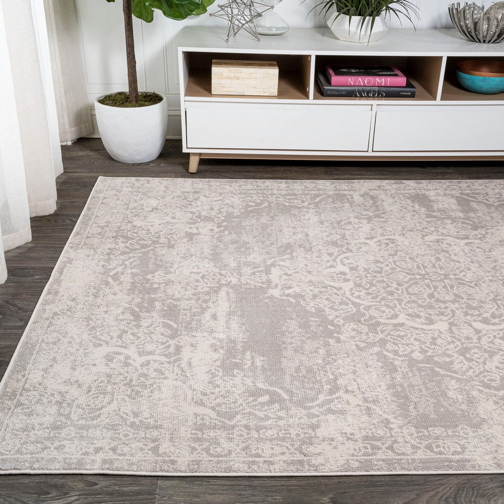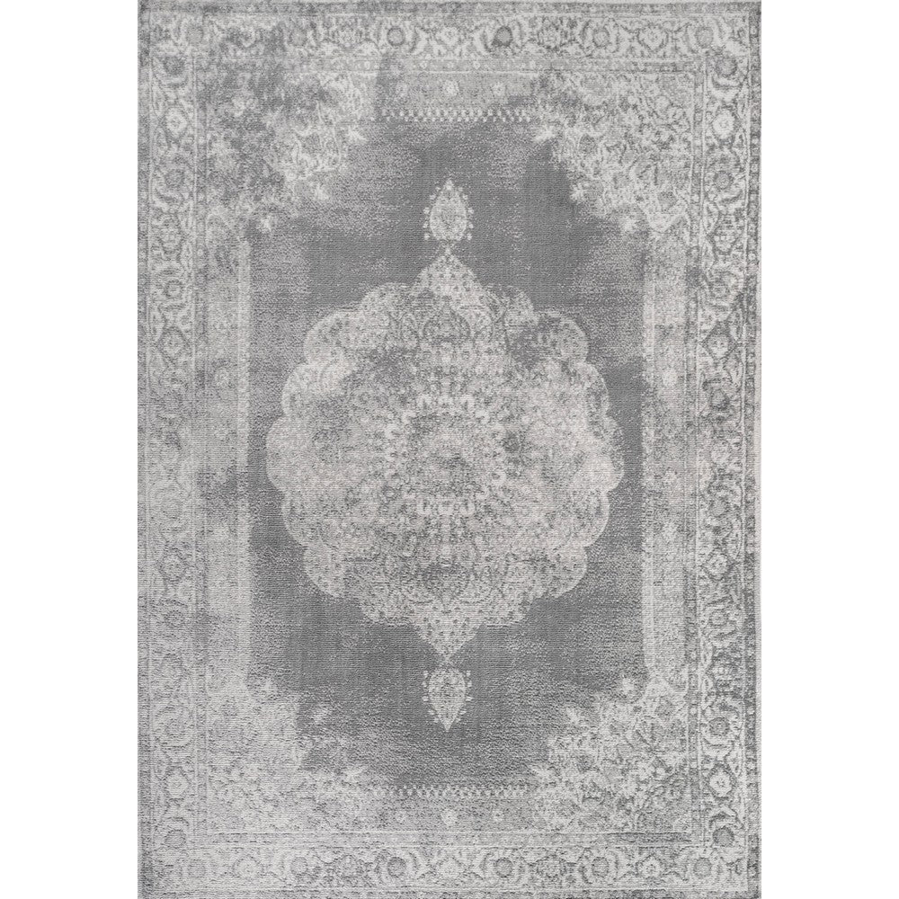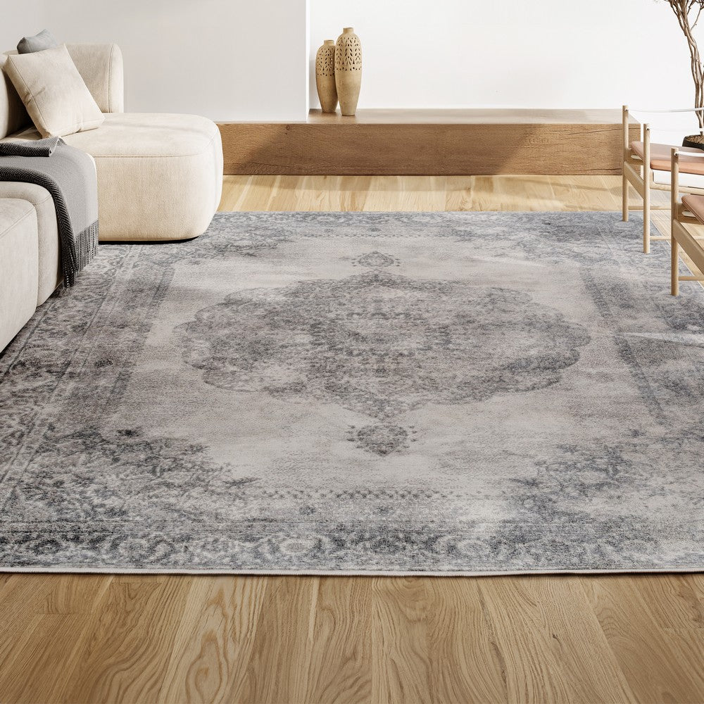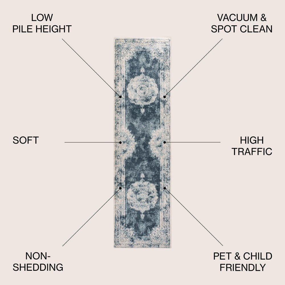 - Mingled denim blue and navy on an ivory background give this rug a vintage texture