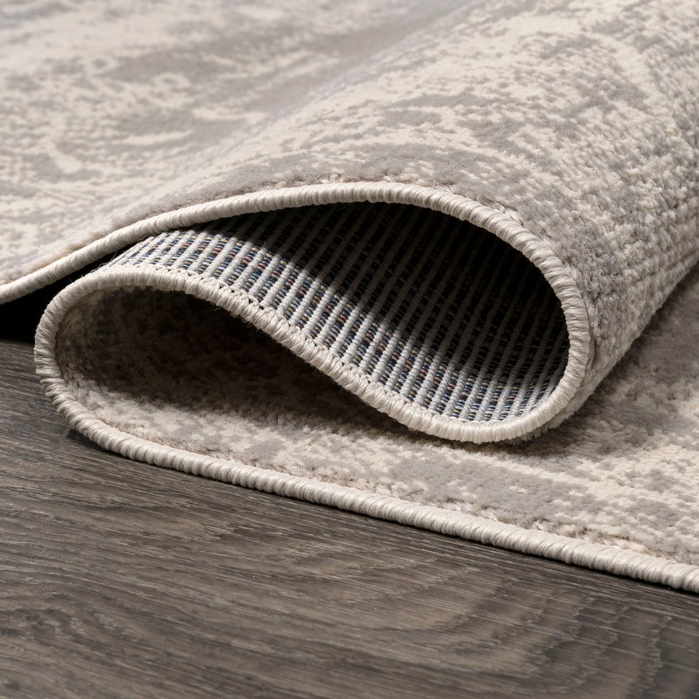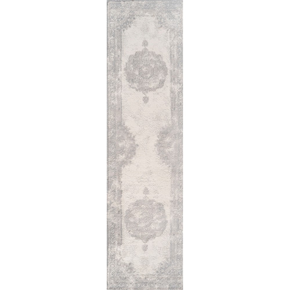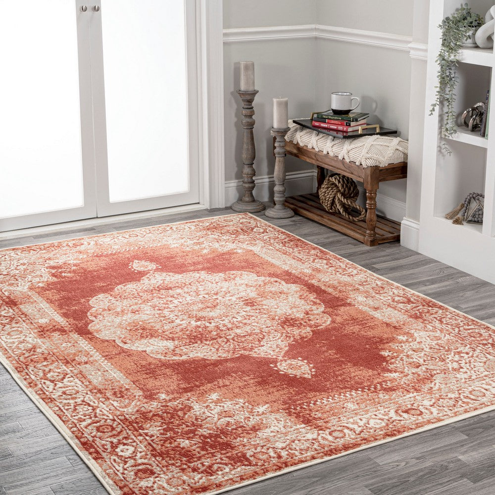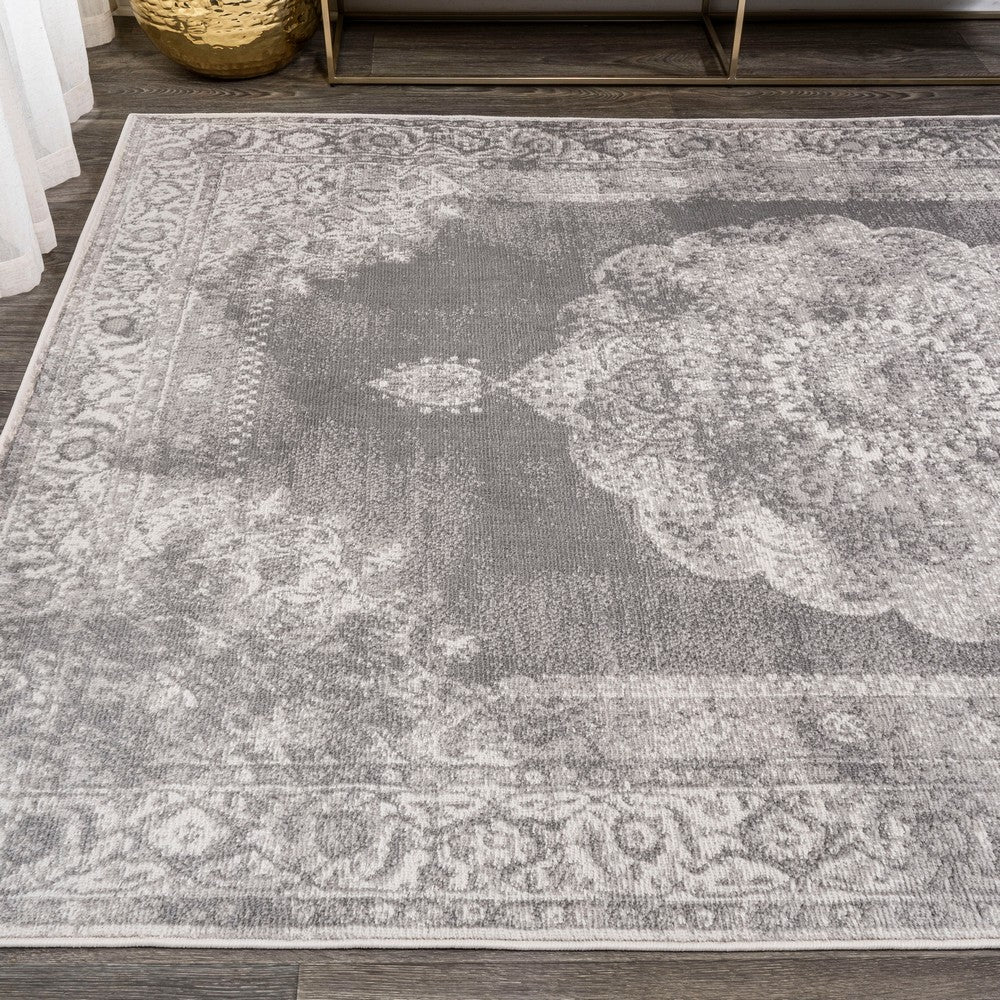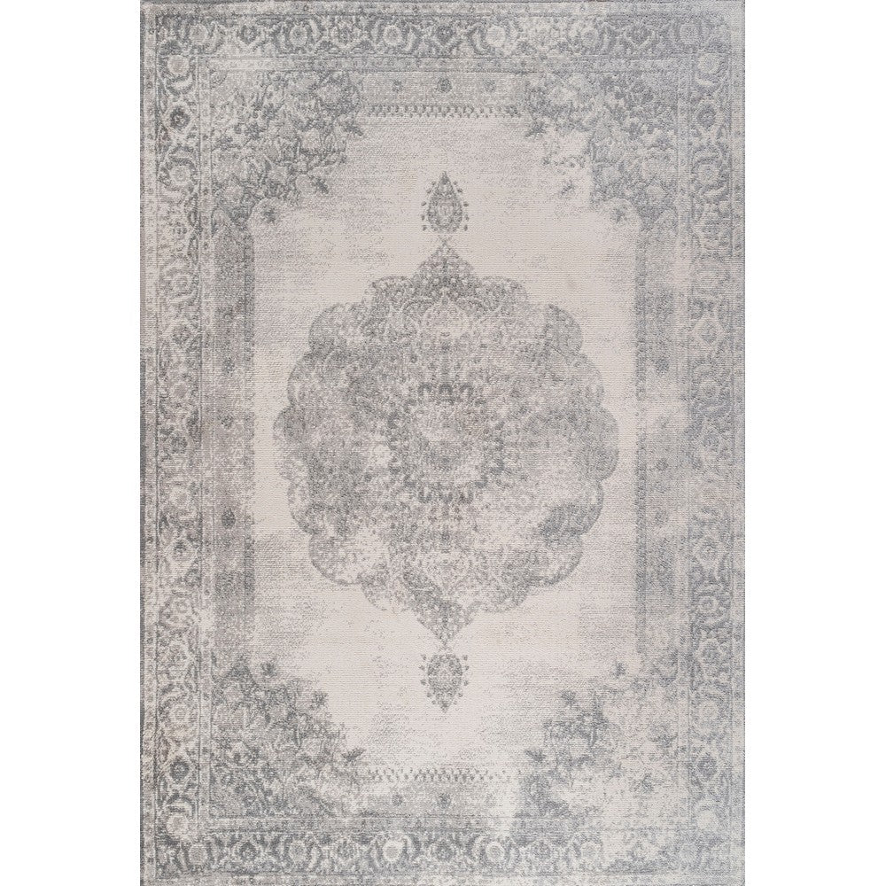 This ornate medallion rug has a scroll and floral pattern, adding modern Bohemian cottage style to a living room, bedroom, entry or kitchen. Varied tones of denim blue on an ivory background give this rug a hand-woven, rustic look. The busy allover pattern is pet-friendly and great for kids too.