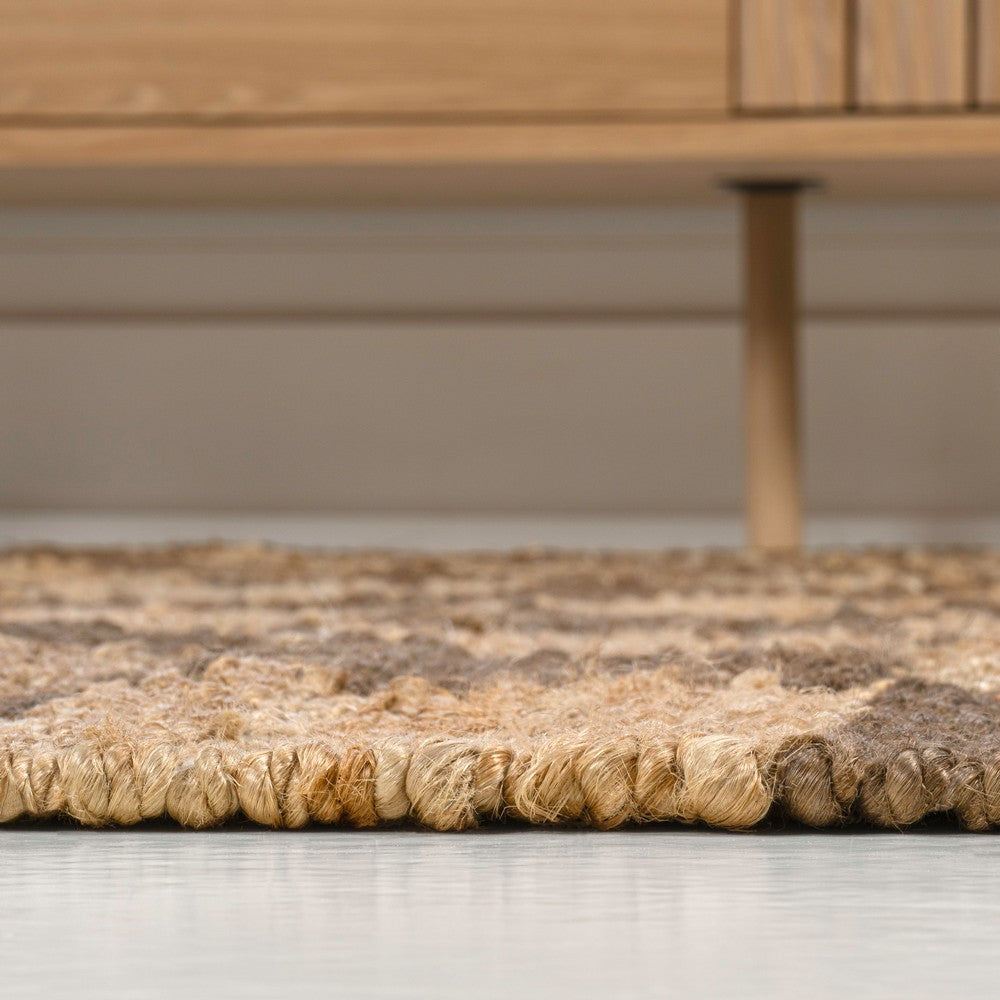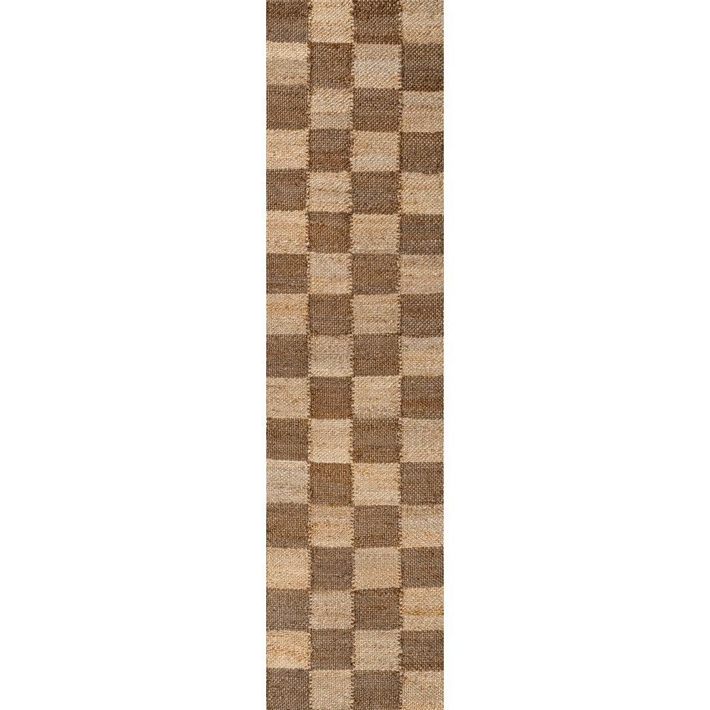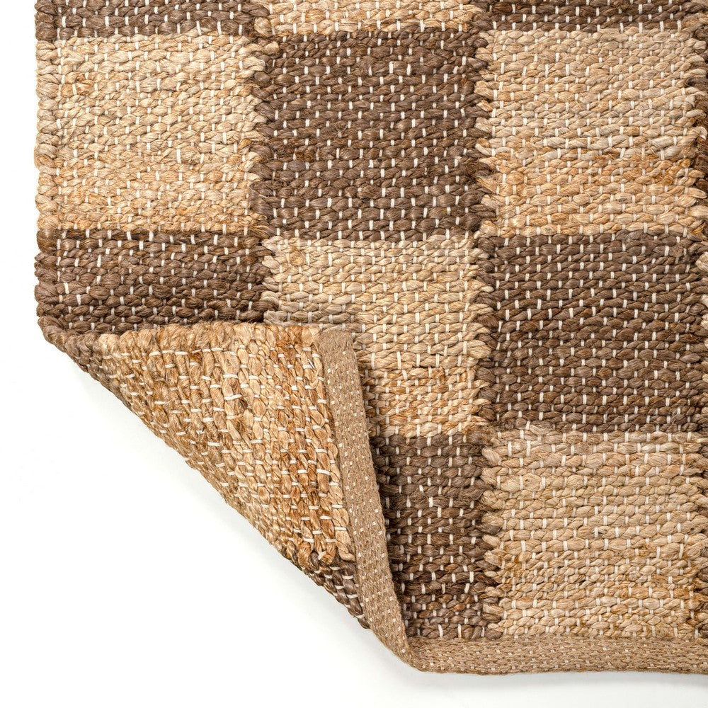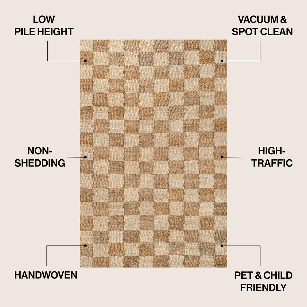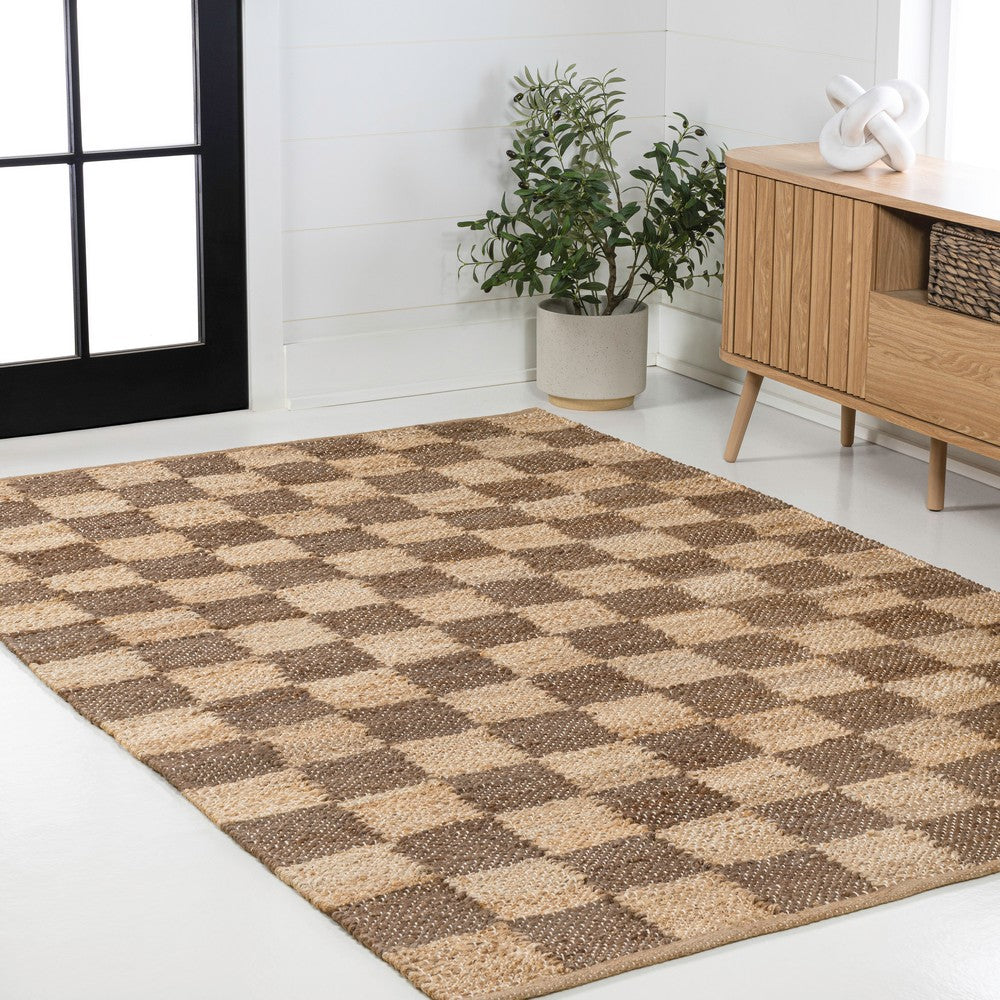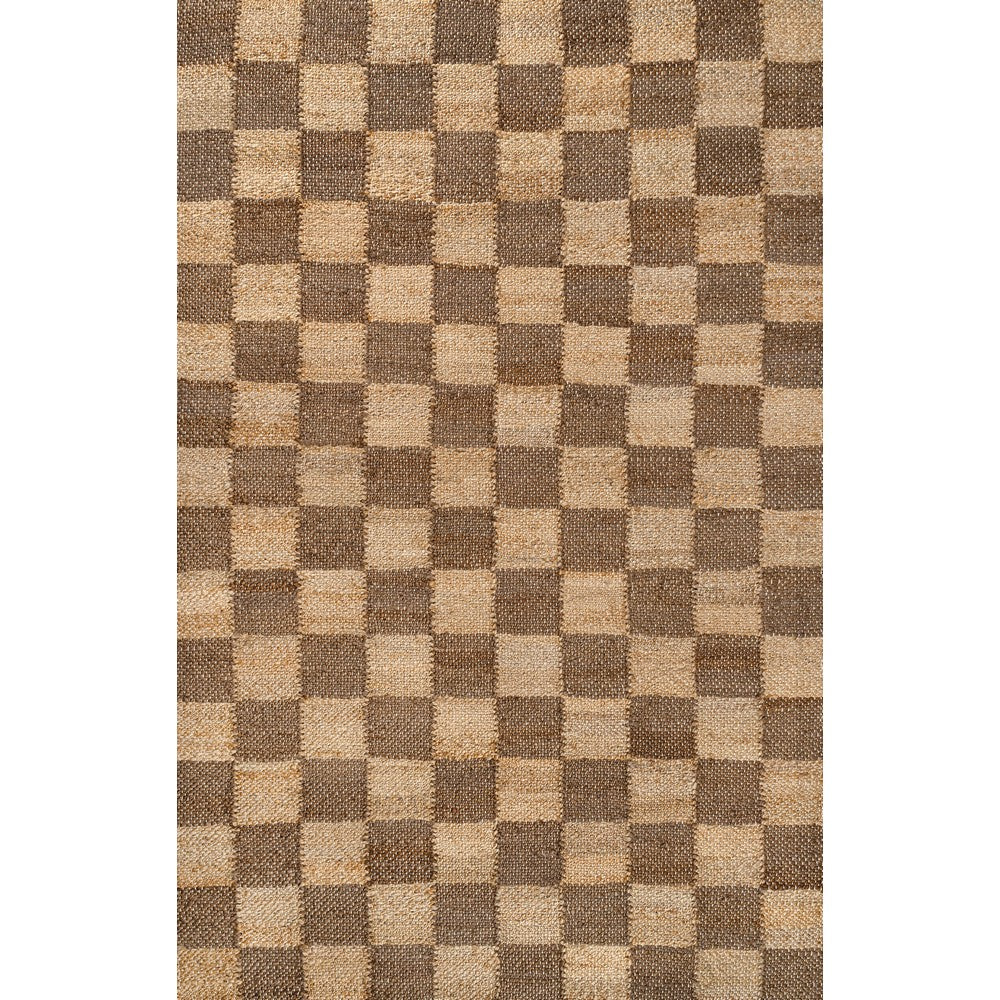 • Modern checkerboard alternates in brown and natural jute shades