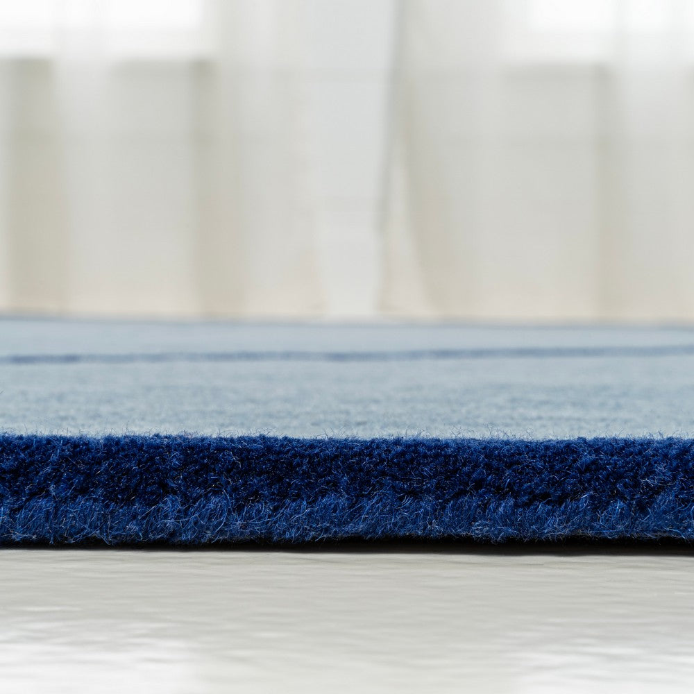 - The rug's light blue base is complemented by a navy border and abstract lines, amplifying its contemporary design